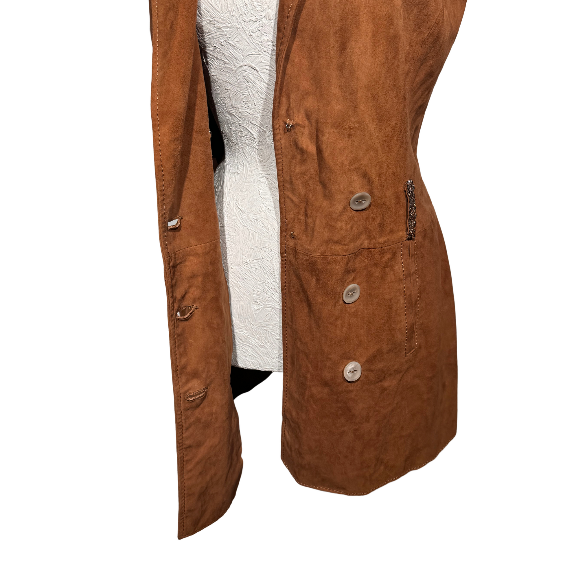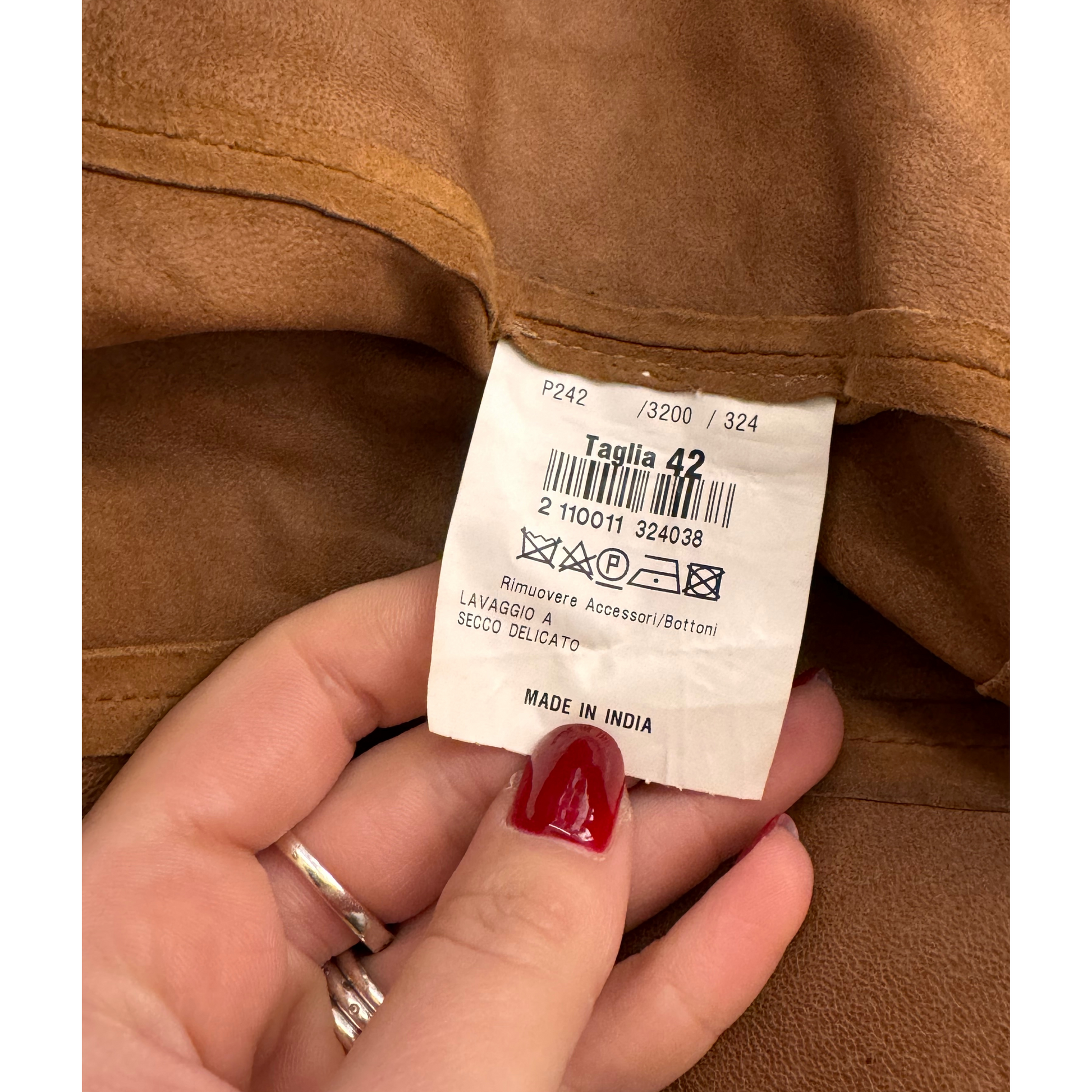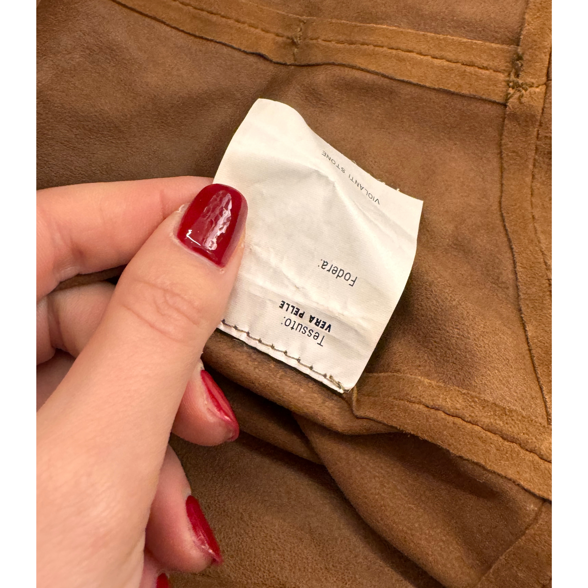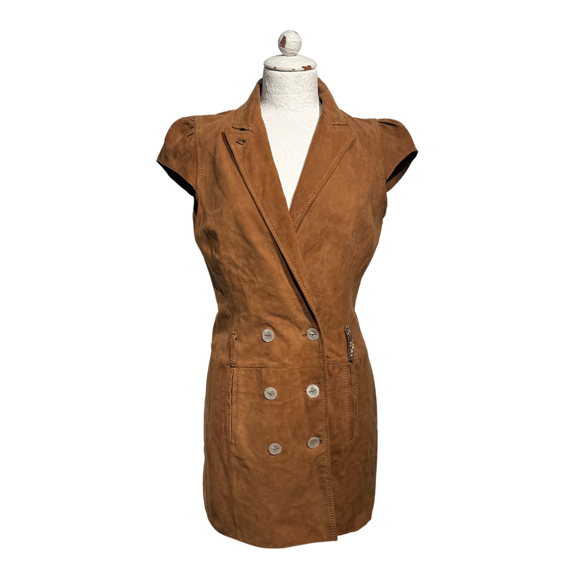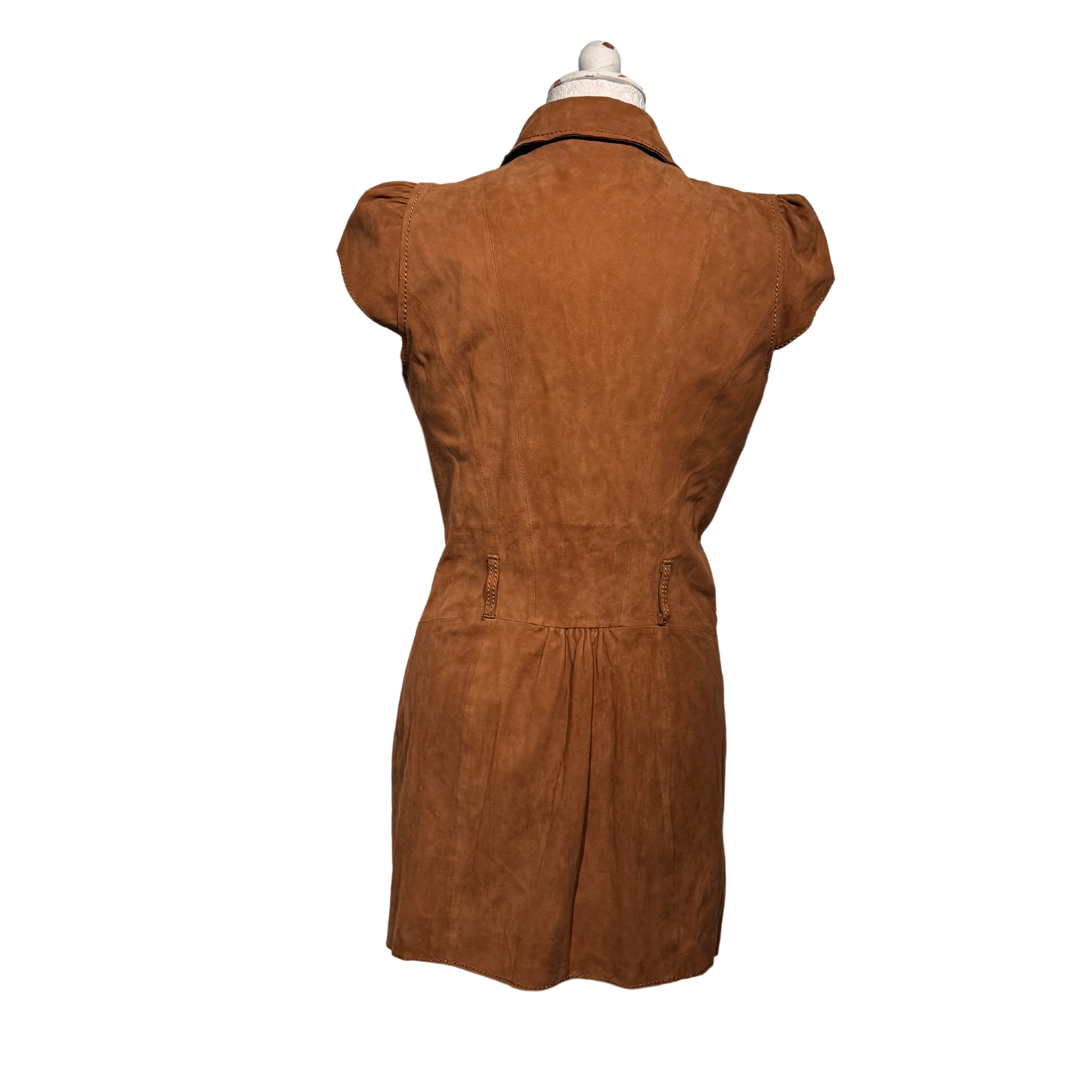 Abito in pelle scamosciata color cammello. Apertura frontale con bottoni . Passanti per la cintura di cui uno con strass.