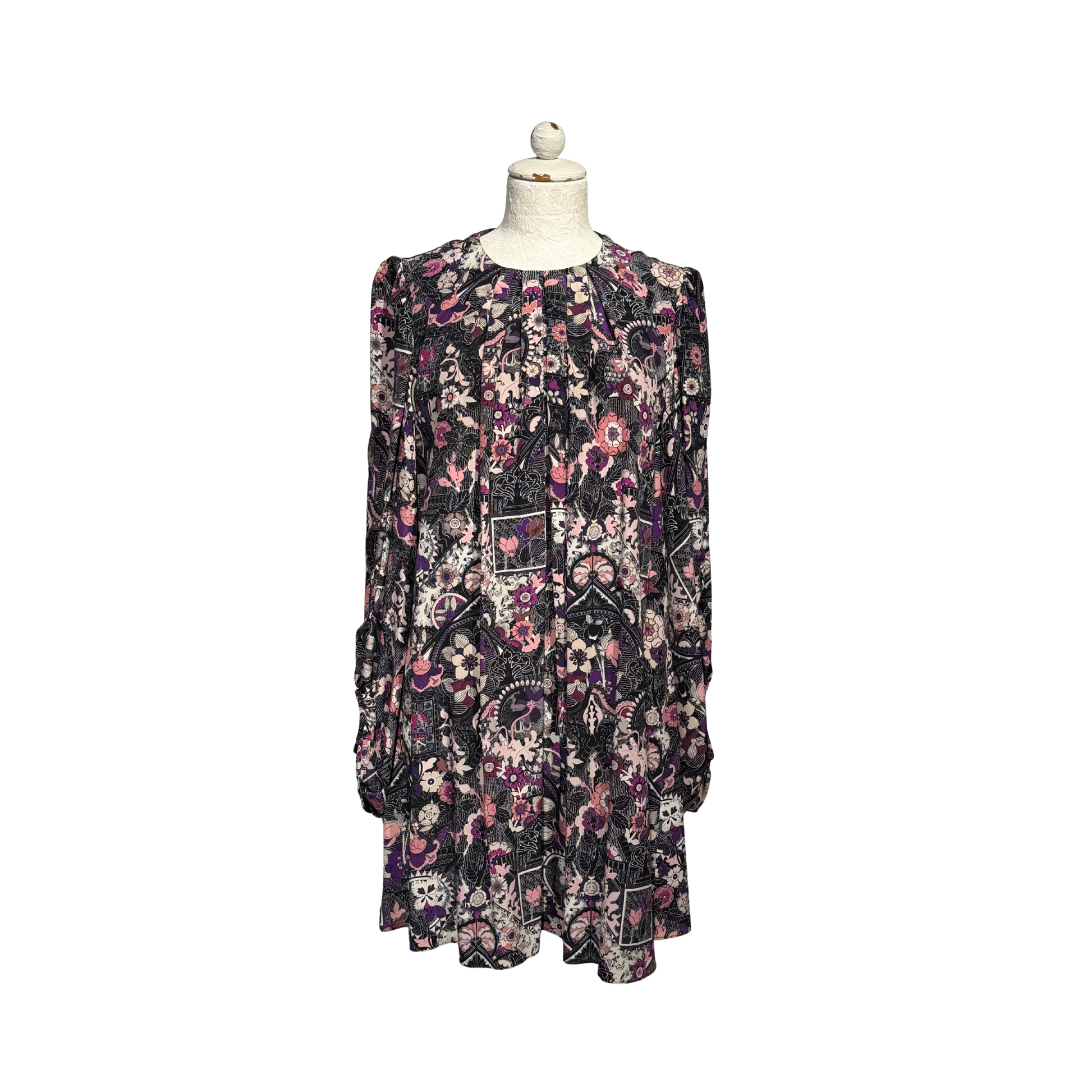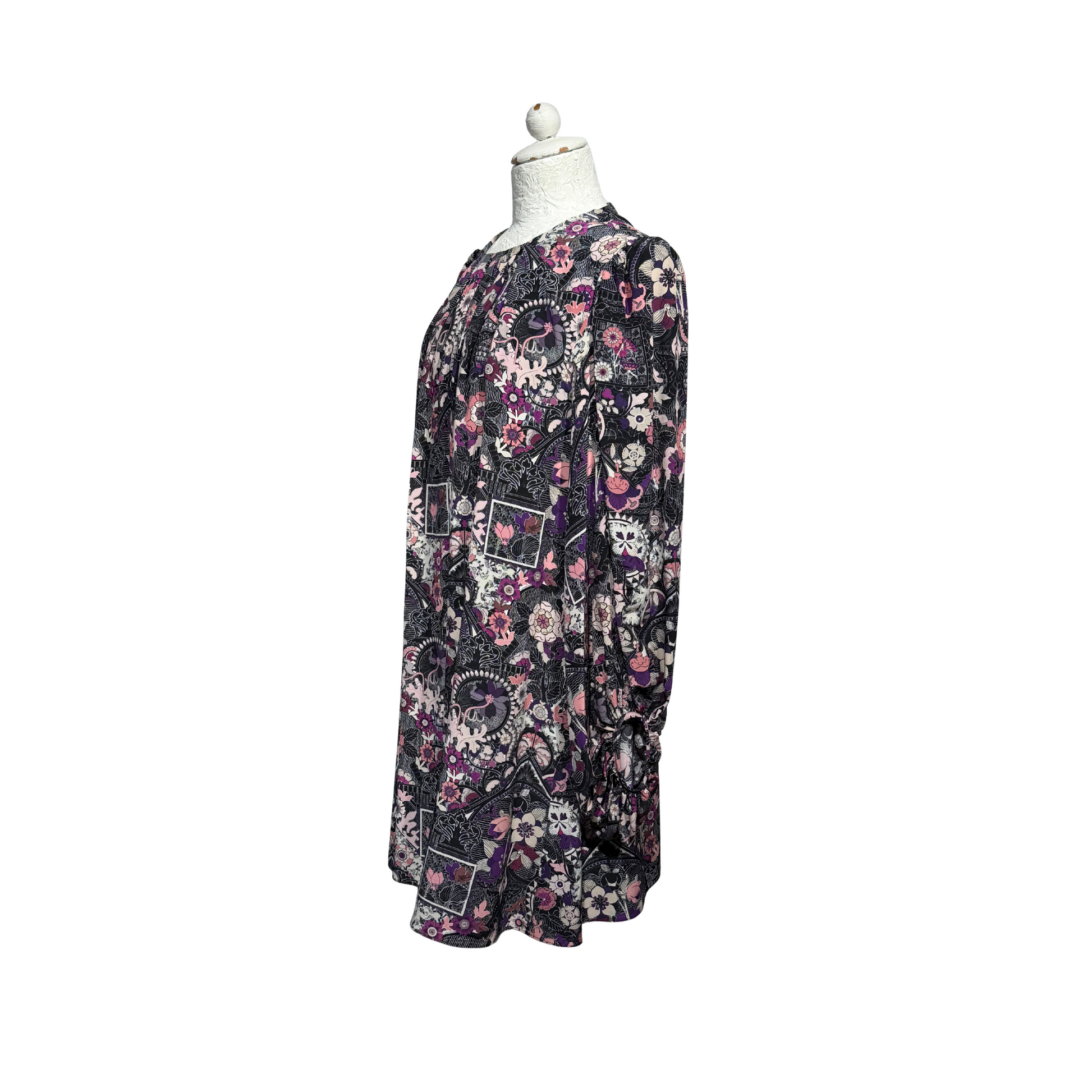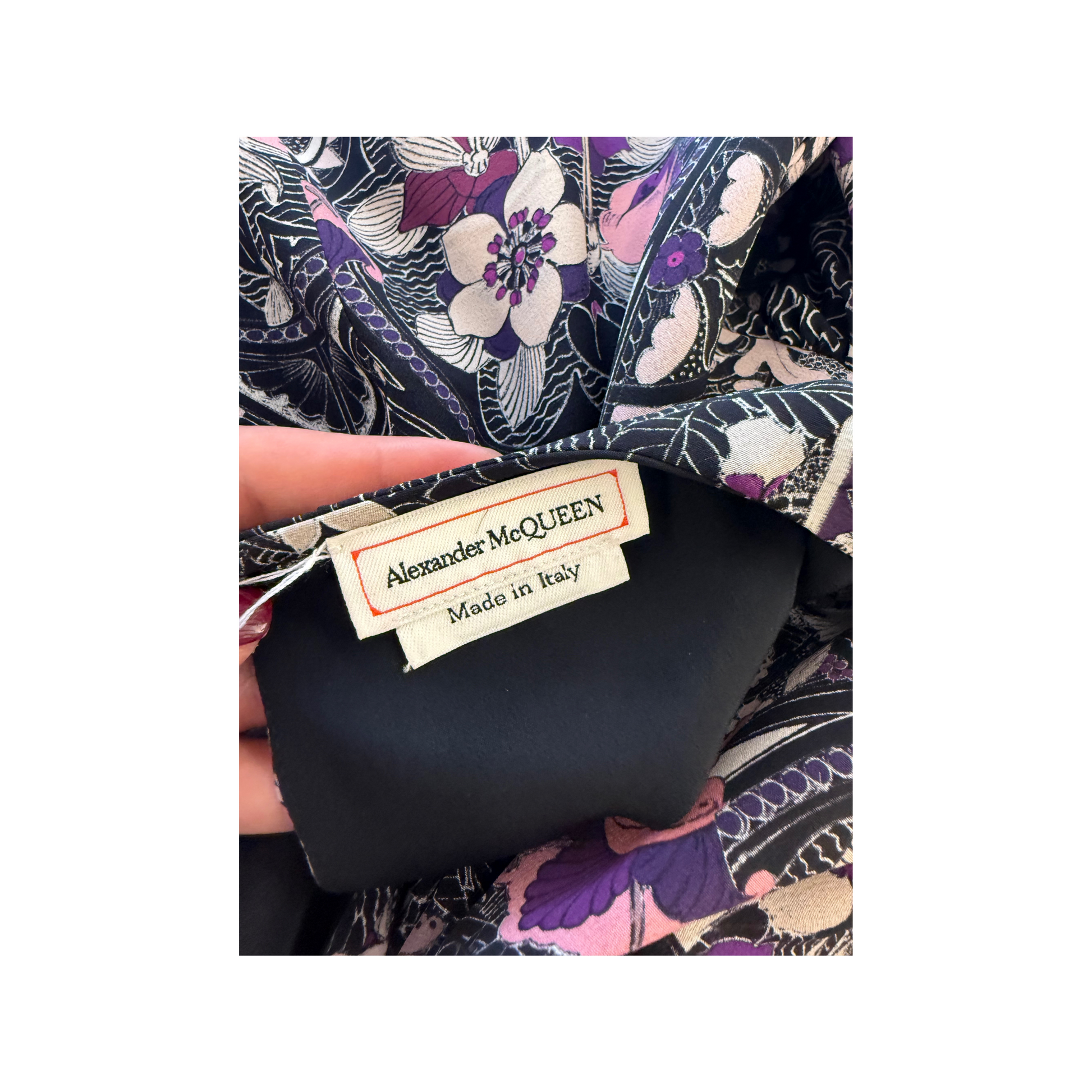 Elegante e ricercato abito corto di Alexander McQueen, realizzato in Italia in pura seta. Il design si distingue per la stampa floreale nei toni del viola, rosa e nero, con dettagli sofisticati che esaltano la femminilità del capo. Lo scollo tondo e le maniche lunghe con arricciature donano volume e carattere, mentre la chiusura posteriore con piccoli ganci garantisce una vestibilità raffinata.