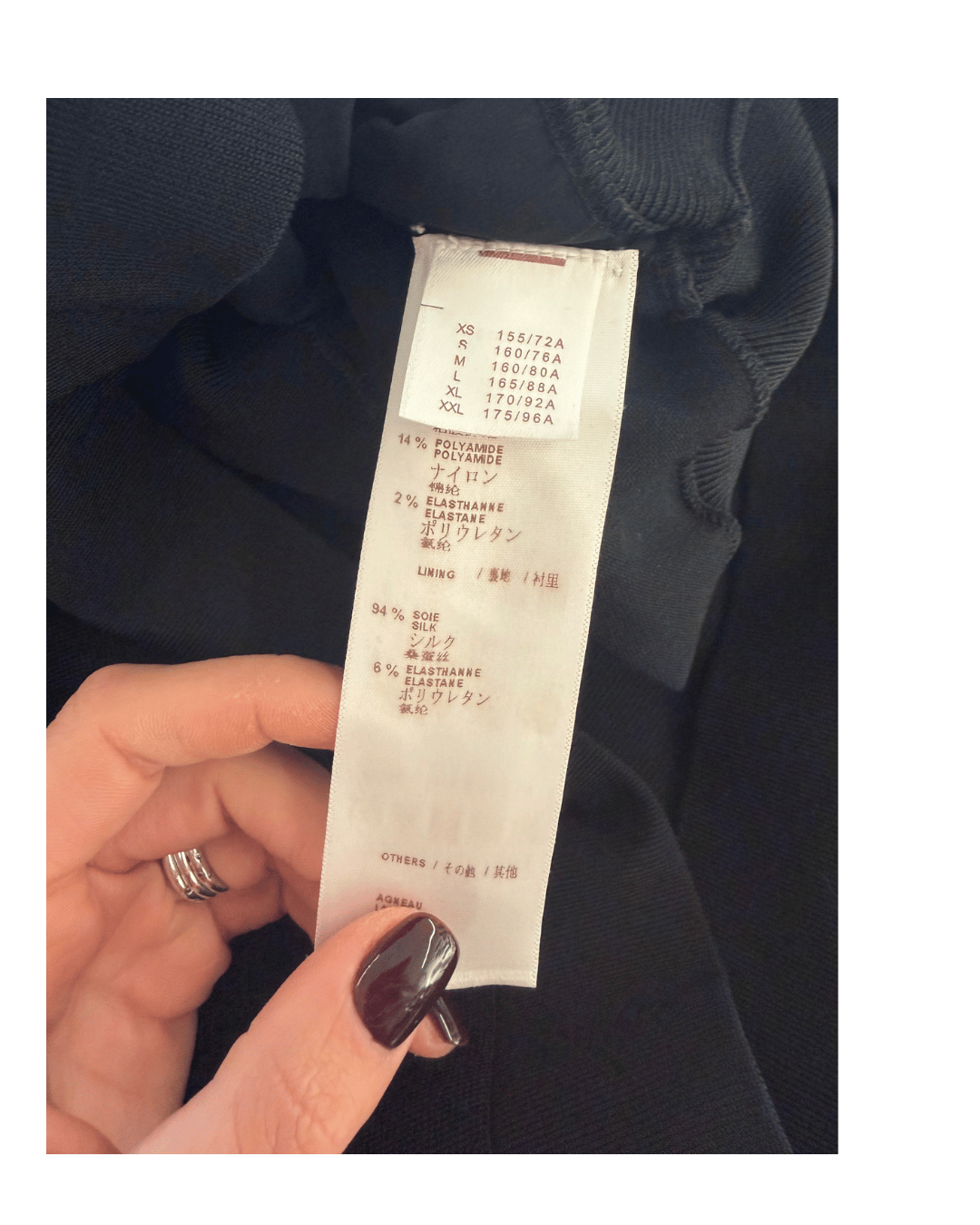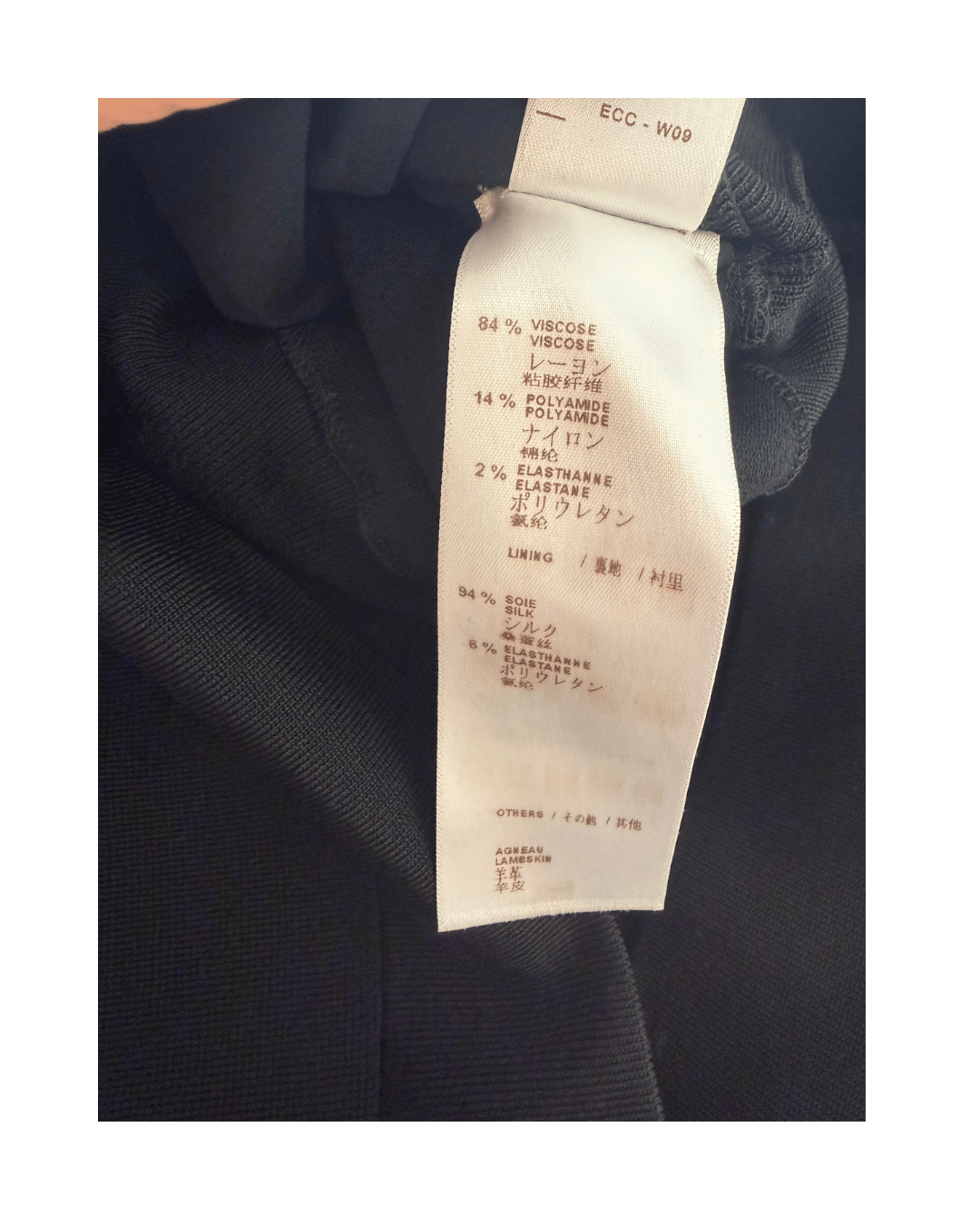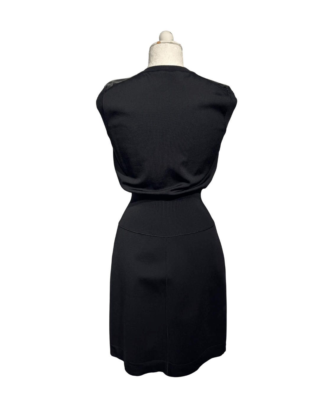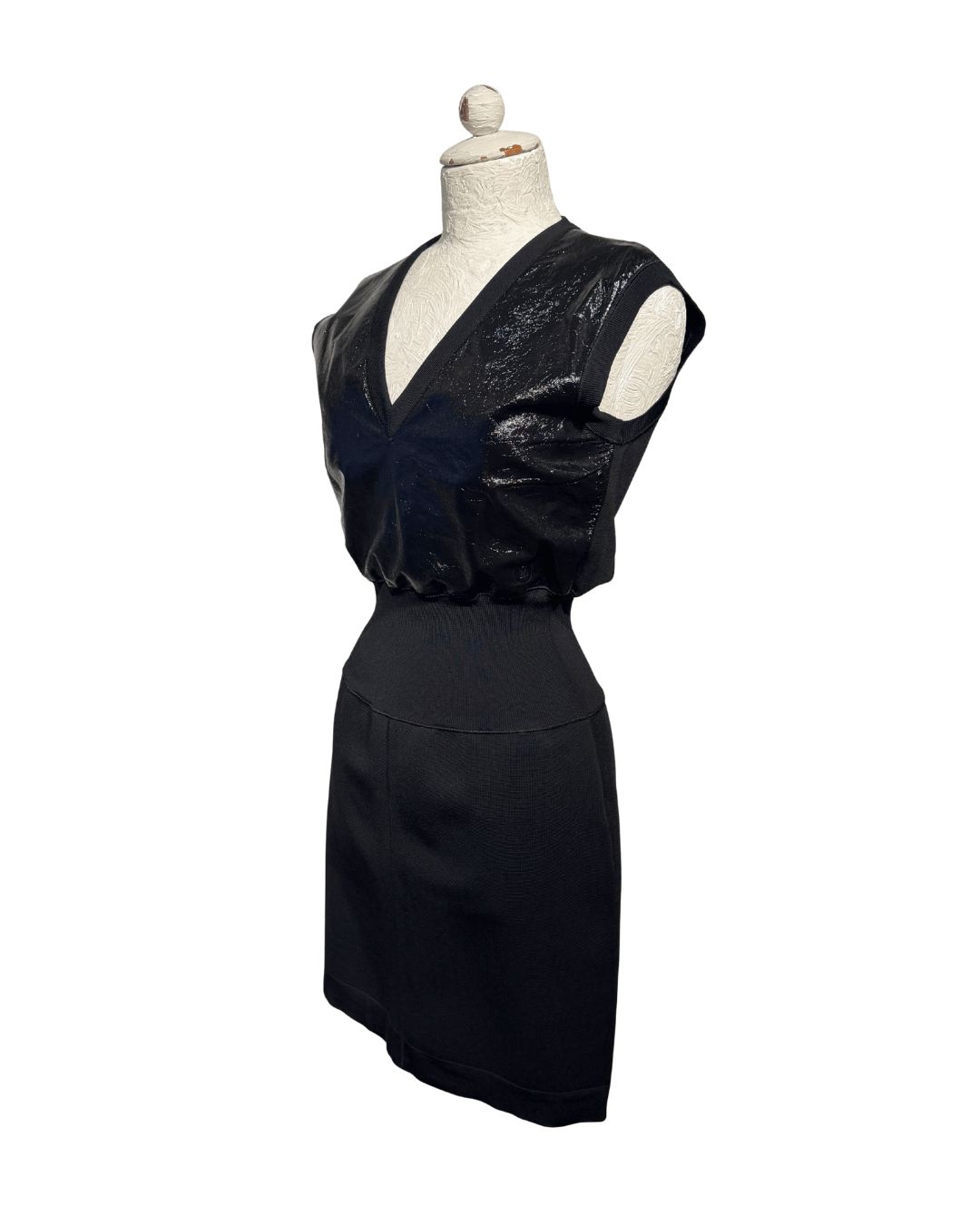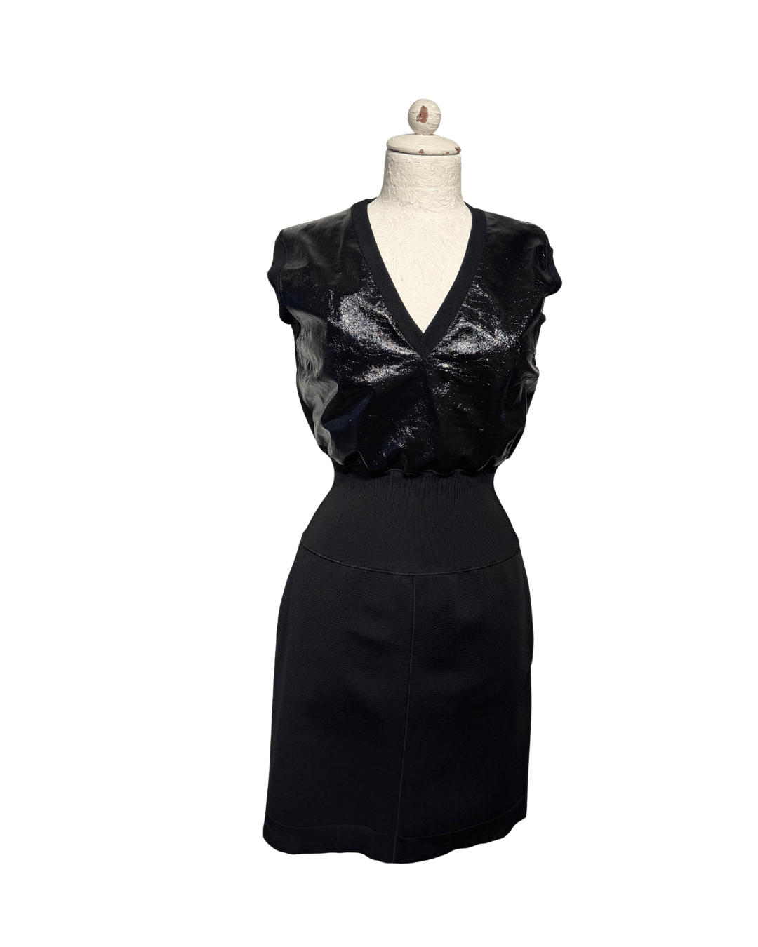 Abito Louis Vuitton elegante e contemporaneo in total black, caratterizzato da una silhouette femminile e raffinata. Il design presenta una linea pulita con vita alta che valorizza la figura e una parte superiore in morbida pelle lucida effetto vernice, con scollo a V e maniche corte, che crea un contrasto sofisticato con la gonna in maglia compatta. Il mix di materiali rende il capo unico e molto ricercato: la pelle dona luce e carattere, mentre la parte inferiore in viscosa elasticizzata garantisce comfort e vestibilità perfetta. Un abito ideale per sera, eventi o aperitivi eleganti. Composizione: 84% viscosa, 14% poliammide, 2% elastan