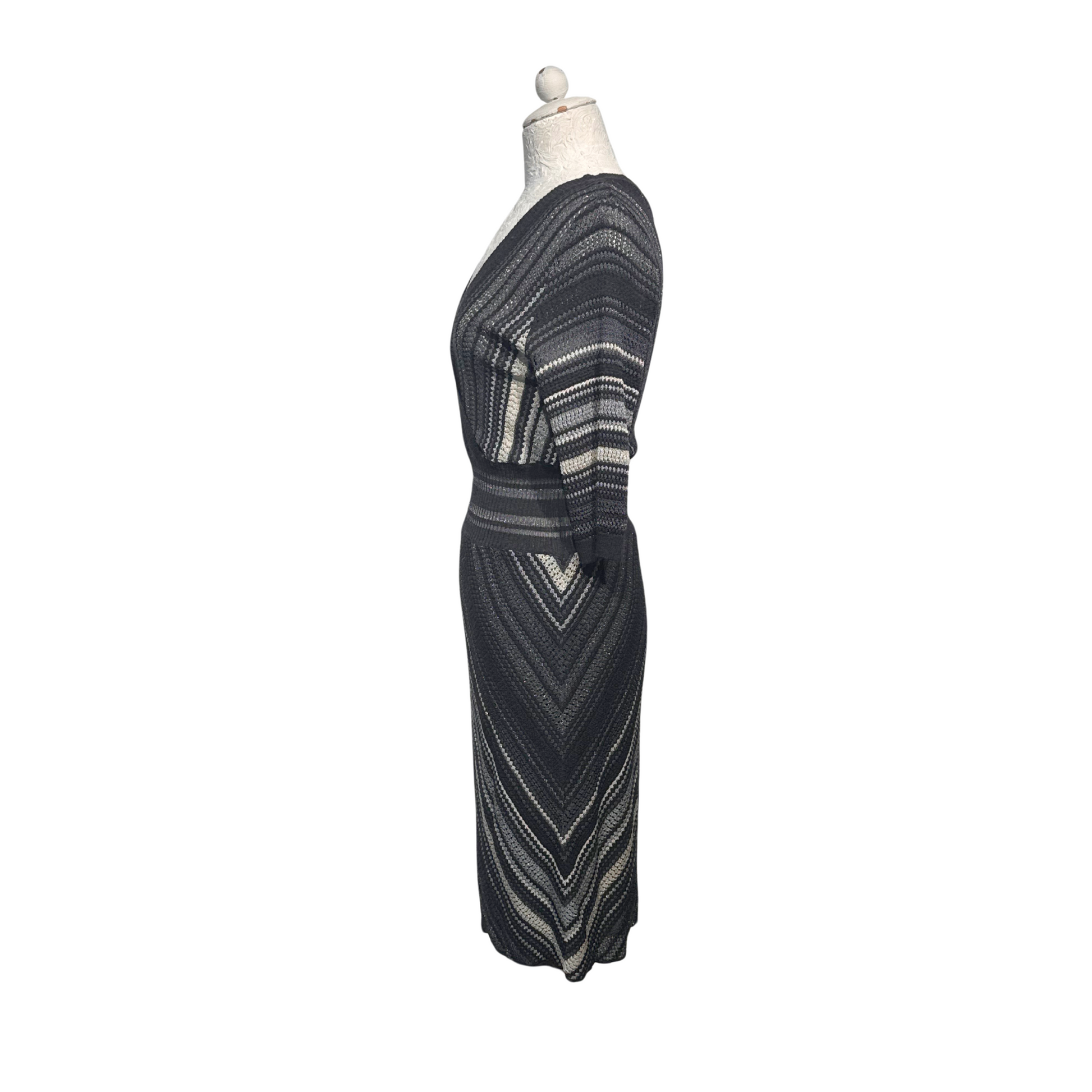 Abito Missoni con iconica trama sui toni del grigio e nero. Elastico in vita. Scollo a V. Manica a tre quarti.