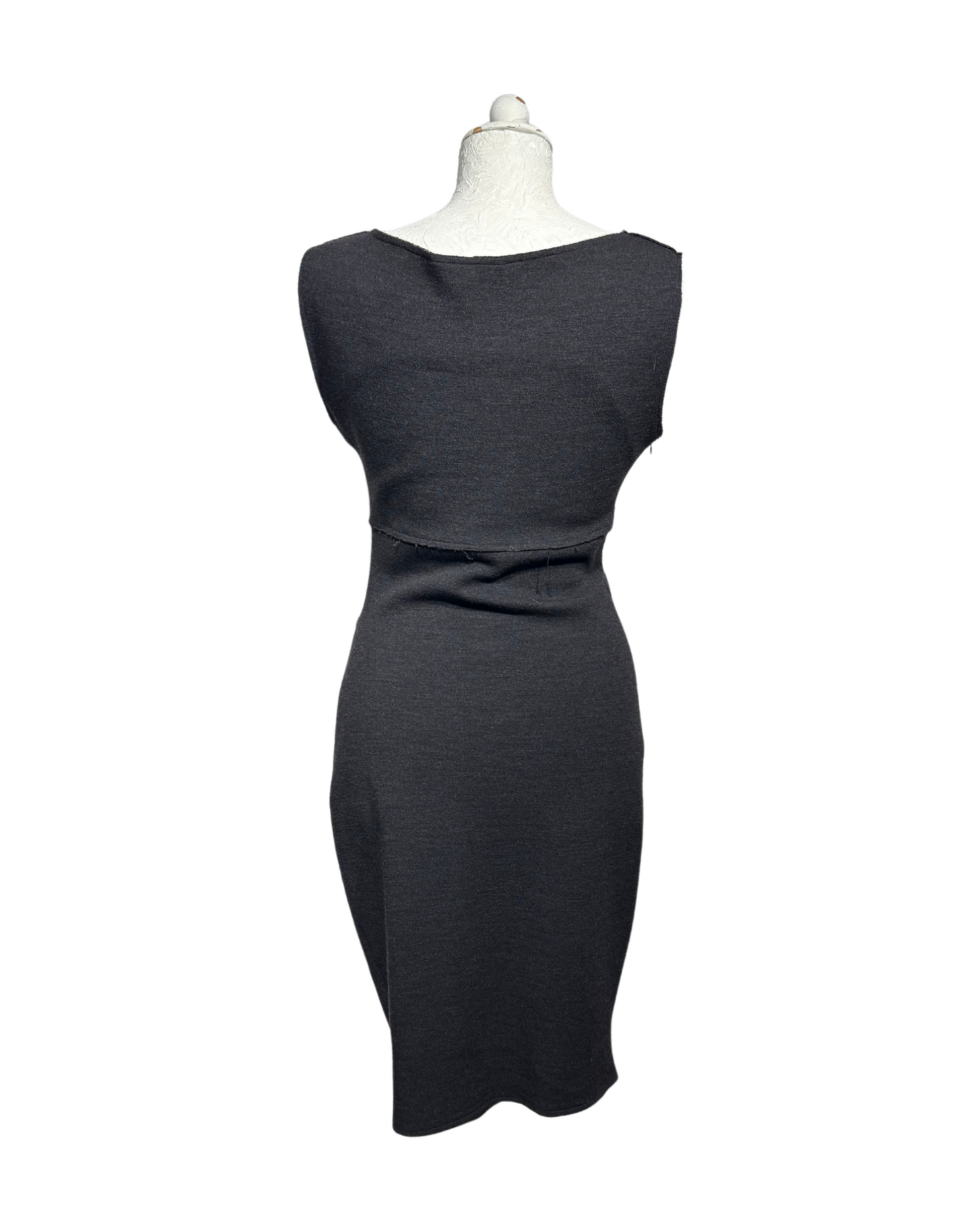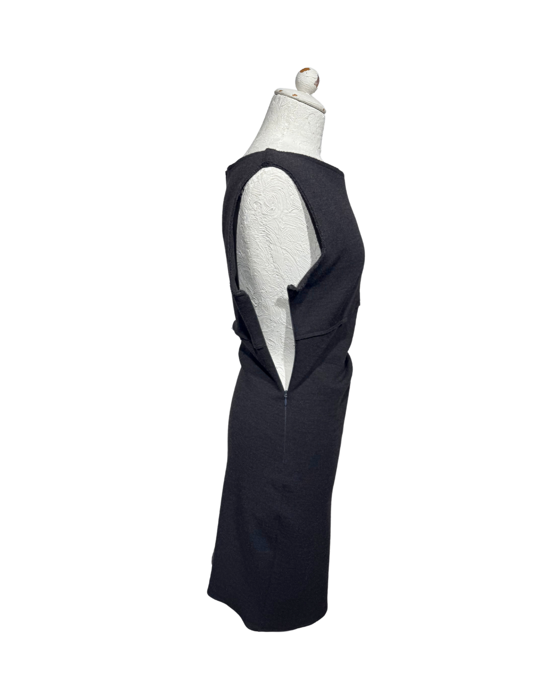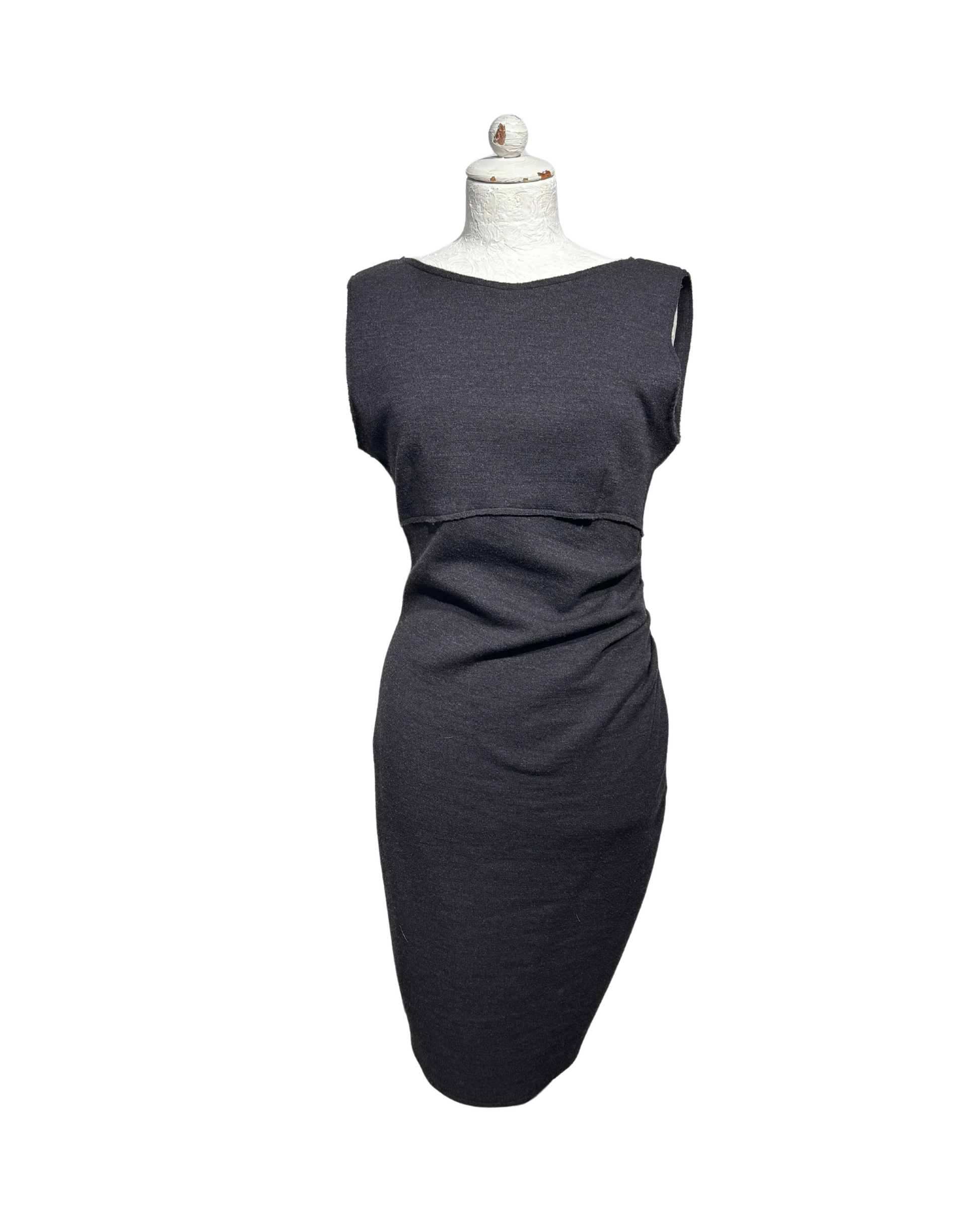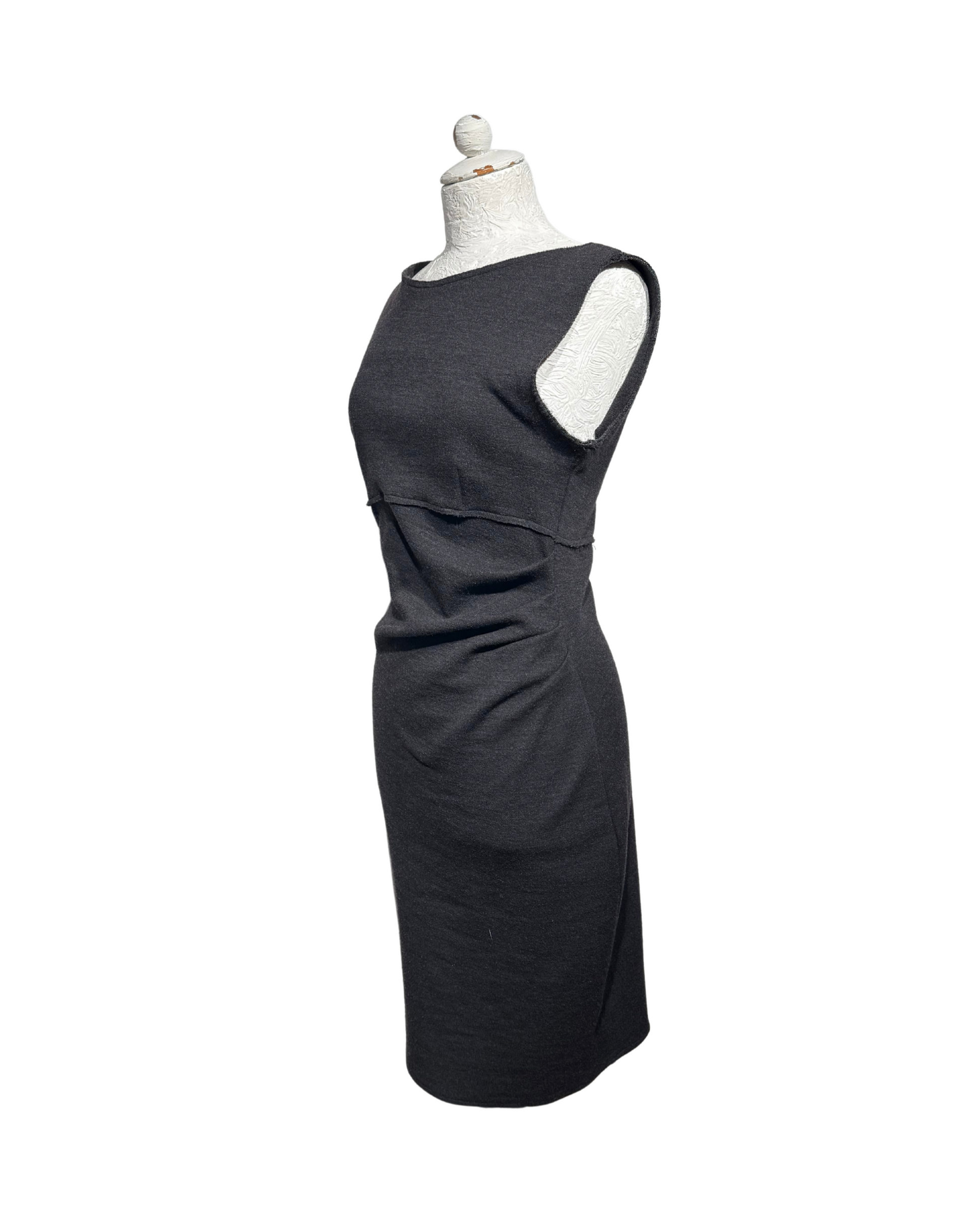 Abito di Parosh grigio con drappeggio laterale, realizzato in lana. Smanicato. Cerniera laterale.