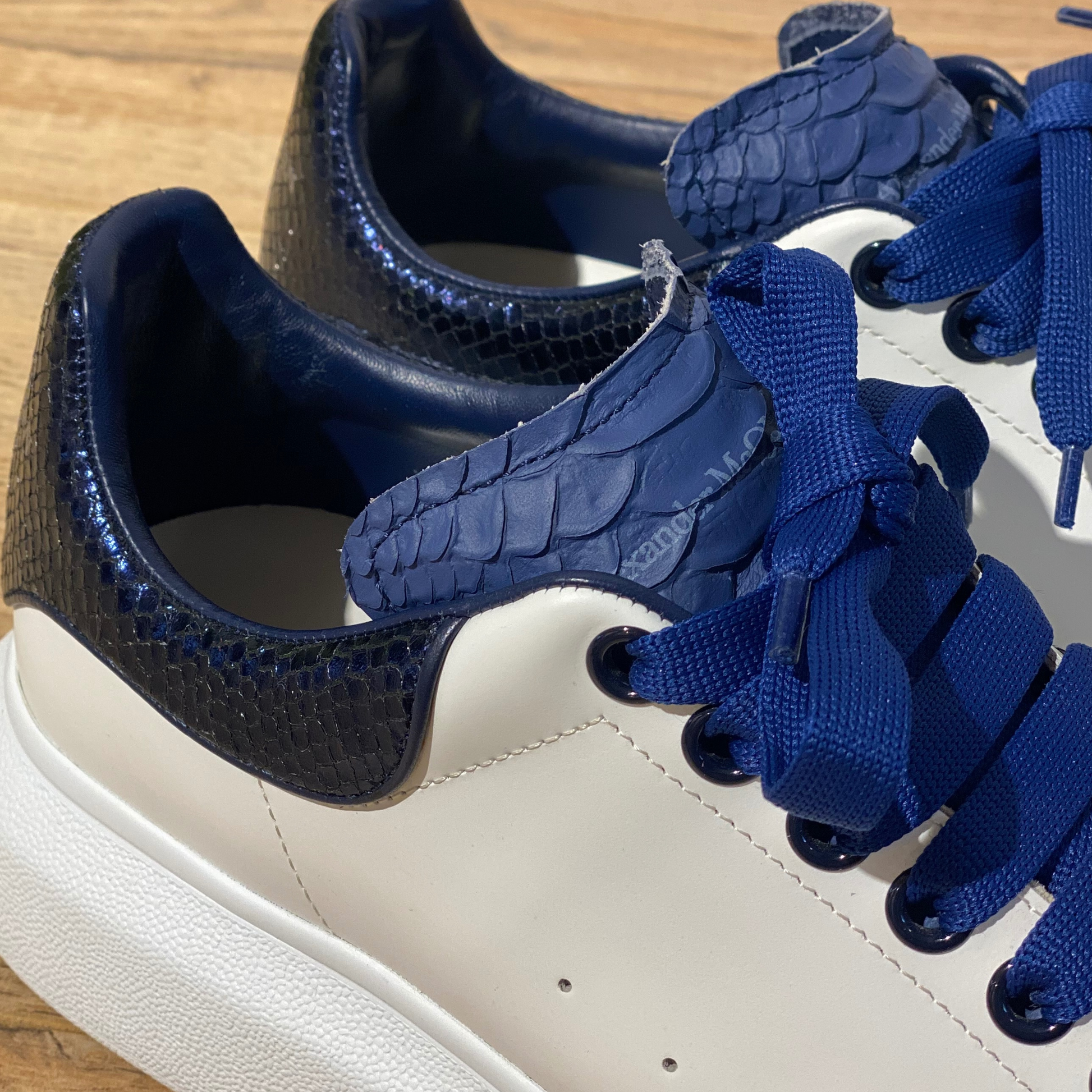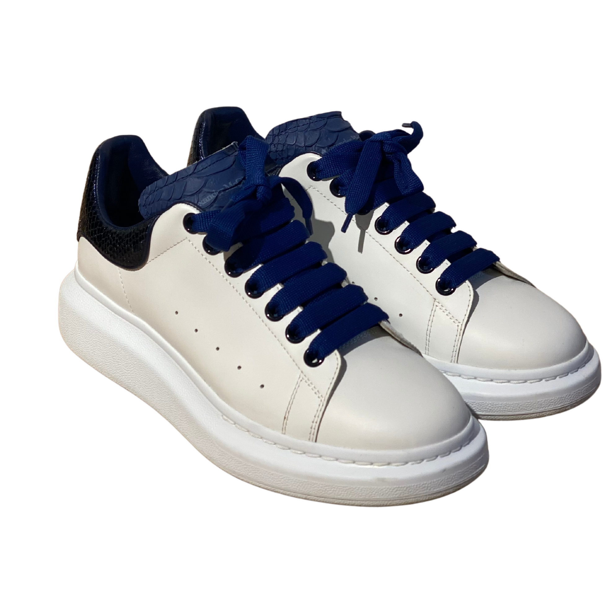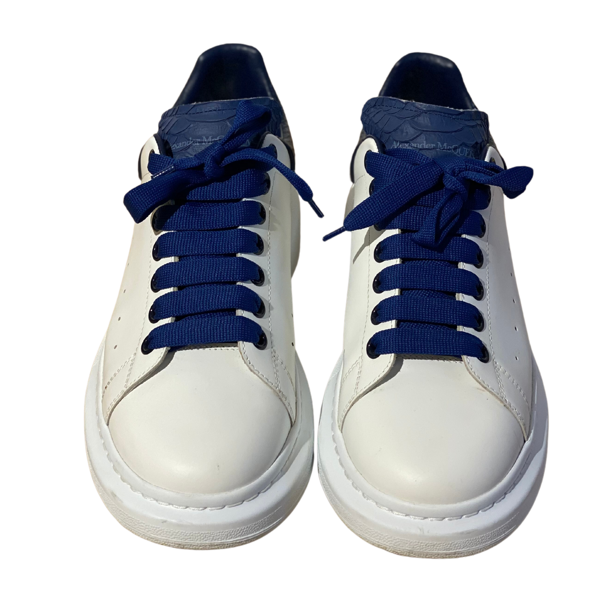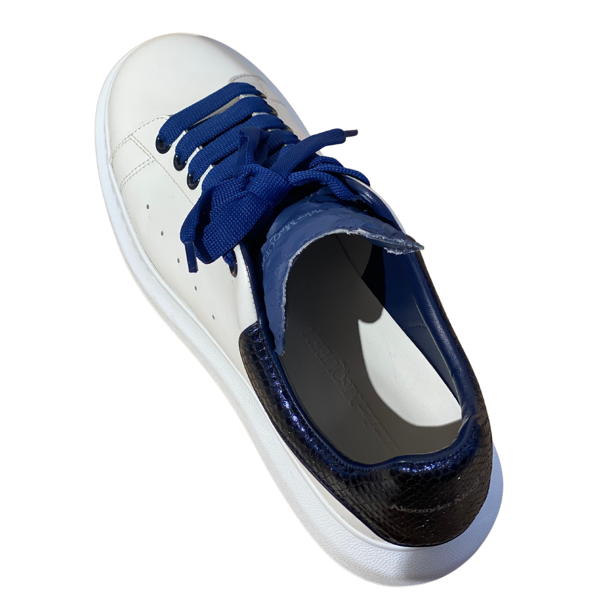 Alexander McQueen da uomo in pelle di vitello liscia bianca. Suola Oversize bianca 45mm.Patch effetto rettile sul tallone e linguetta blu stampa rettile. Allacciatura frontale con lacci blu . Inserti laterali perforati. Dettagli logo. Interno in pelle. Made in Italy.