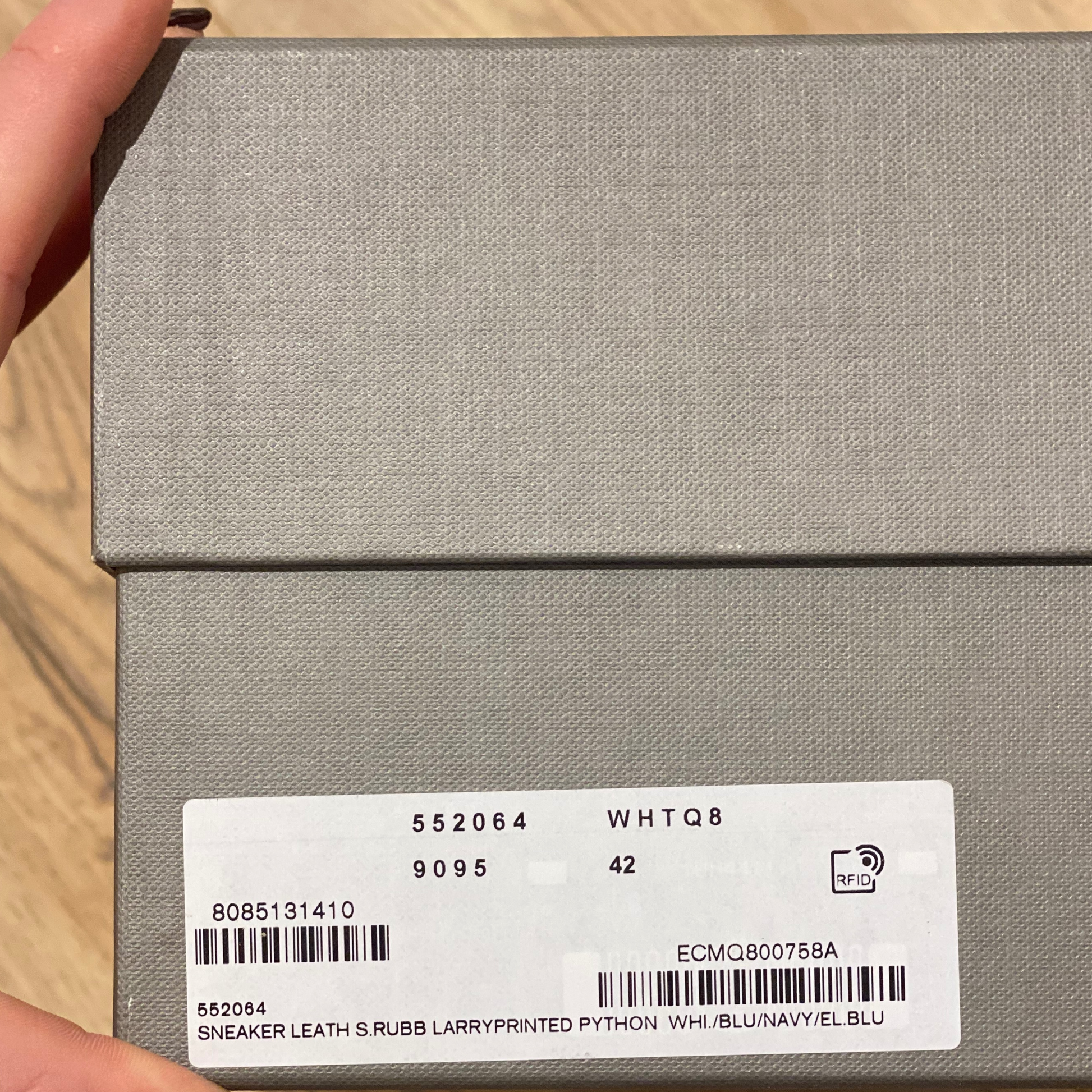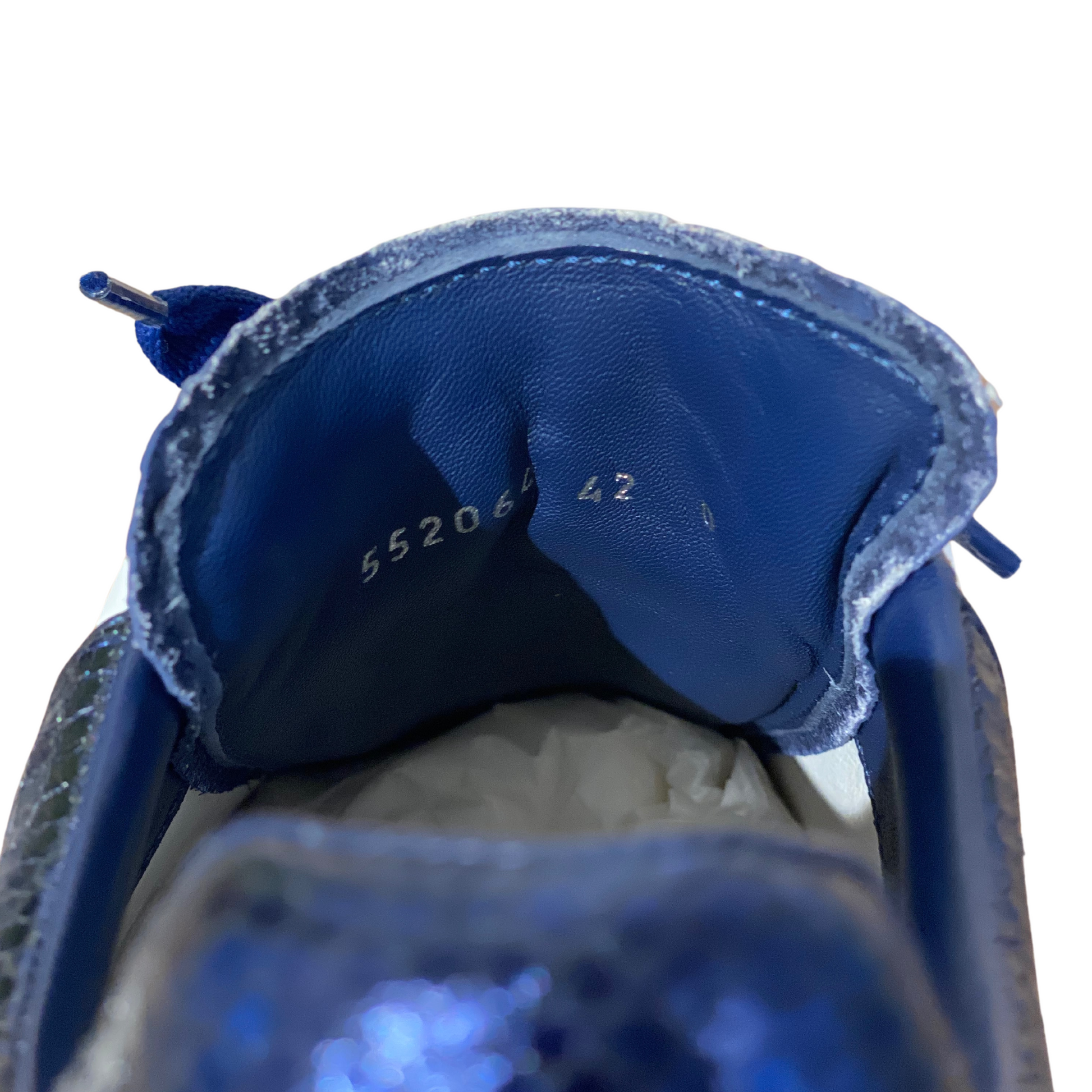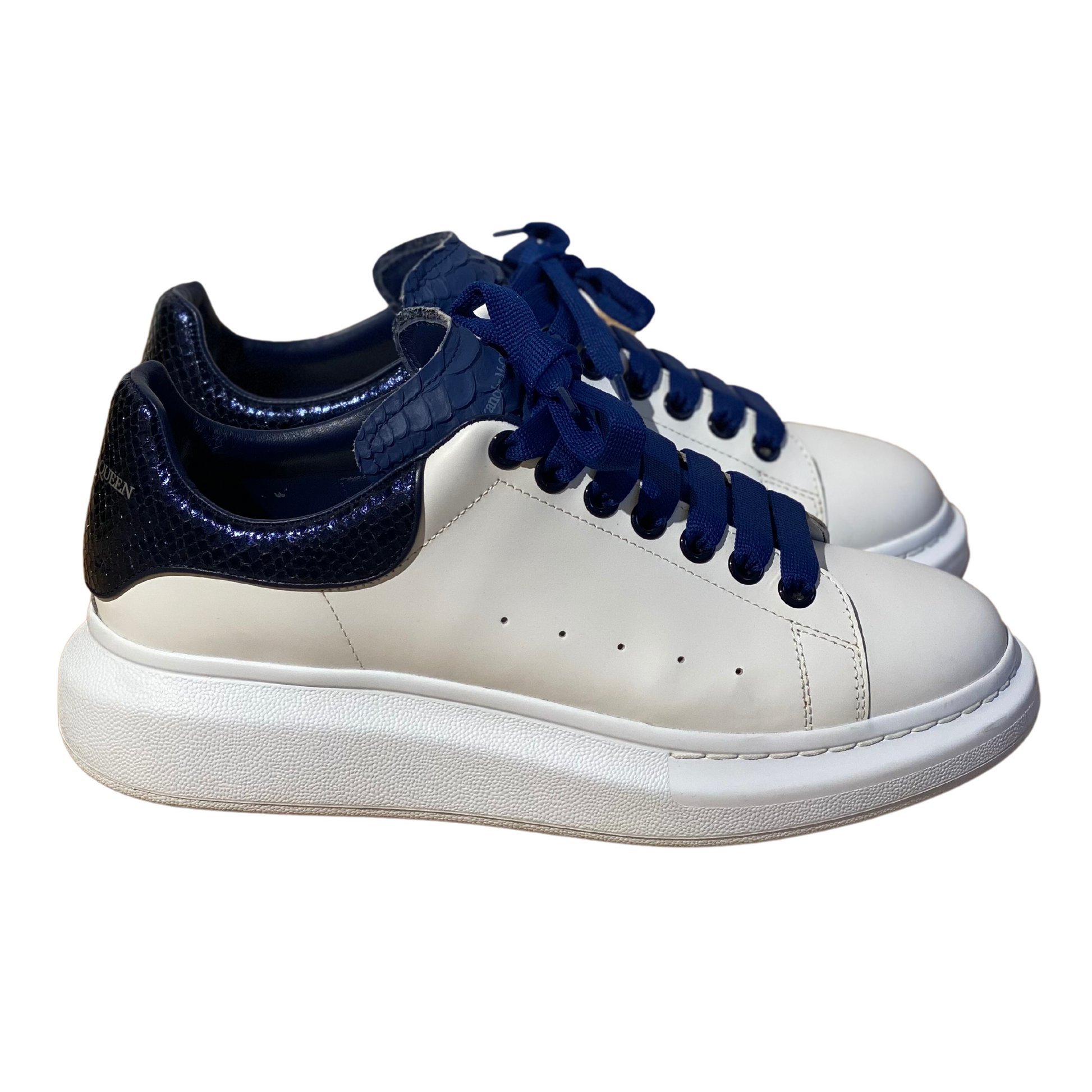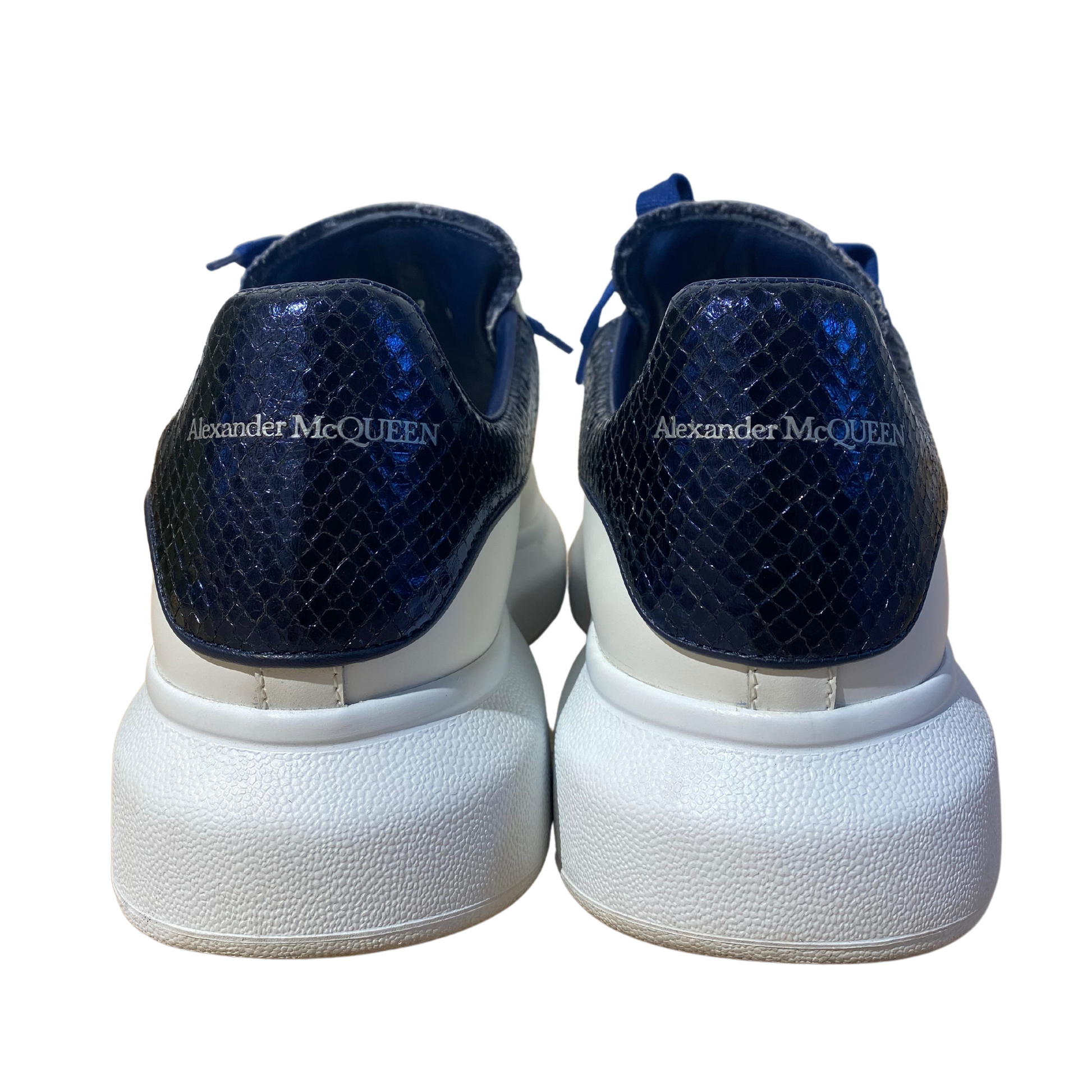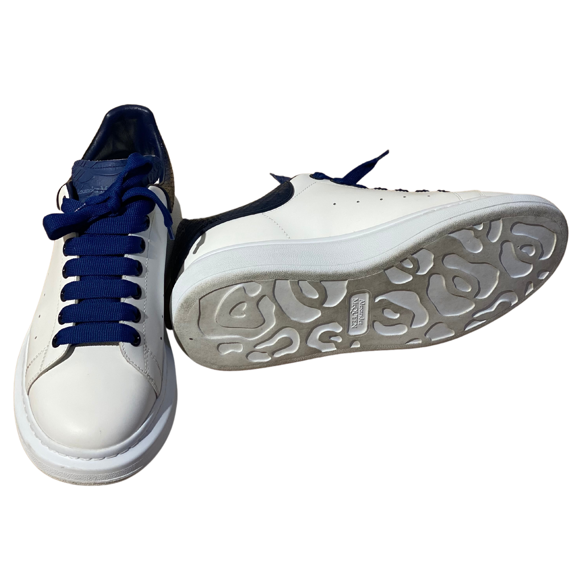 Alexander McQueen da uomo in pelle di vitello liscia bianca. Suola Oversize bianca 45mm.Patch effetto rettile sul tallone e linguetta blu stampa rettile. Allacciatura frontale con lacci blu . Inserti laterali perforati. Dettagli logo. Interno in pelle. Made in Italy.