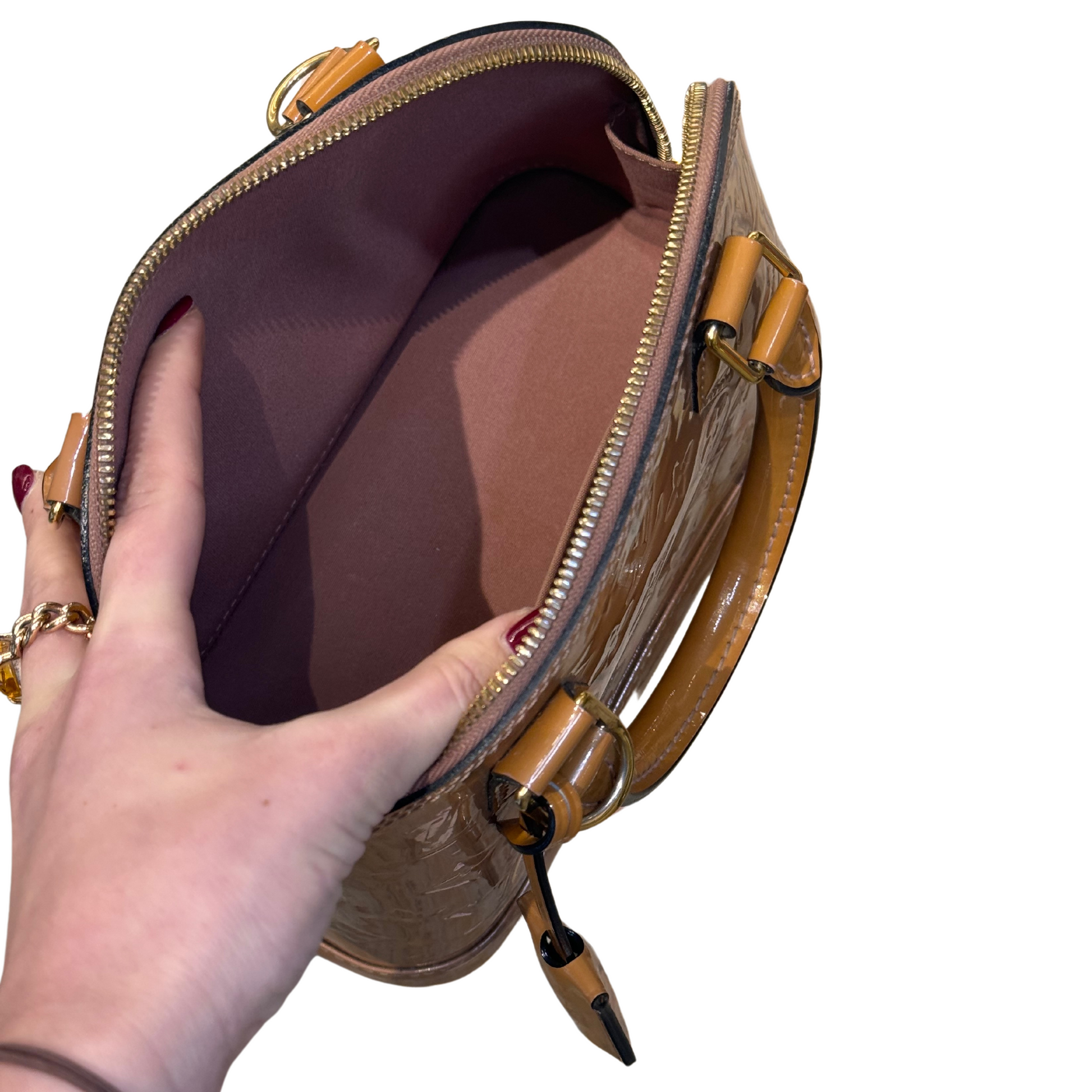Alma BB Louis Vuitton realizzata in pelle verniciata beige con monogram impresso. Apertura superiore con cerniera, metalleria dorata. Doppi manici in pelle arrotolata. tracolla amovibile , possibilità di indossarla sia a mano sia a tracolla. Interno in tessuto beige. (codice: MI3143)