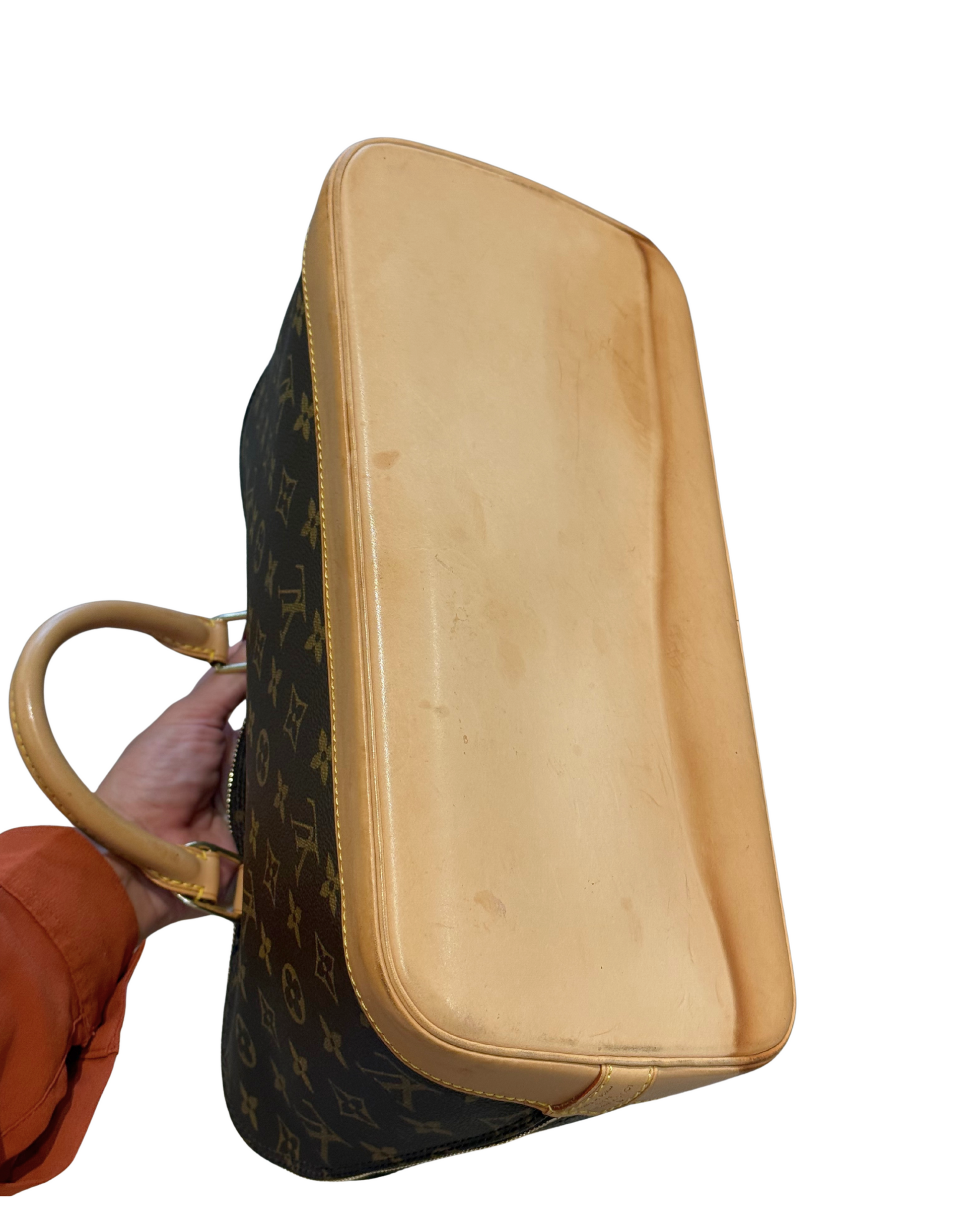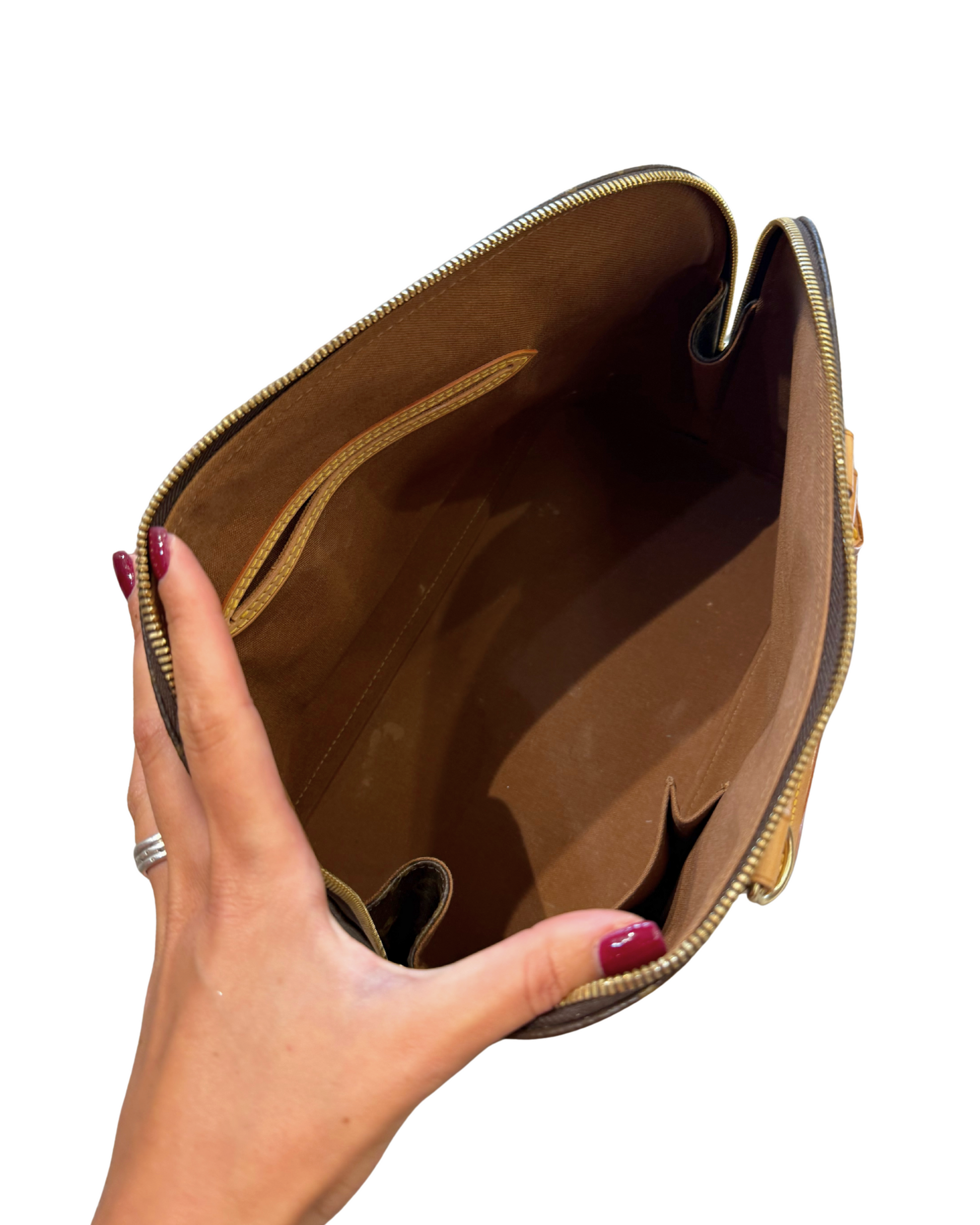 Alma PM Louis Vuitton, corpo in tela monogram e rifiniture in vacchetta naturale. Doppi manici superiori. Apertura con cerniera. Interno in tessuto marrone, tasca piatta . (CODICE: FL1014)