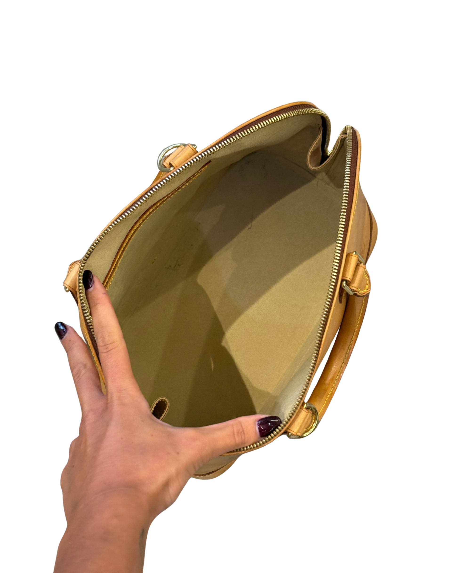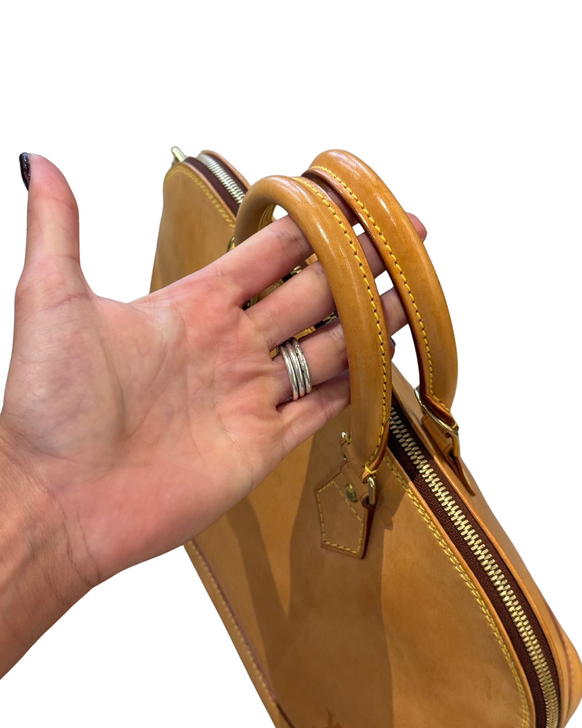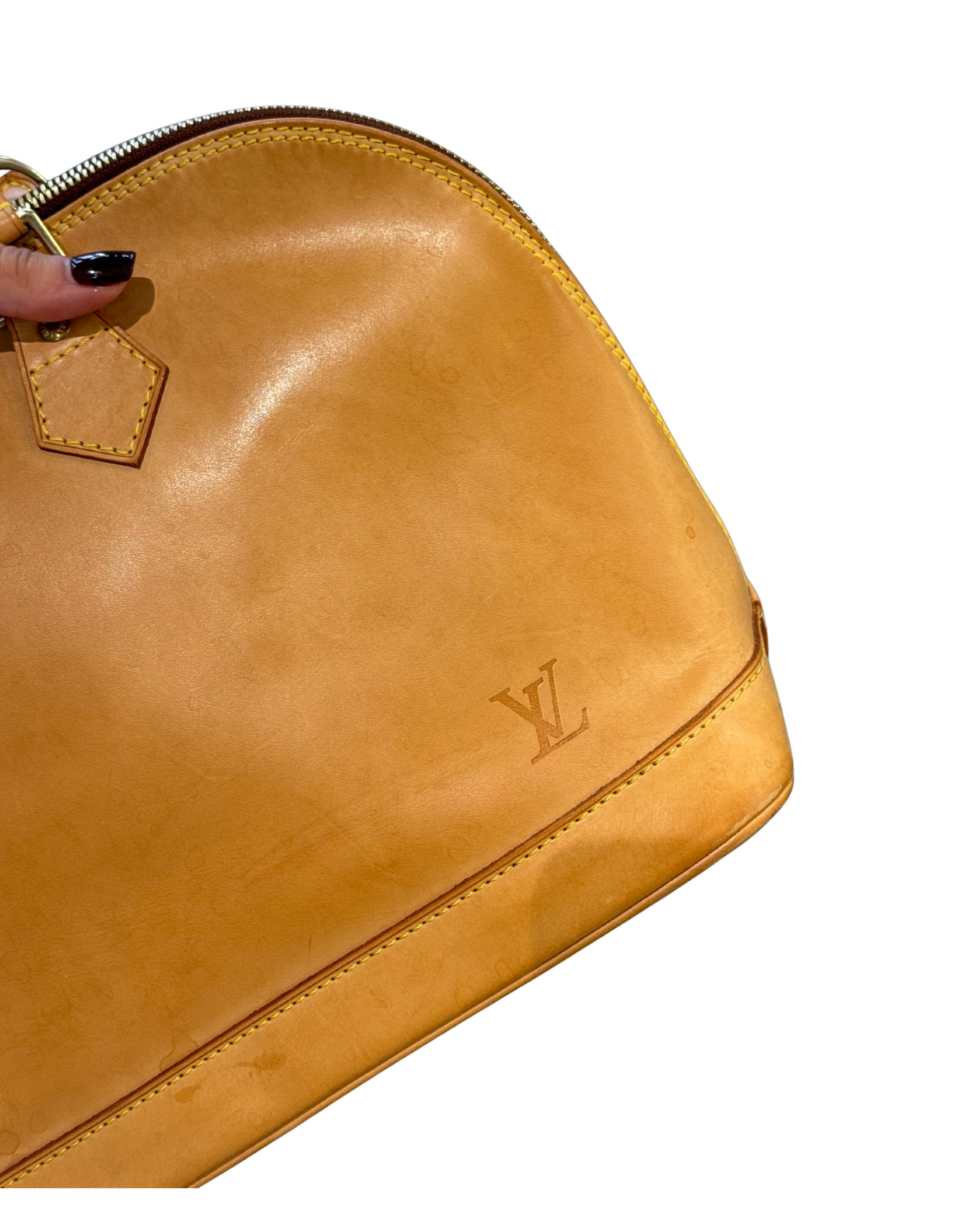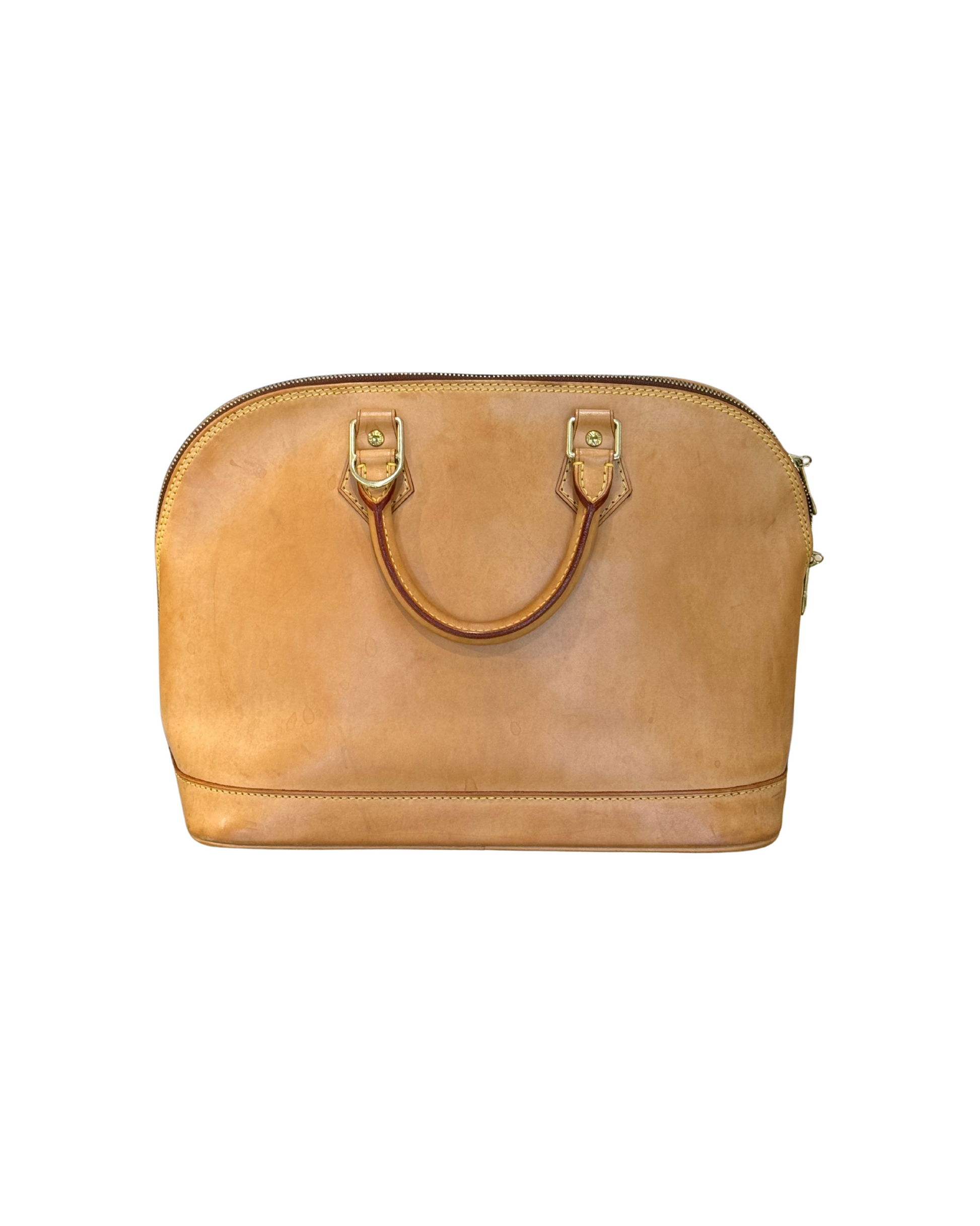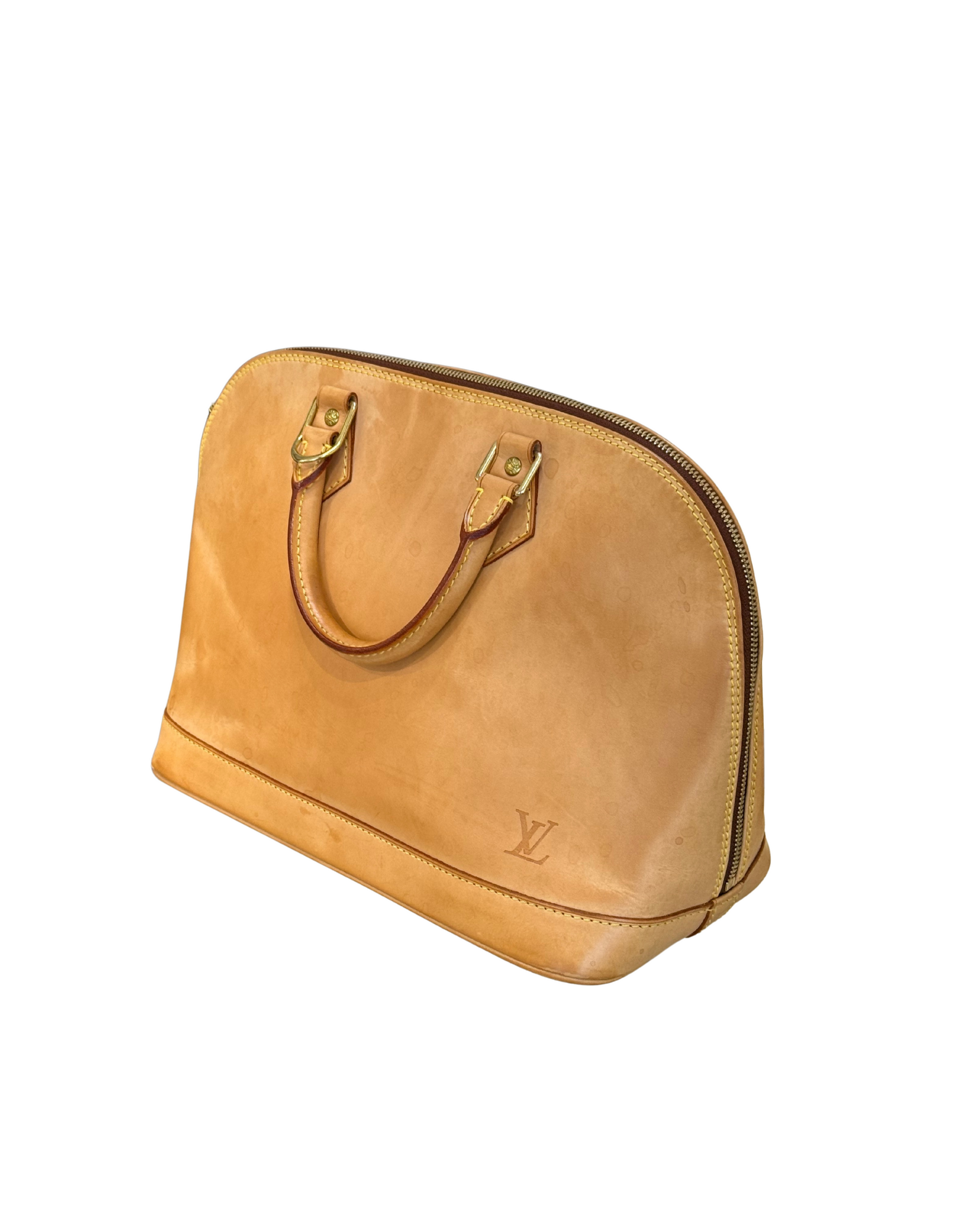 Questa Alma PM è realizzata interamente in vacchetta naturale, una versione rara ed affascinante del classico modello Alma. La struttura rigida e l'inconfondibile silhouette a cupola la rendono un'icona della Maison. All'interno è presente un ampio scomparto foderato in microfibra beige, con una comoda tasca piatta. I doppi manici consentono un comodo trasporto a mano.