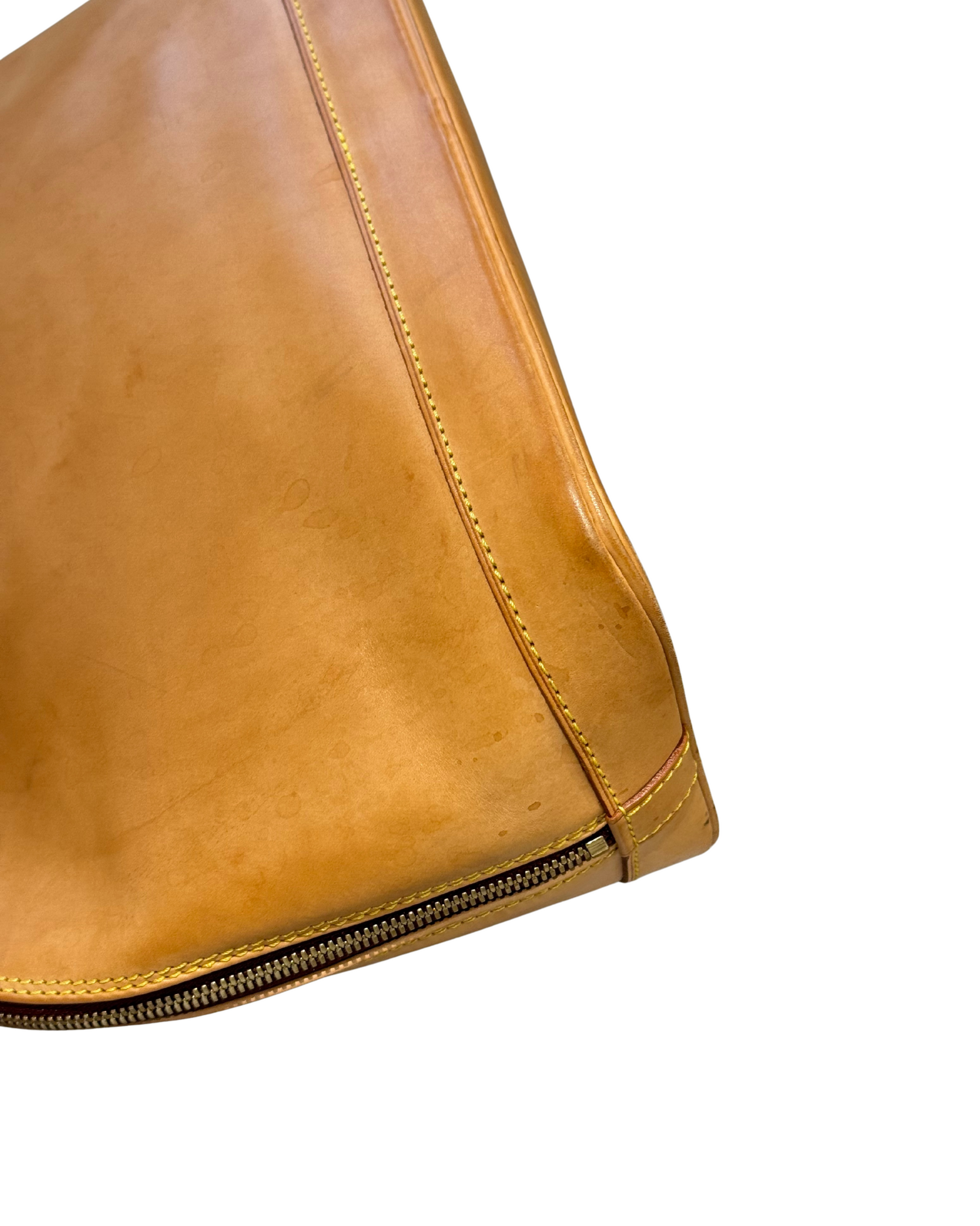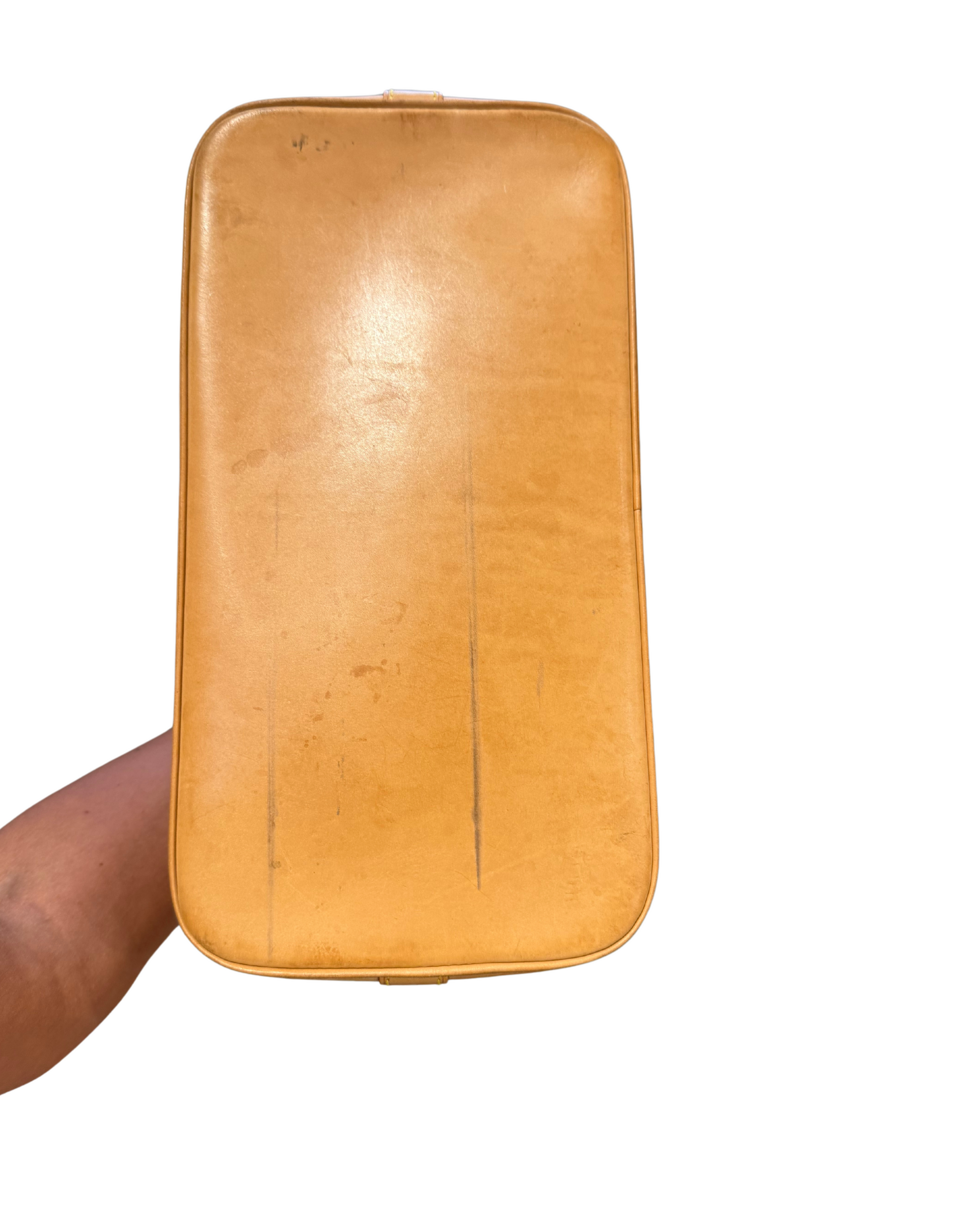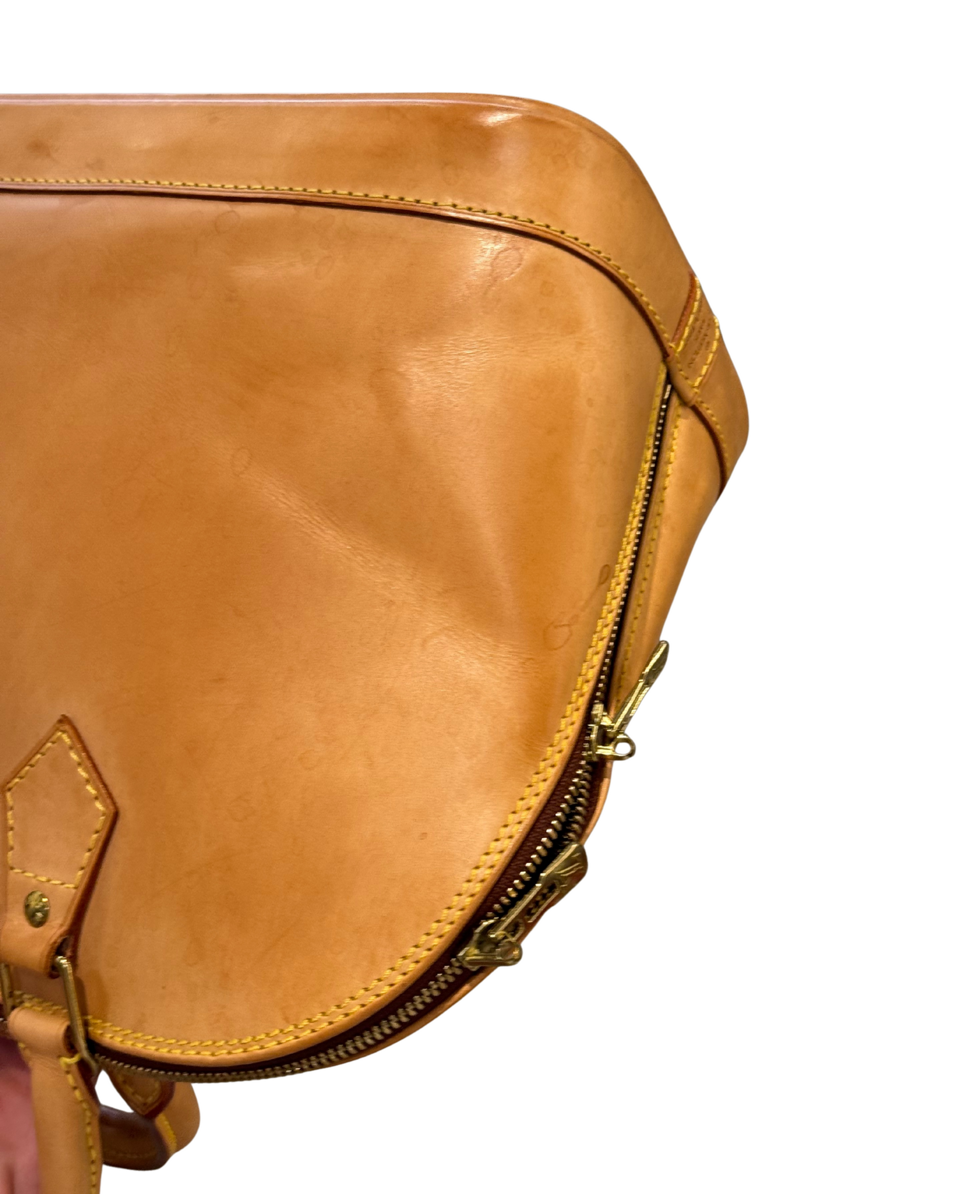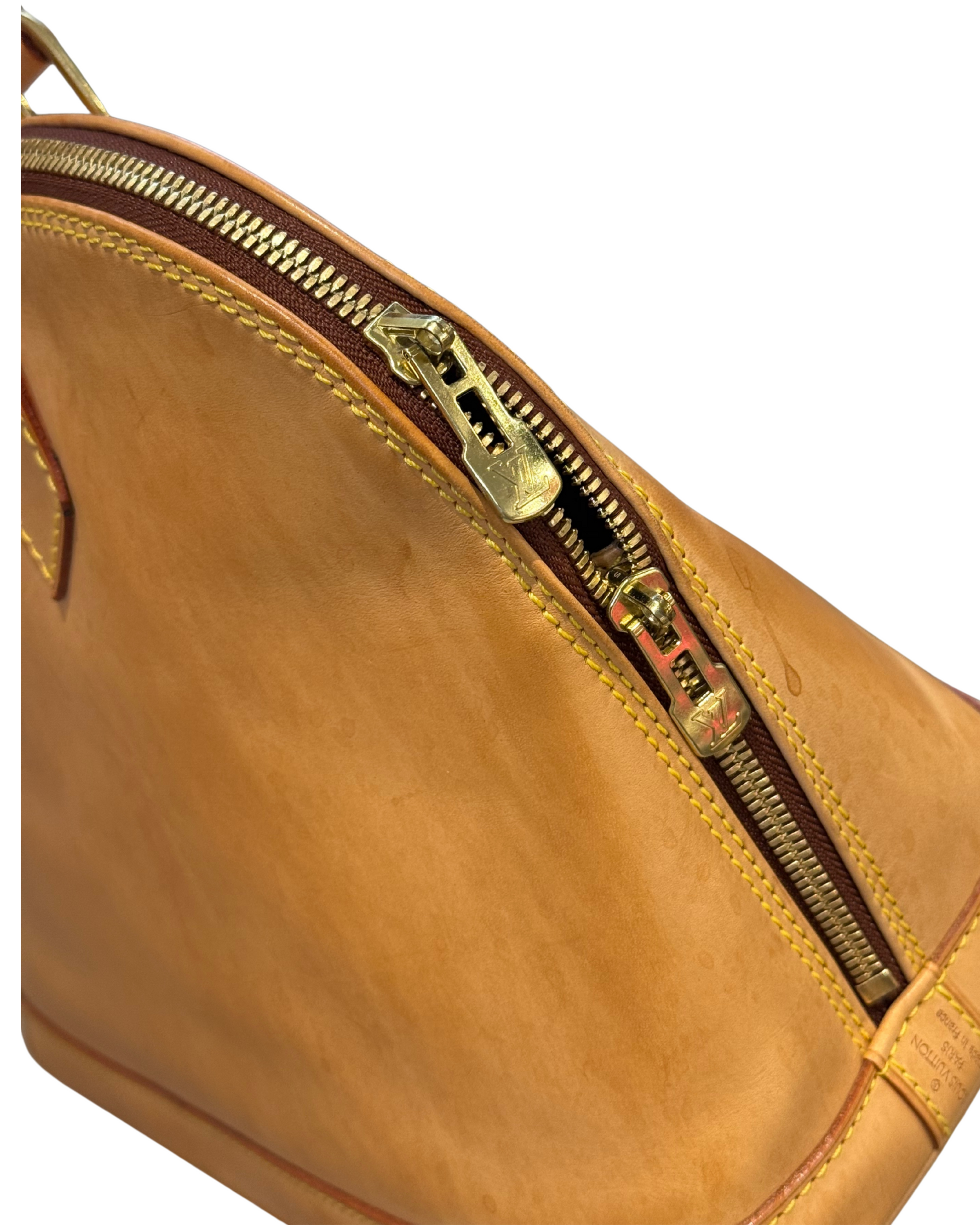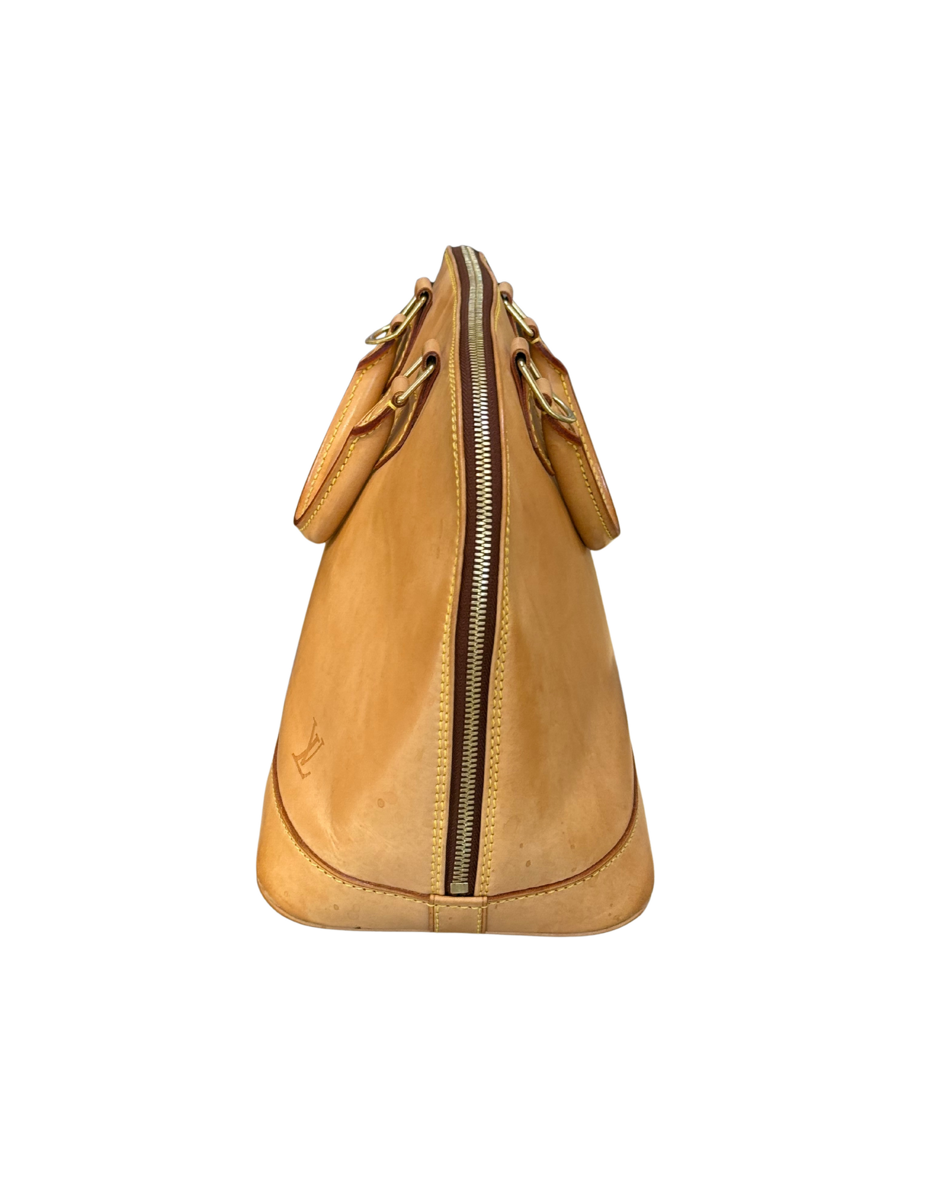 Questa Alma PM è realizzata interamente in vacchetta naturale, una versione rara ed affascinante del classico modello Alma. La struttura rigida e l'inconfondibile silhouette a cupola la rendono un'icona della Maison. All'interno è presente un ampio scomparto foderato in microfibra beige, con una comoda tasca piatta. I doppi manici consentono un comodo trasporto a mano.