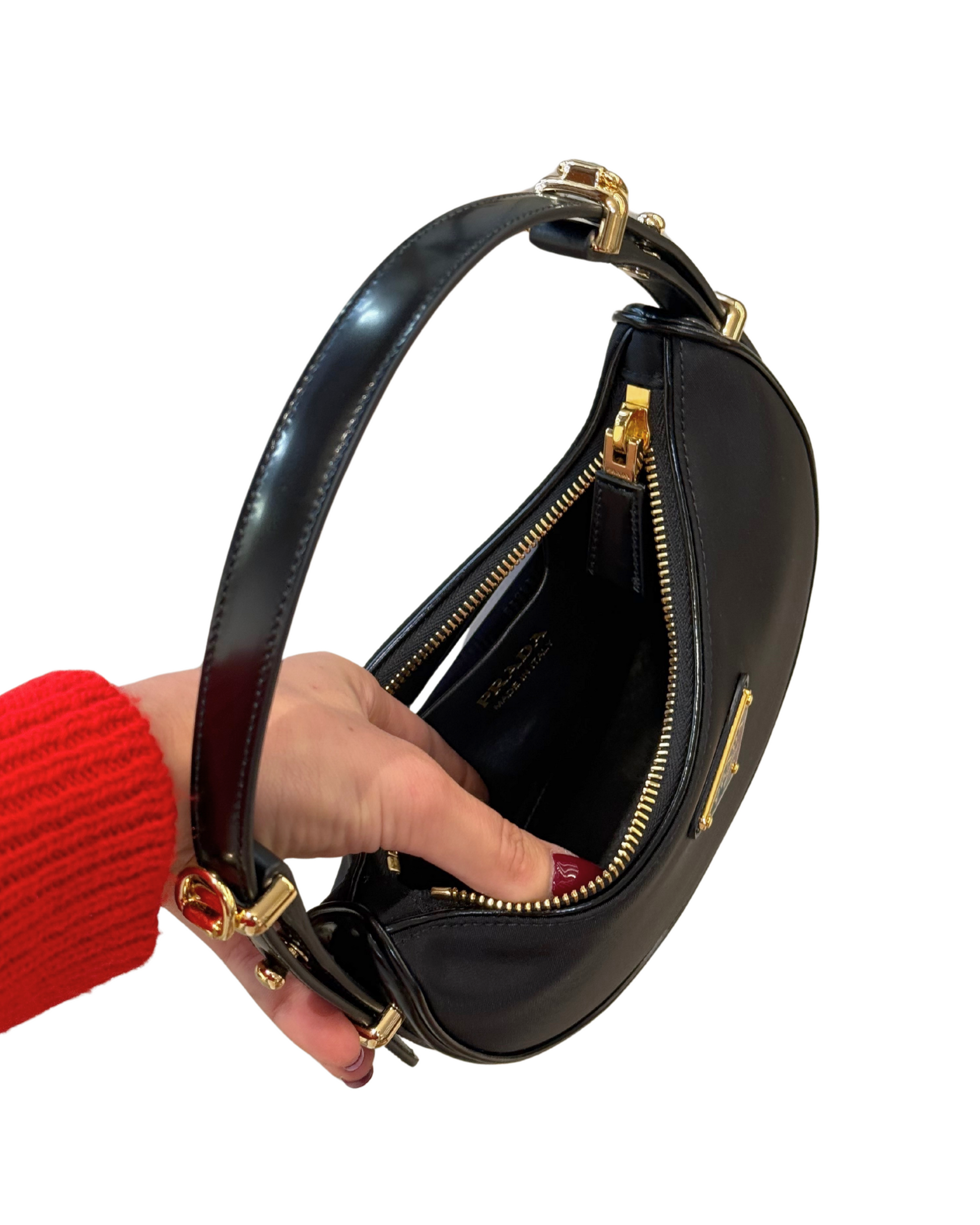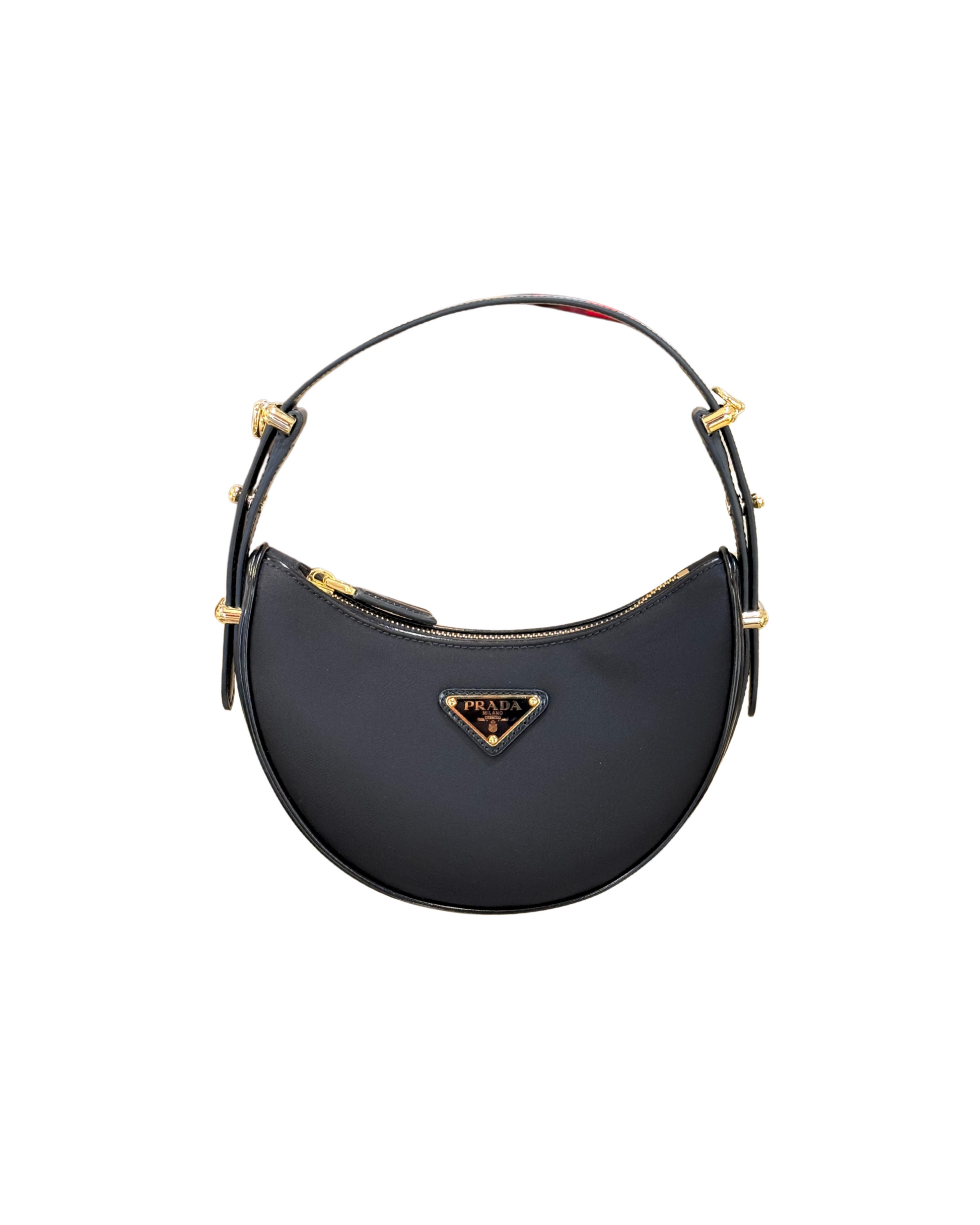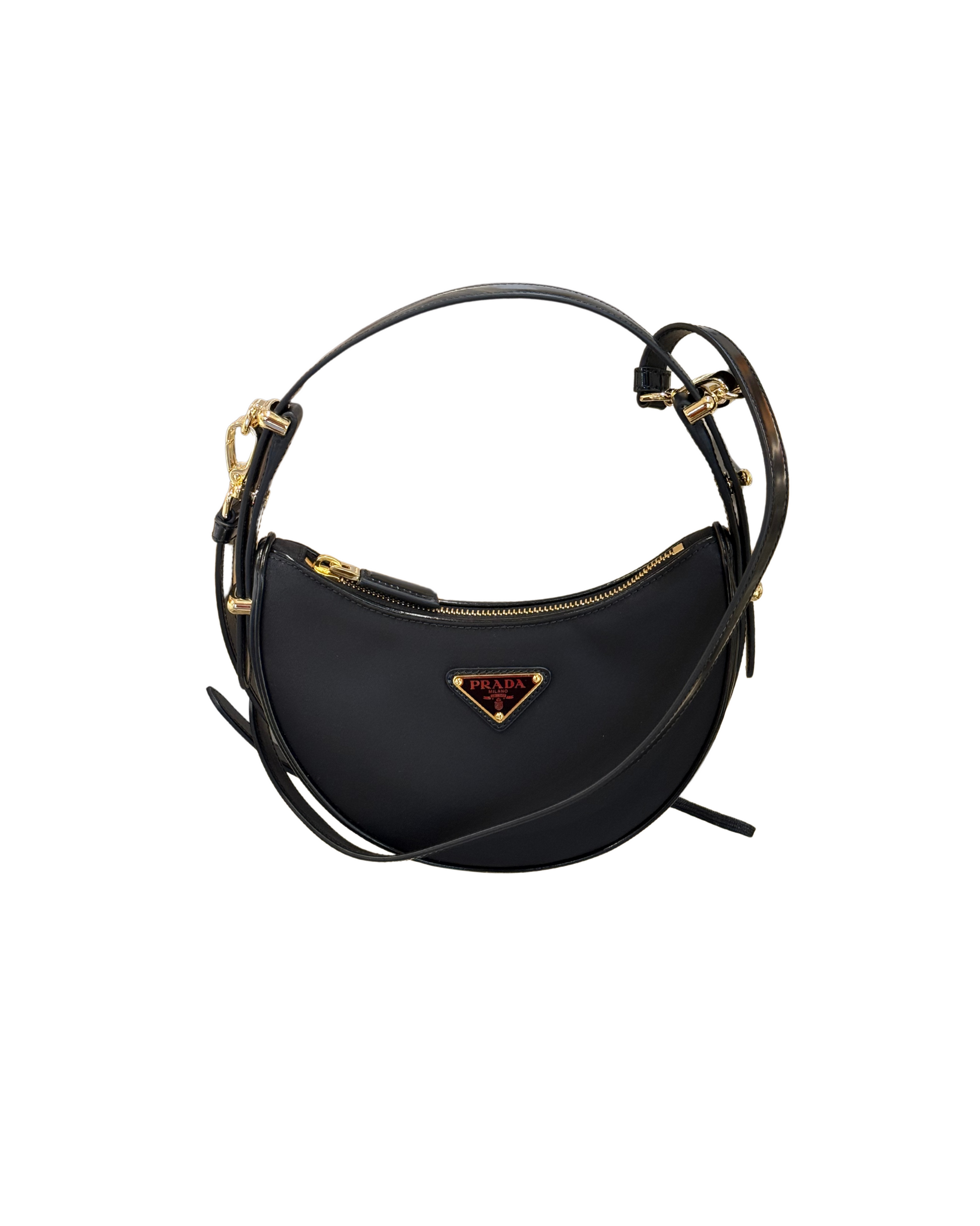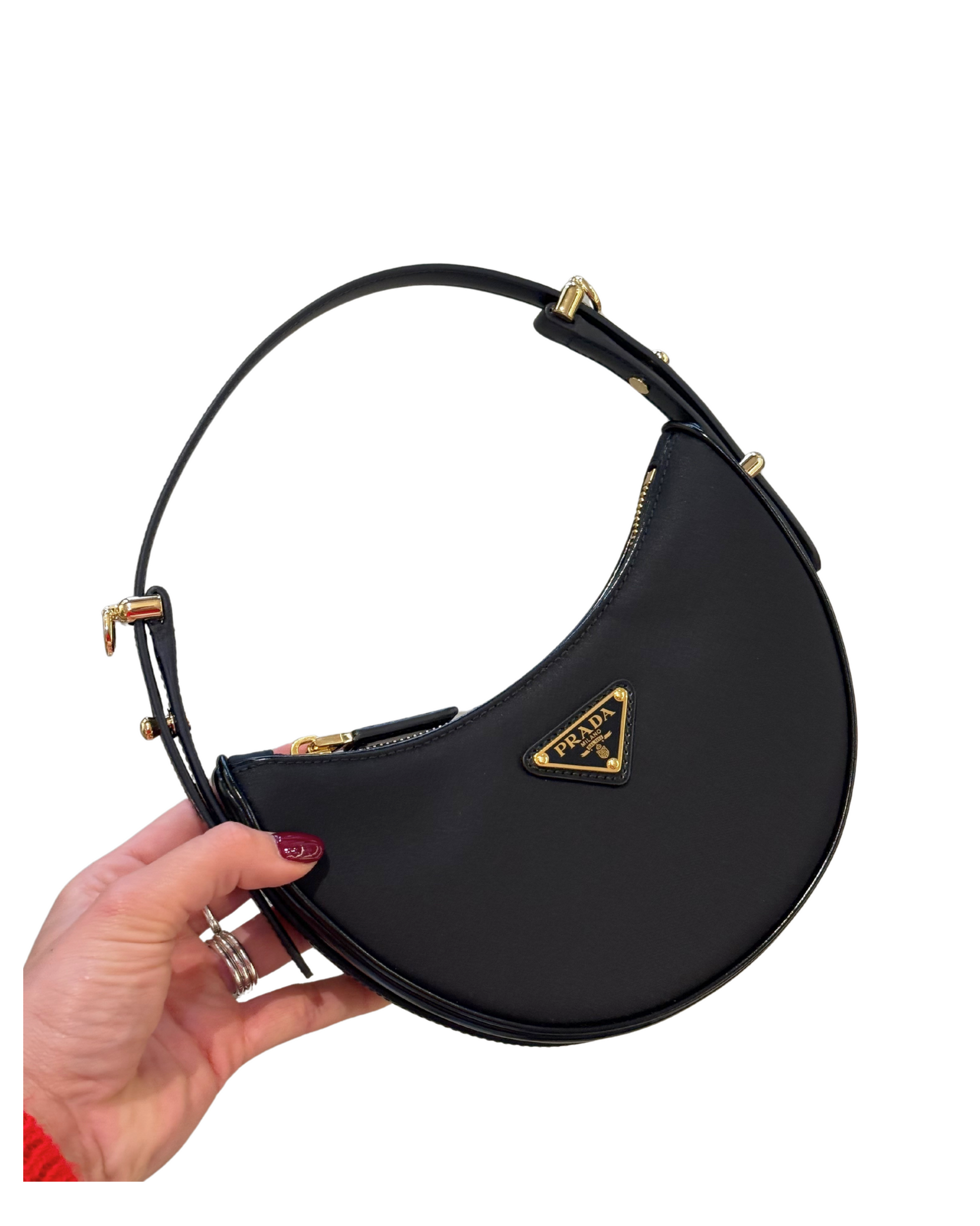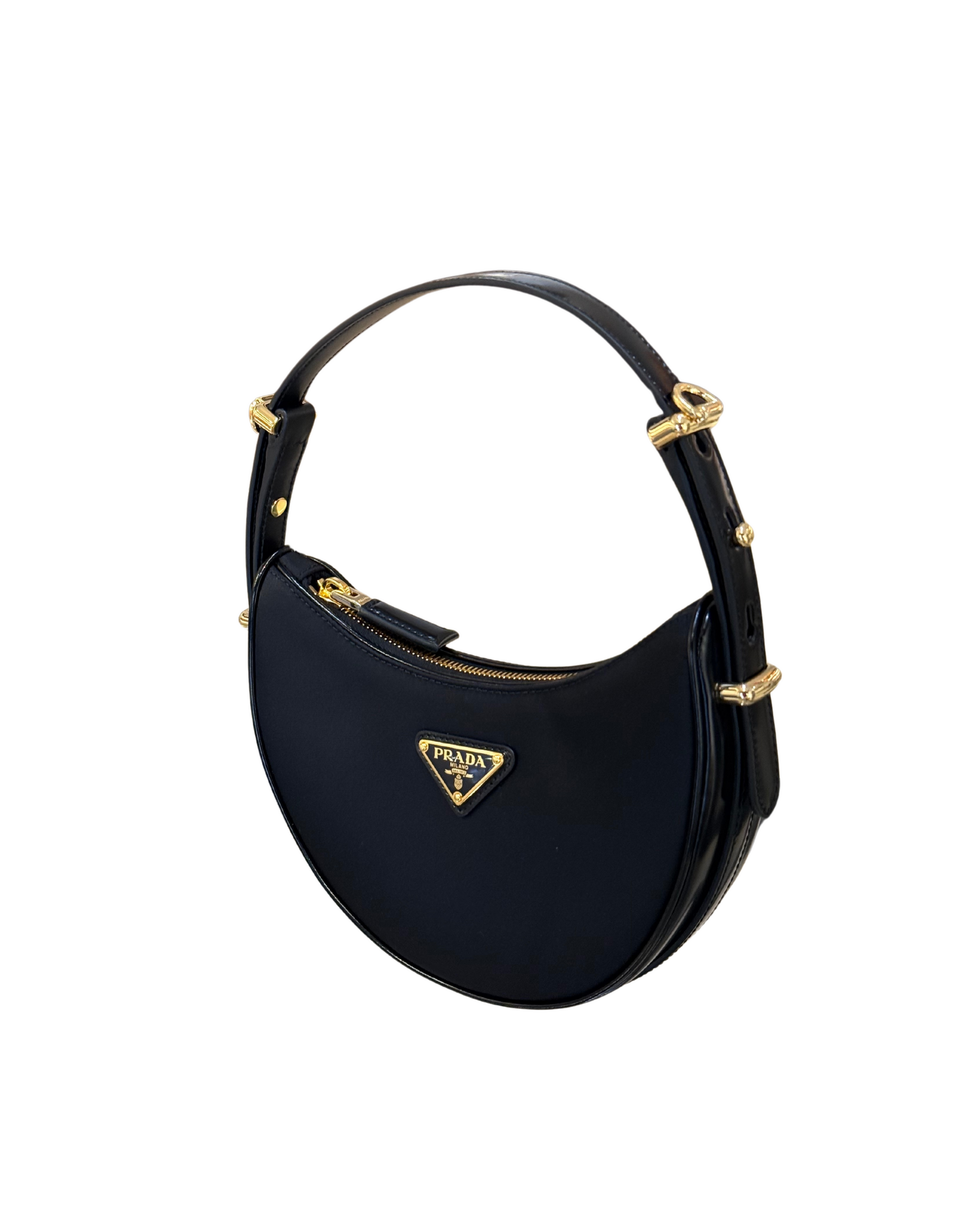 Arque small di Prada realizzata in tessuto tecnico con rifiniture in pelle nera lucida. Manico superiore in pelle. Logo lettering frontale. Tracolla in pelle amovibile e regolabile. Metalleria dorata. Apertura superiore con cerniera. Interno in pelle, taschina piatta.