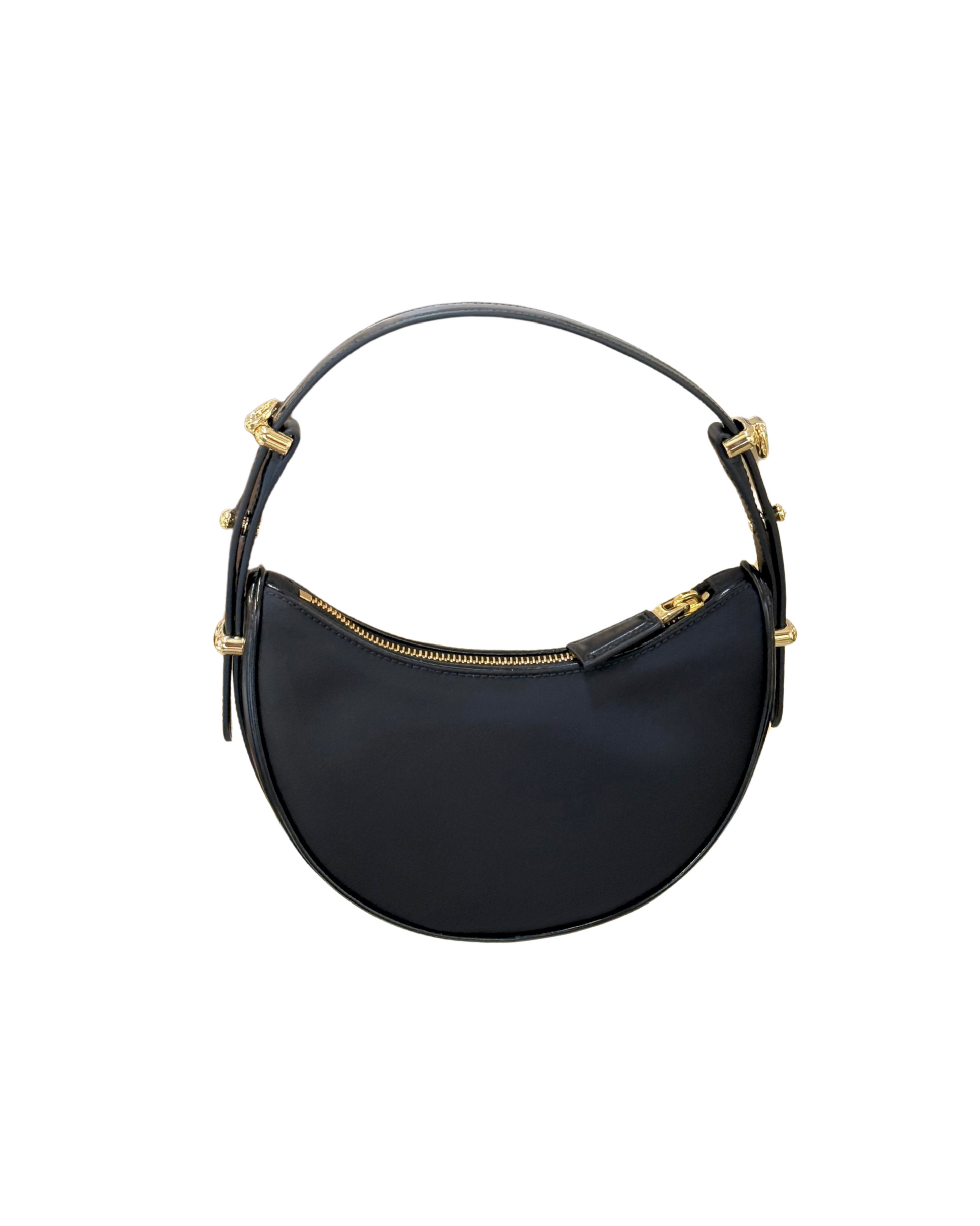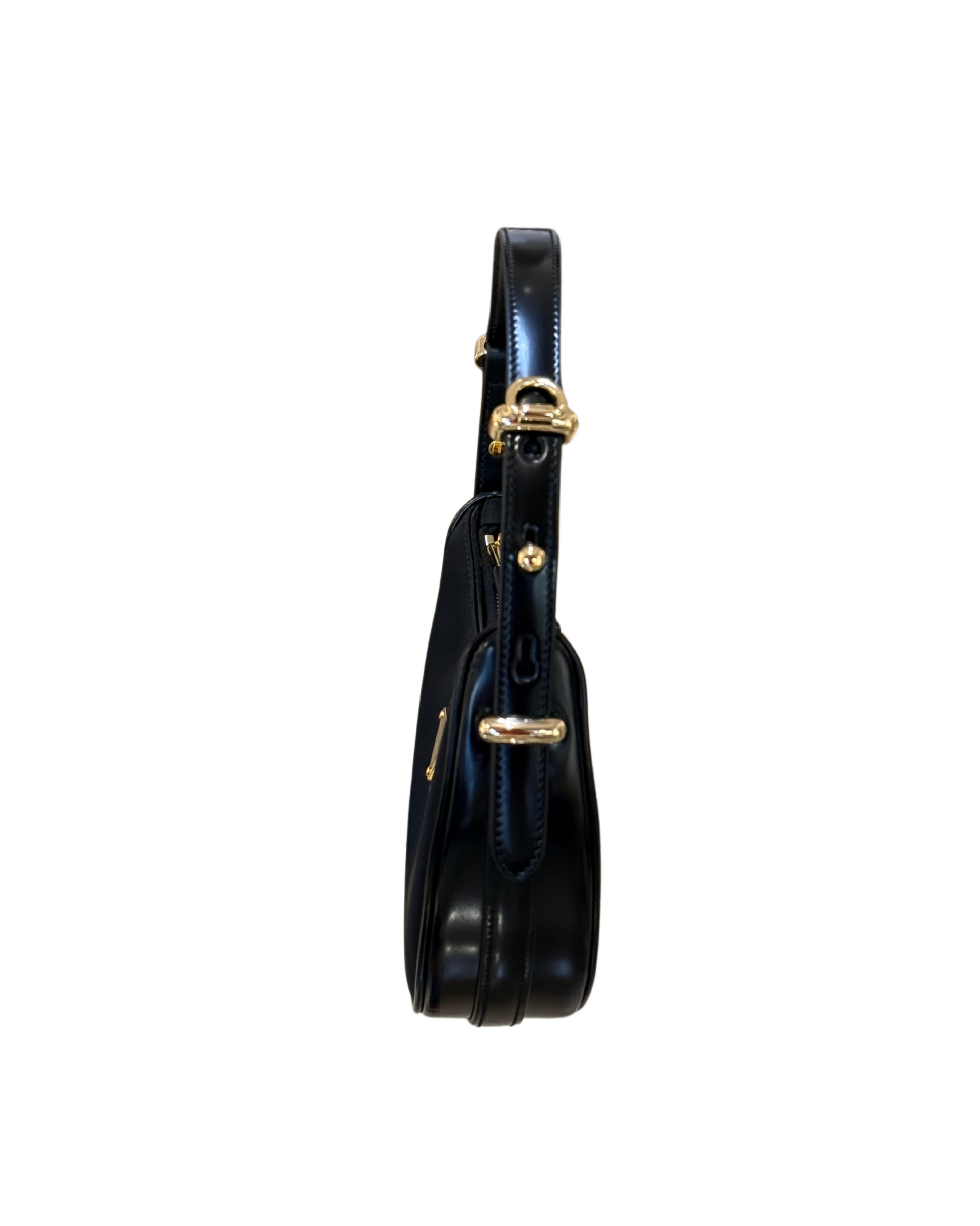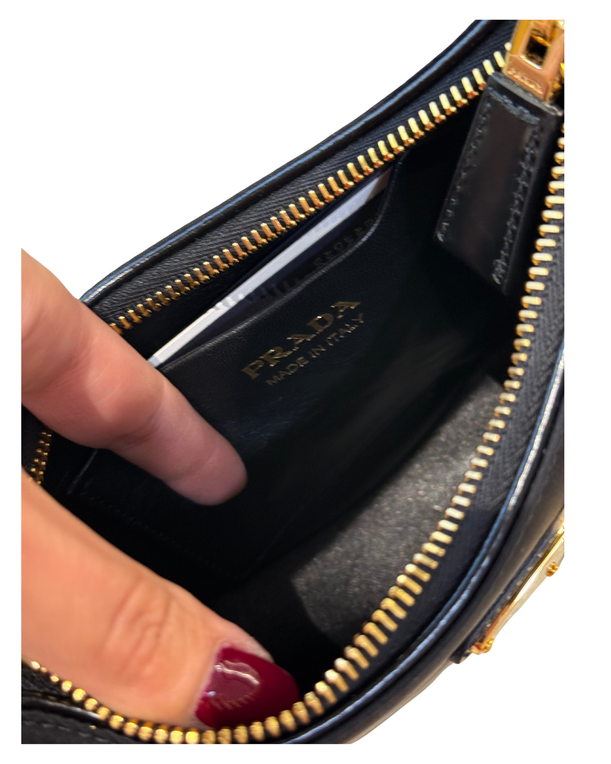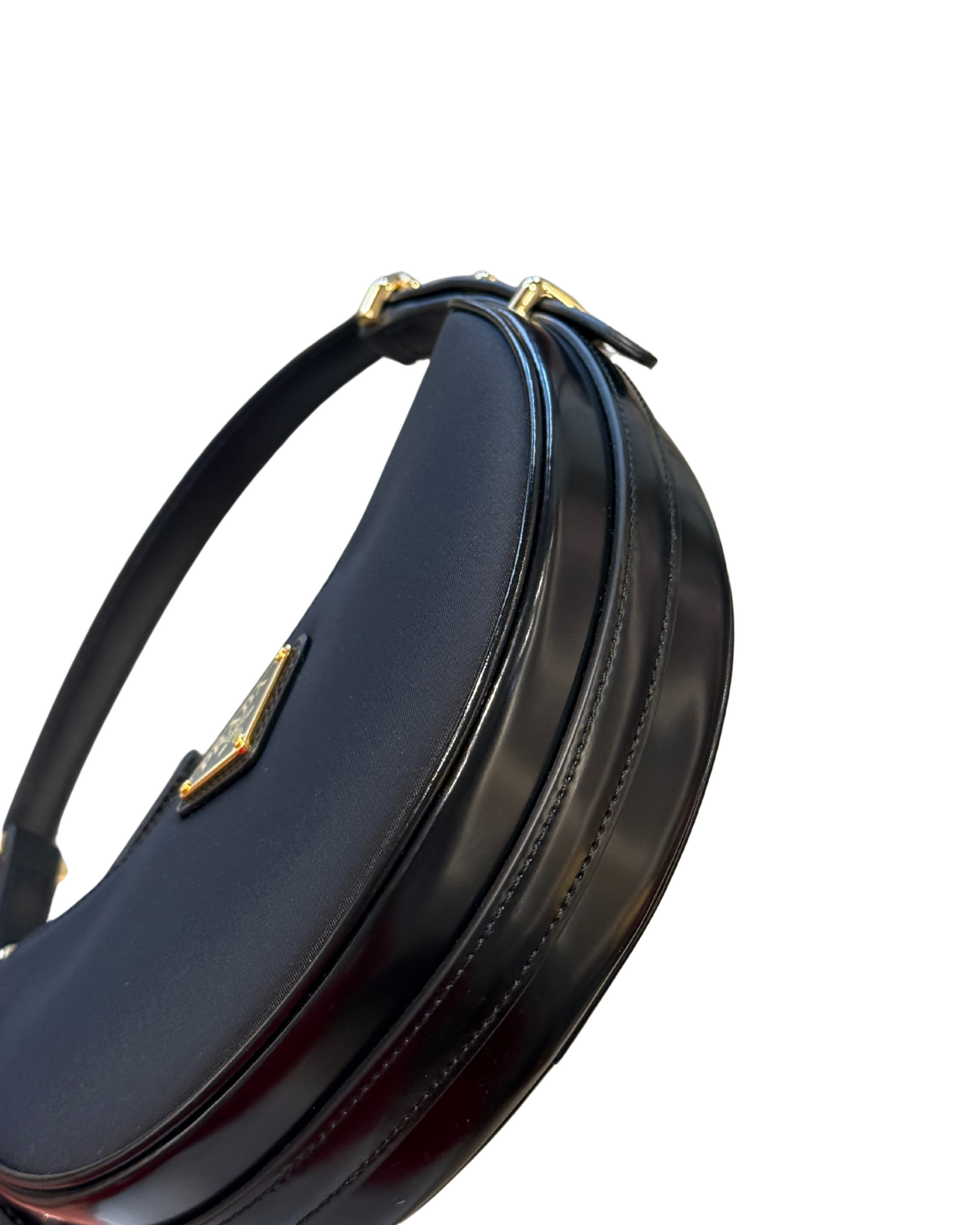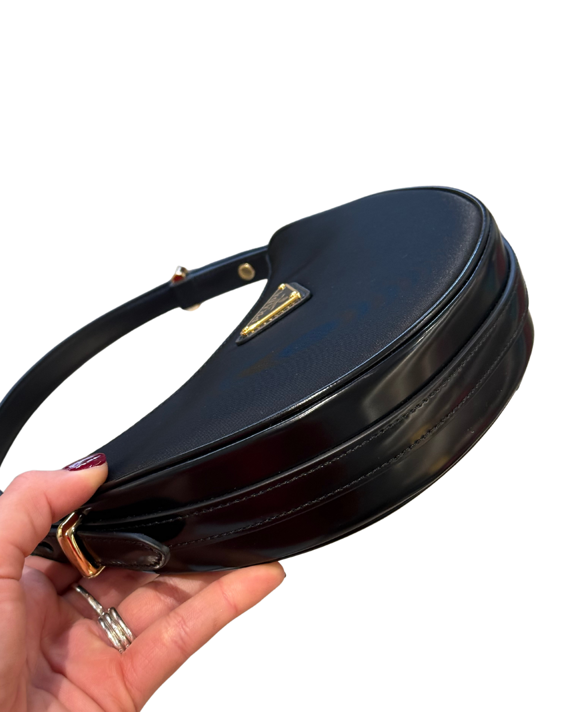 Arque small di Prada realizzata in tessuto tecnico con rifiniture in pelle nera lucida. Manico superiore in pelle. Logo lettering frontale. Tracolla in pelle amovibile e regolabile. Metalleria dorata. Apertura superiore con cerniera. Interno in pelle, taschina piatta.