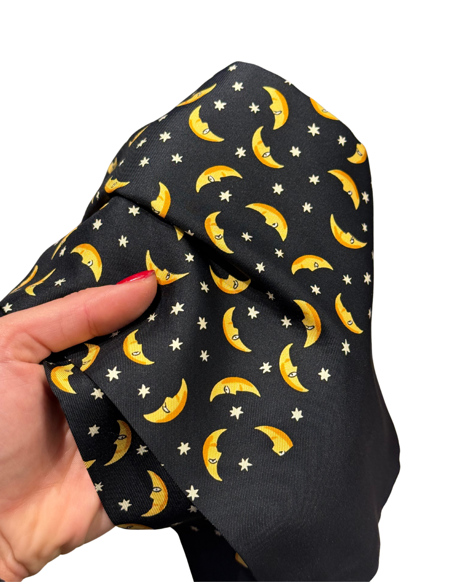 Ascot di Hermes da uomo ma bellissimo anche da donna, realizzato in seta. Sfondo nero con fantasia di lune crescenti giallo-oro alternate a piccole stelle bianche a cinque punte. 100% seta