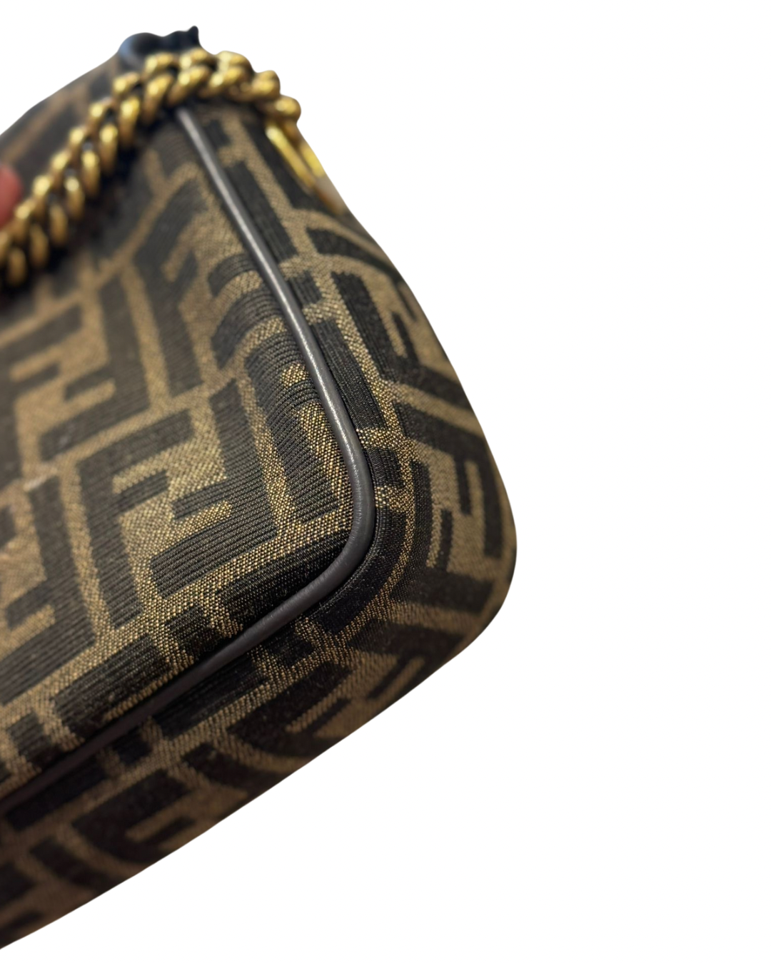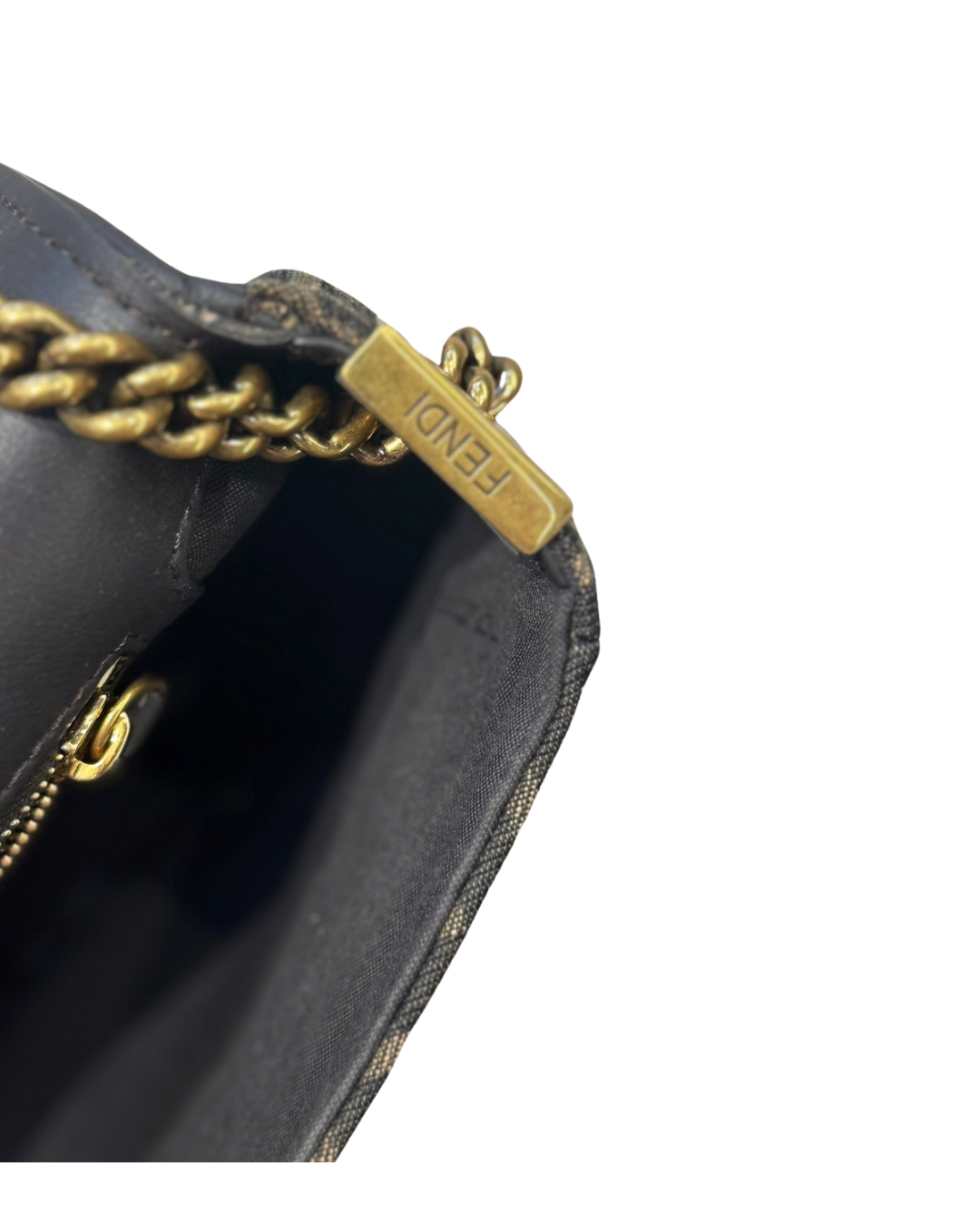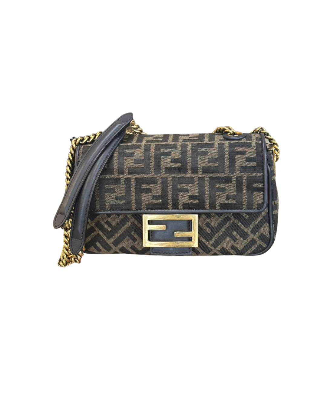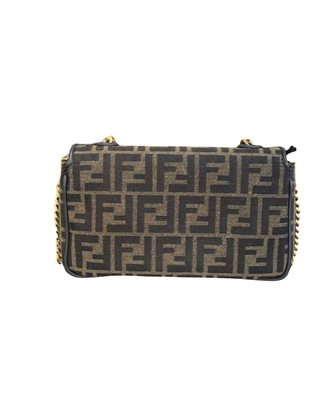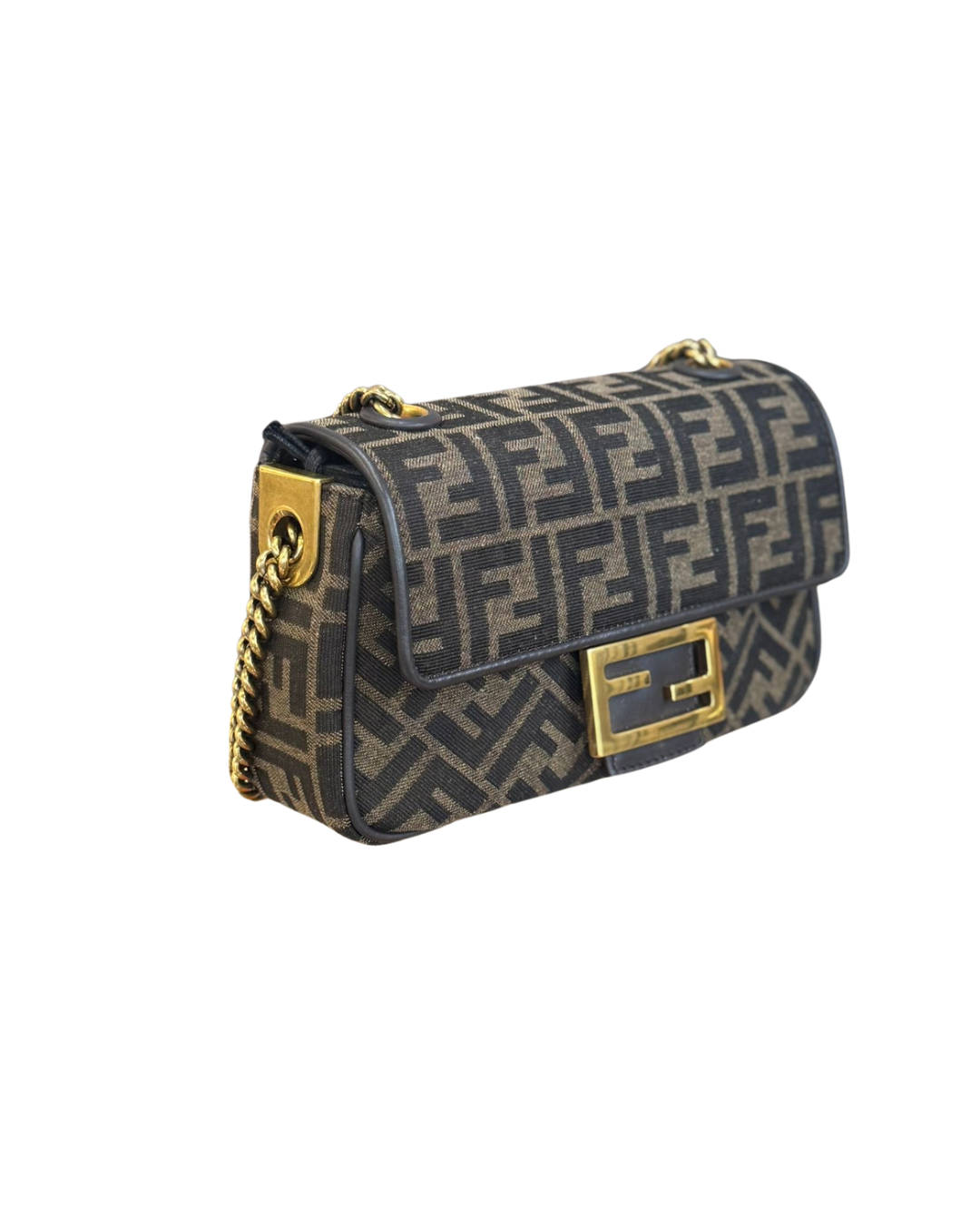 L’iconica silhouette della Baguette Fendi incontra il fascino senza tempo del motivo FF jacquard in questa versione raffinata e grintosa. Realizzata in tessuto canvas con stampa all over del logo doppia F, è impreziosita da dettagli in pelle e metalleria dorata antichizzata. Il flap con chiusura magnetica è arricchito dalla celebre fibbia FF, mentre la tracolla a catena intrecciata con pelle aggiunge un tocco di eleganza urbana, perfetta per il giorno e per la sera. Possibile utilizzarla a spalla o a tracolla. Interno in tessuto marrone locato, tasca con cerniera.