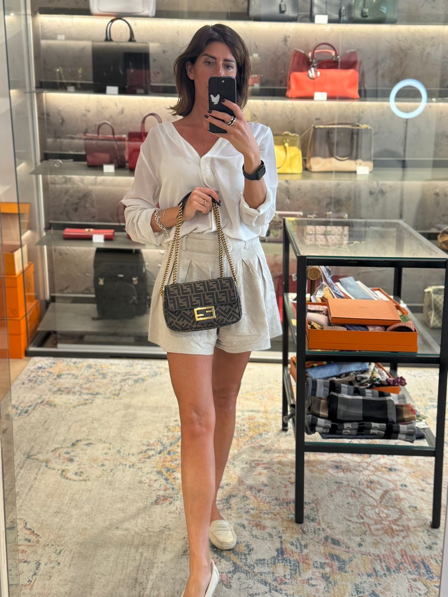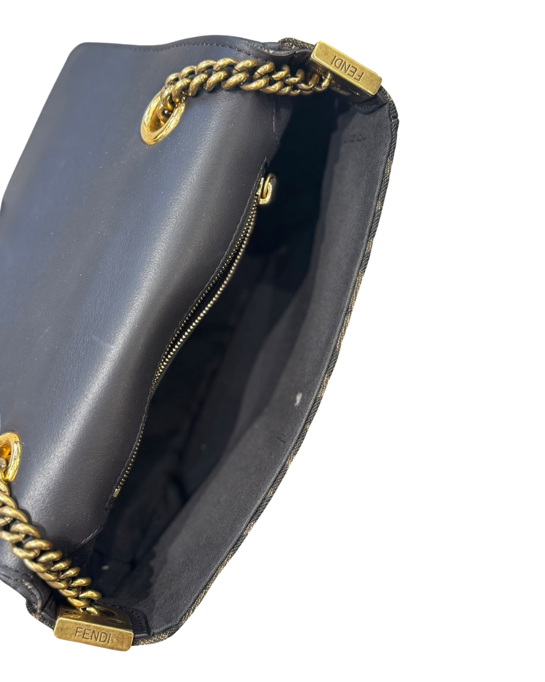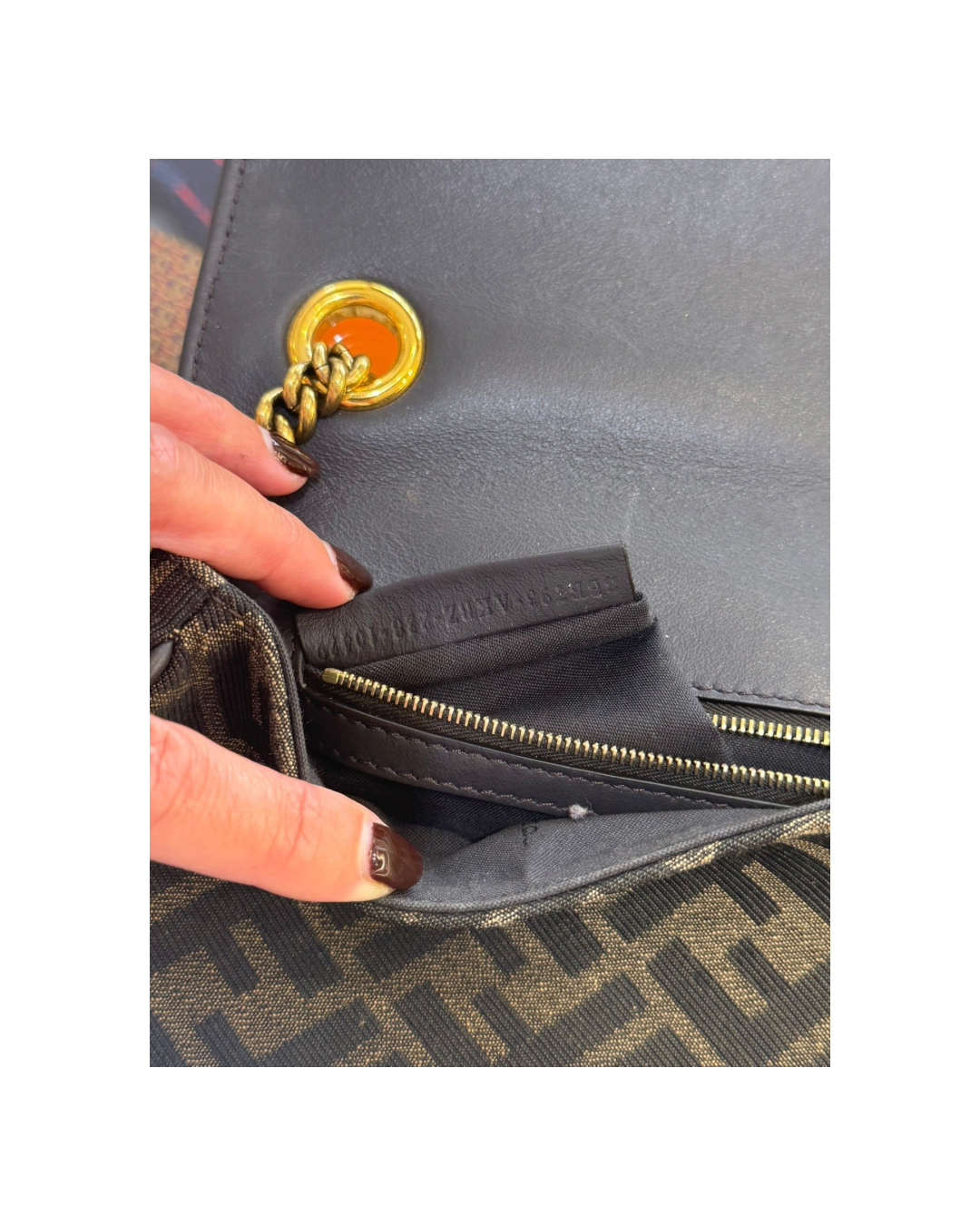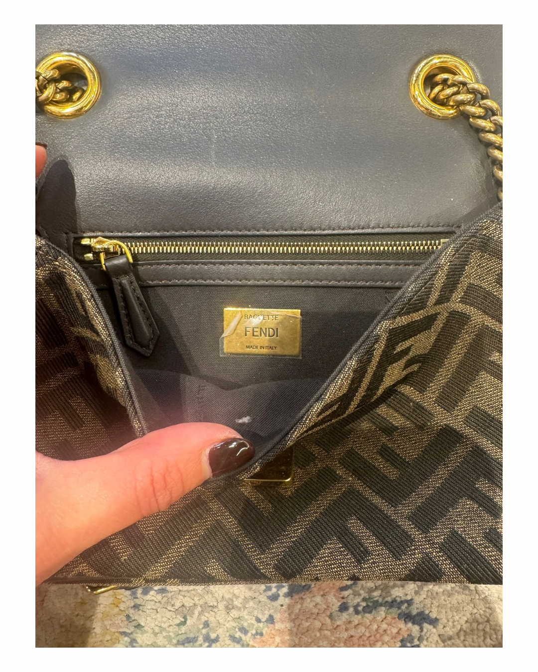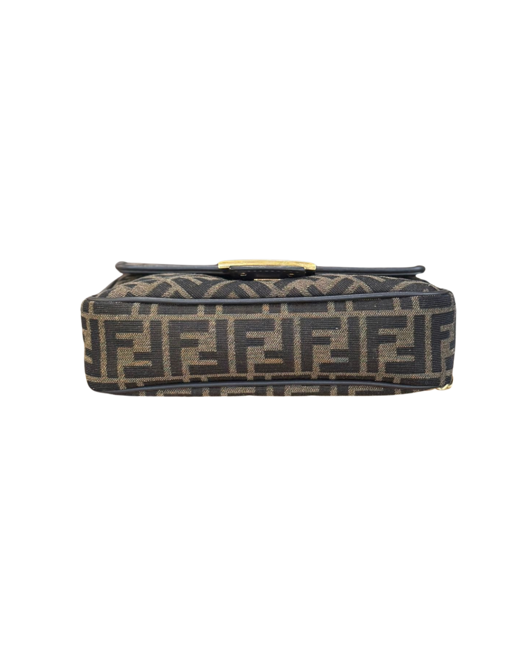 L’iconica silhouette della Baguette Fendi incontra il fascino senza tempo del motivo FF jacquard in questa versione raffinata e grintosa. Realizzata in tessuto canvas con stampa all over del logo doppia F, è impreziosita da dettagli in pelle e metalleria dorata antichizzata. Il flap con chiusura magnetica è arricchito dalla celebre fibbia FF, mentre la tracolla a catena intrecciata con pelle aggiunge un tocco di eleganza urbana, perfetta per il giorno e per la sera. Possibile utilizzarla a spalla o a tracolla. Interno in tessuto marrone locato, tasca con cerniera.