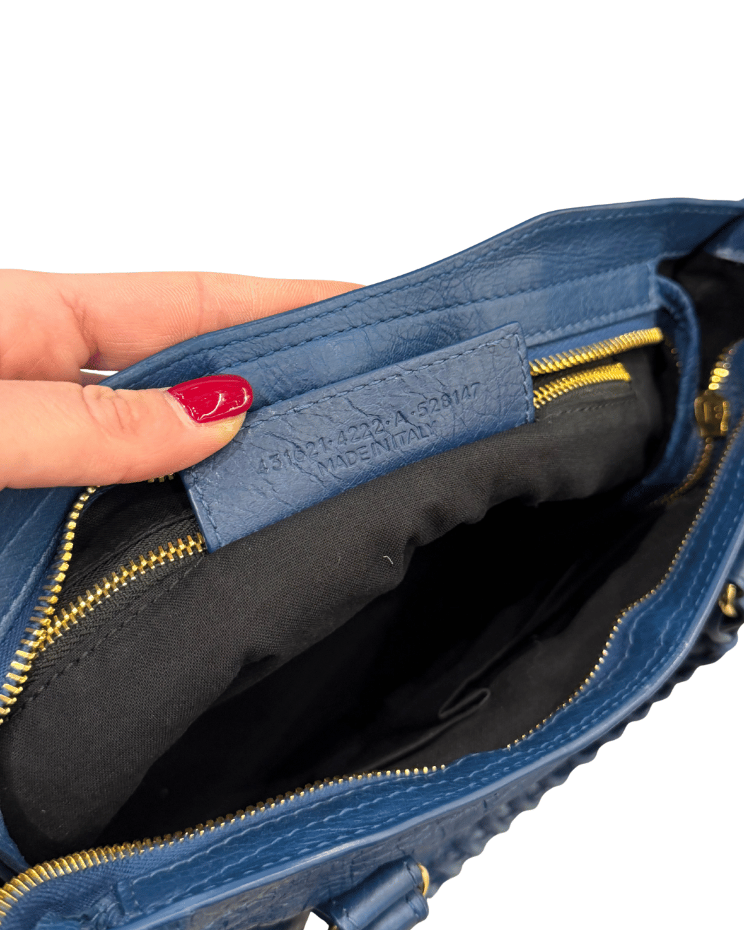 Balenciaga City realizzata in morbida pelle blu con tipica finitura leggermente stropicciata, cifra distintiva del modello e della Maison. La struttura è morbida ma ben definita, arricchita da dettagli iconici come le fibbie con rivetti, la zip frontale con tasca esterna e i lacci in pelle che incorniciano i manici. Metalleria dorata. L’interno è foderato in tessuto nero e dotato di tasca con zip, perfetto per l’uso quotidiano. Può essere portata a mano o a tracolla grazie alla tracolla removibile, adattandosi con naturalezza a diverse esigenze. (codice: 431621 . 4222 . A . 528147)