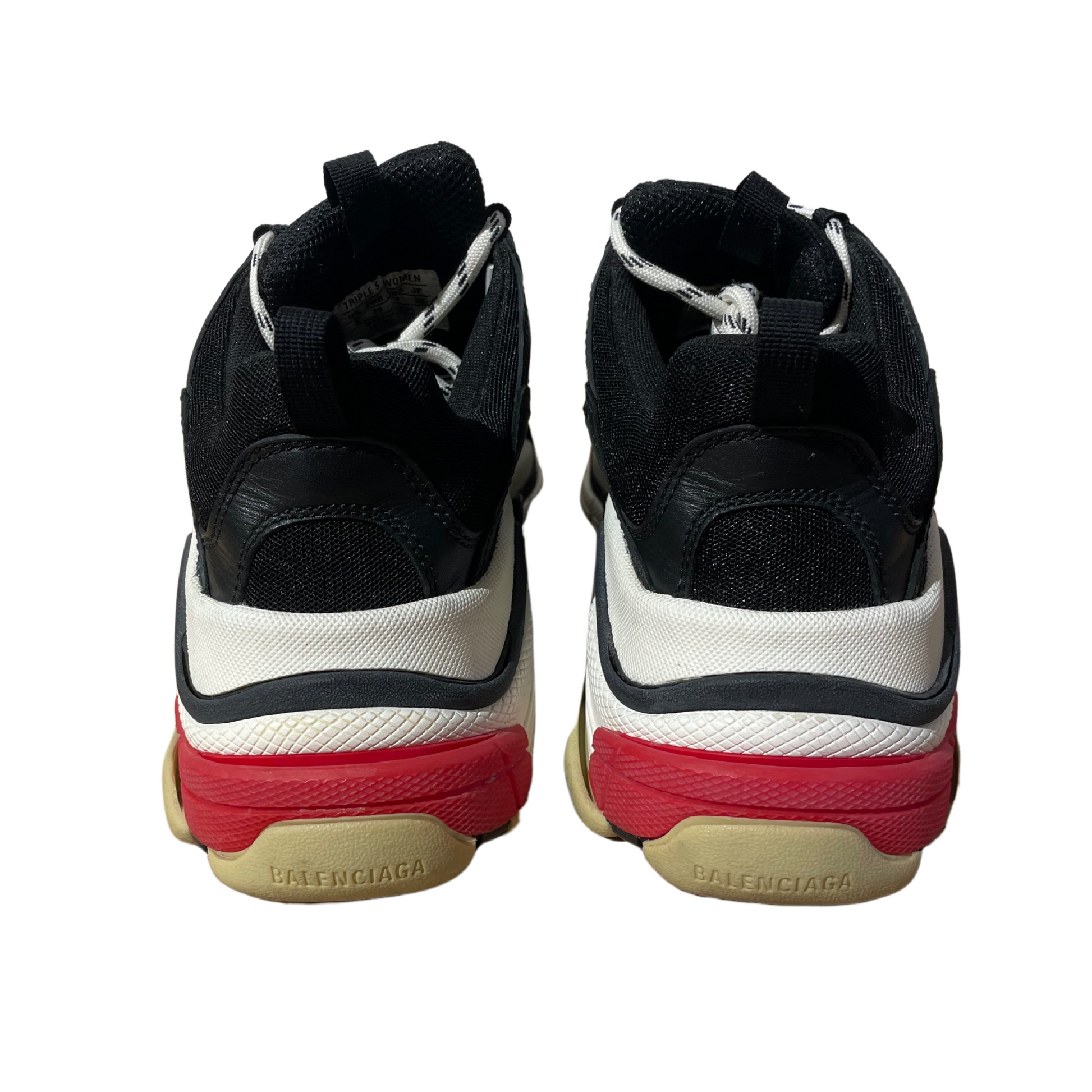 Sneakers di Balenciaga, City Triple S . Tomaia in pelle e tela mesh. Suola scolpita in gomma rossa bianca e nera. Allacciatura frontale, lacci bianchi e neri. Logo laterale ricamato , logo impresso nel retro.