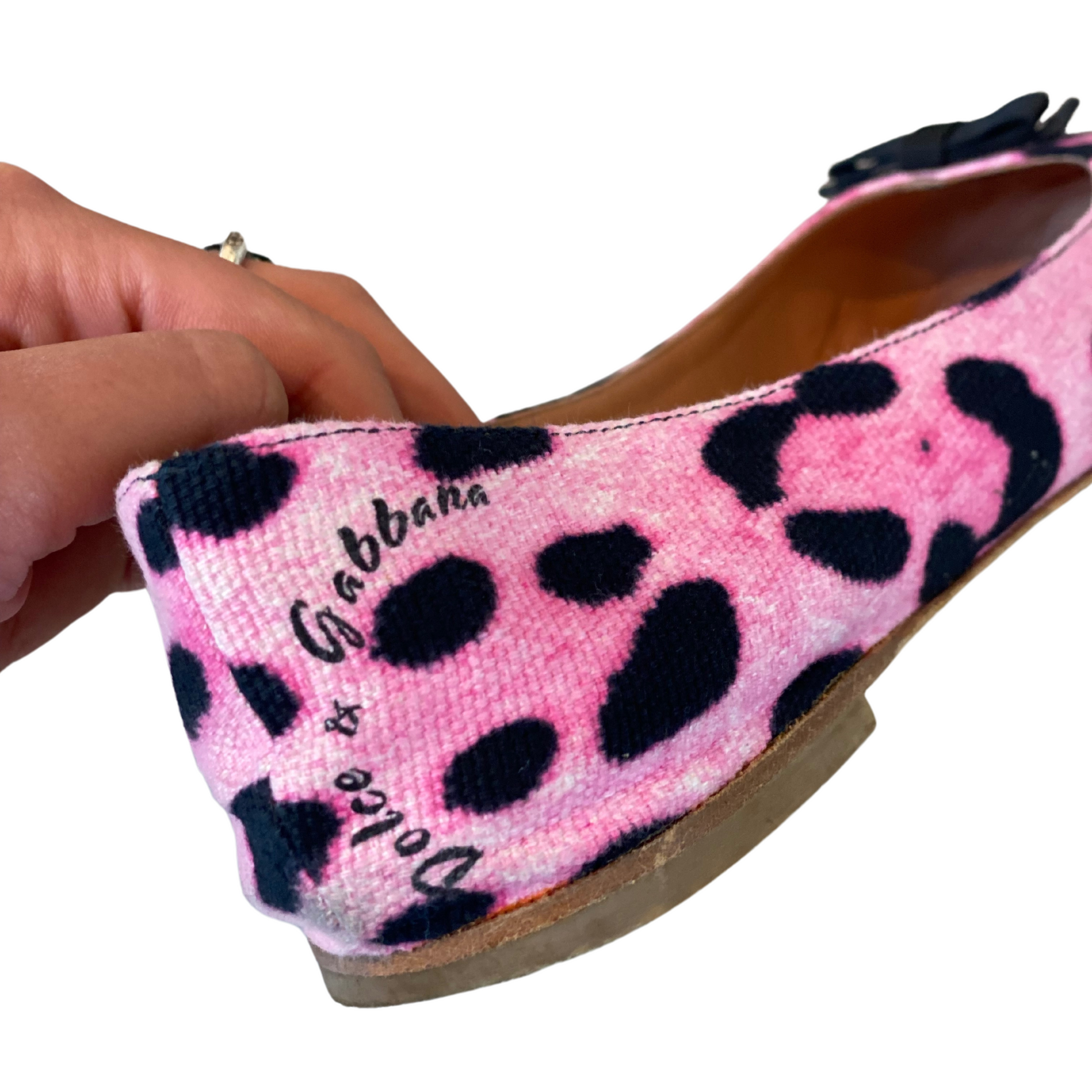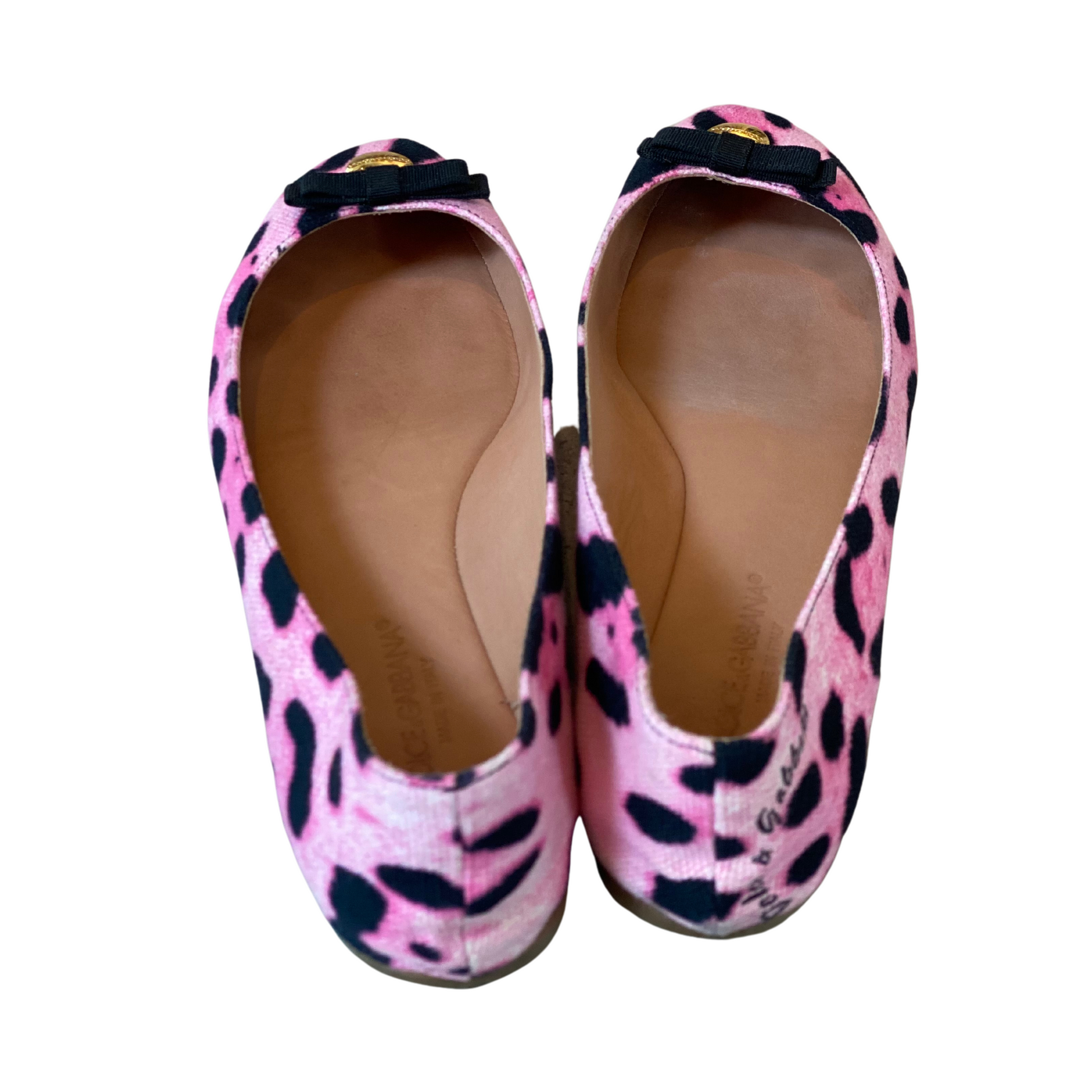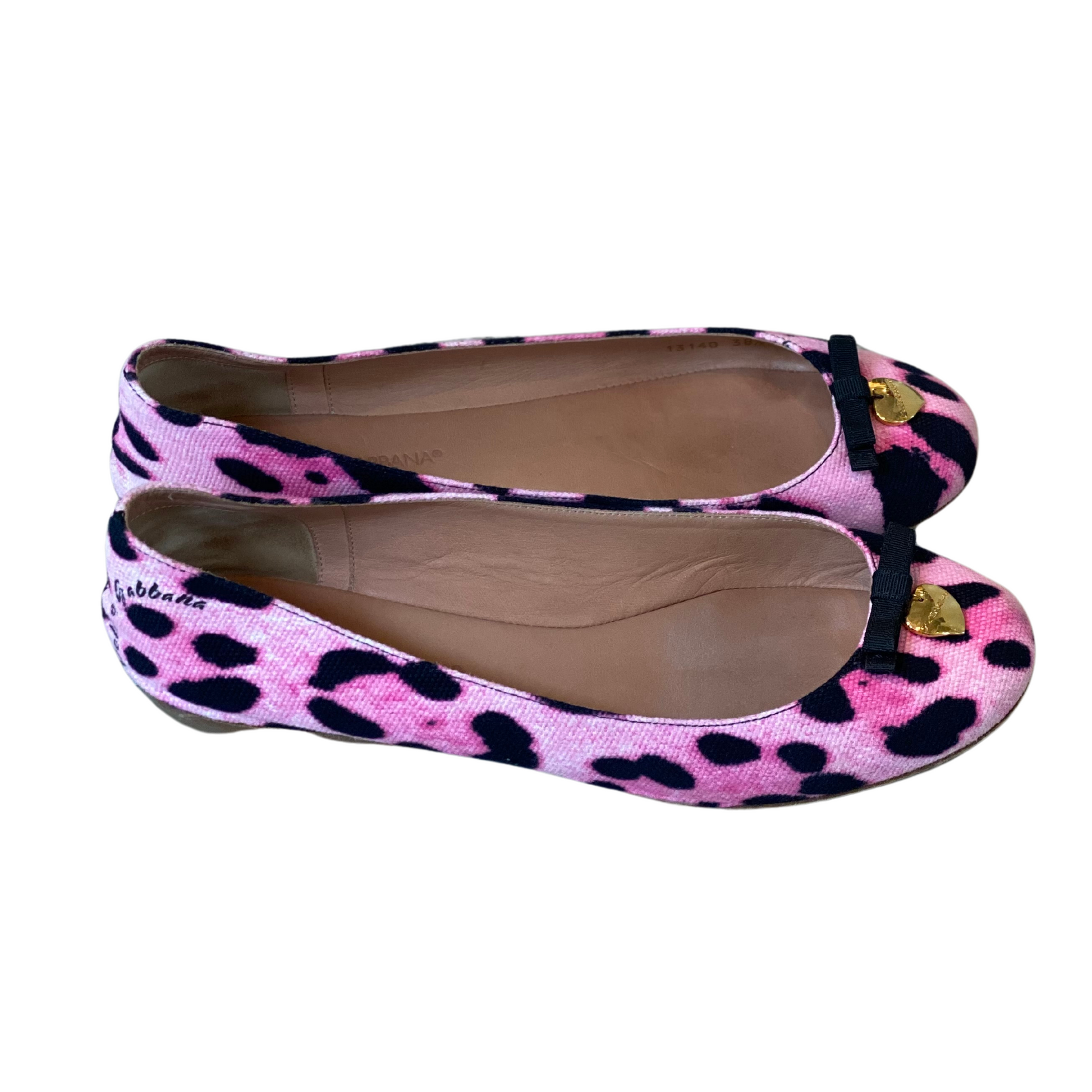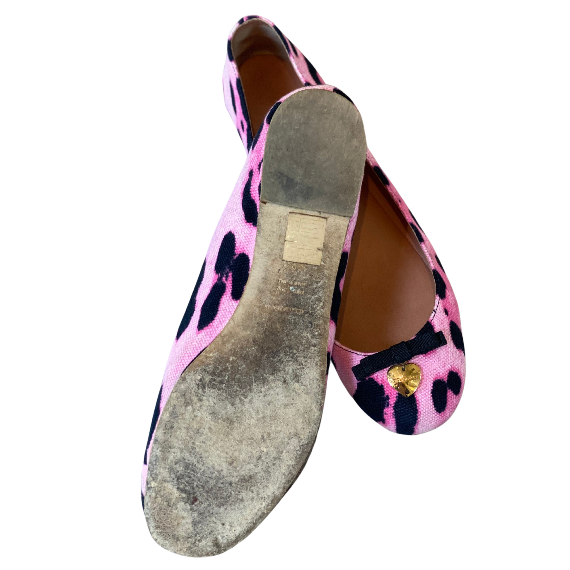 Ballerine Dolce&Gabbana rosa con trama maculata . Prive di tacco. Impreziosite frontalmente da fiocchetto nero e ciondolo a forma di cuore in metallo dorato con logo inciso. Interno in pelle beige, Suola in cuoio.