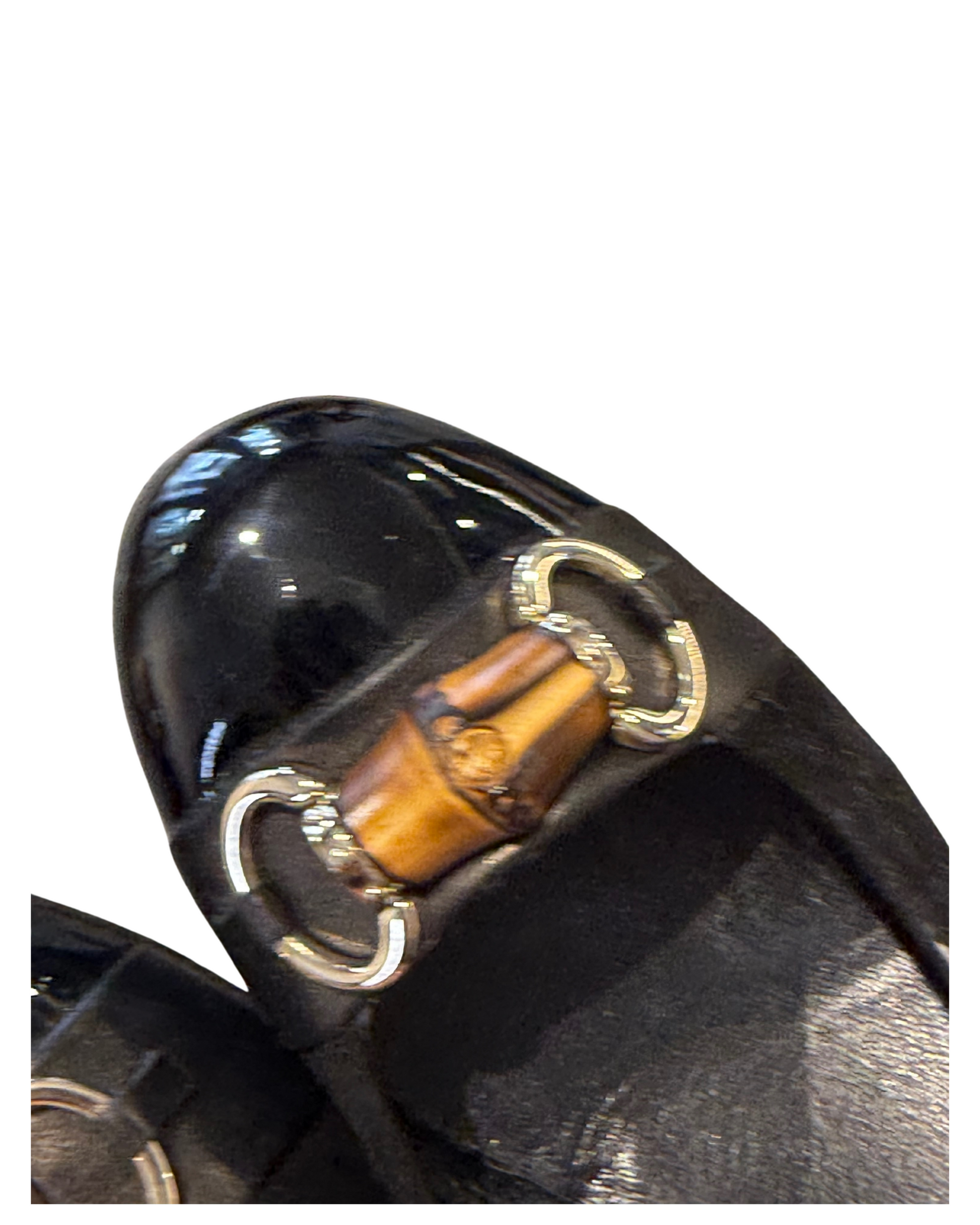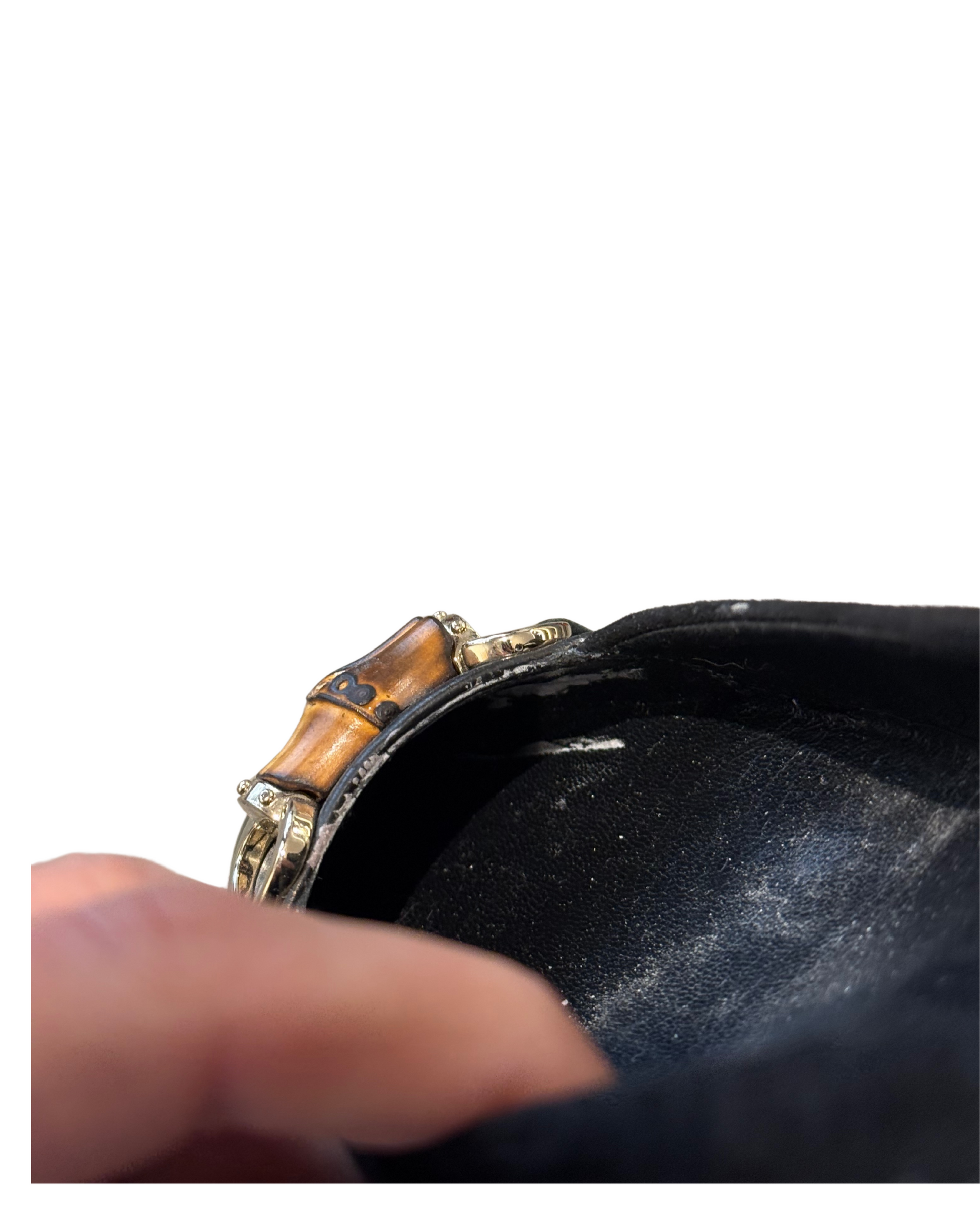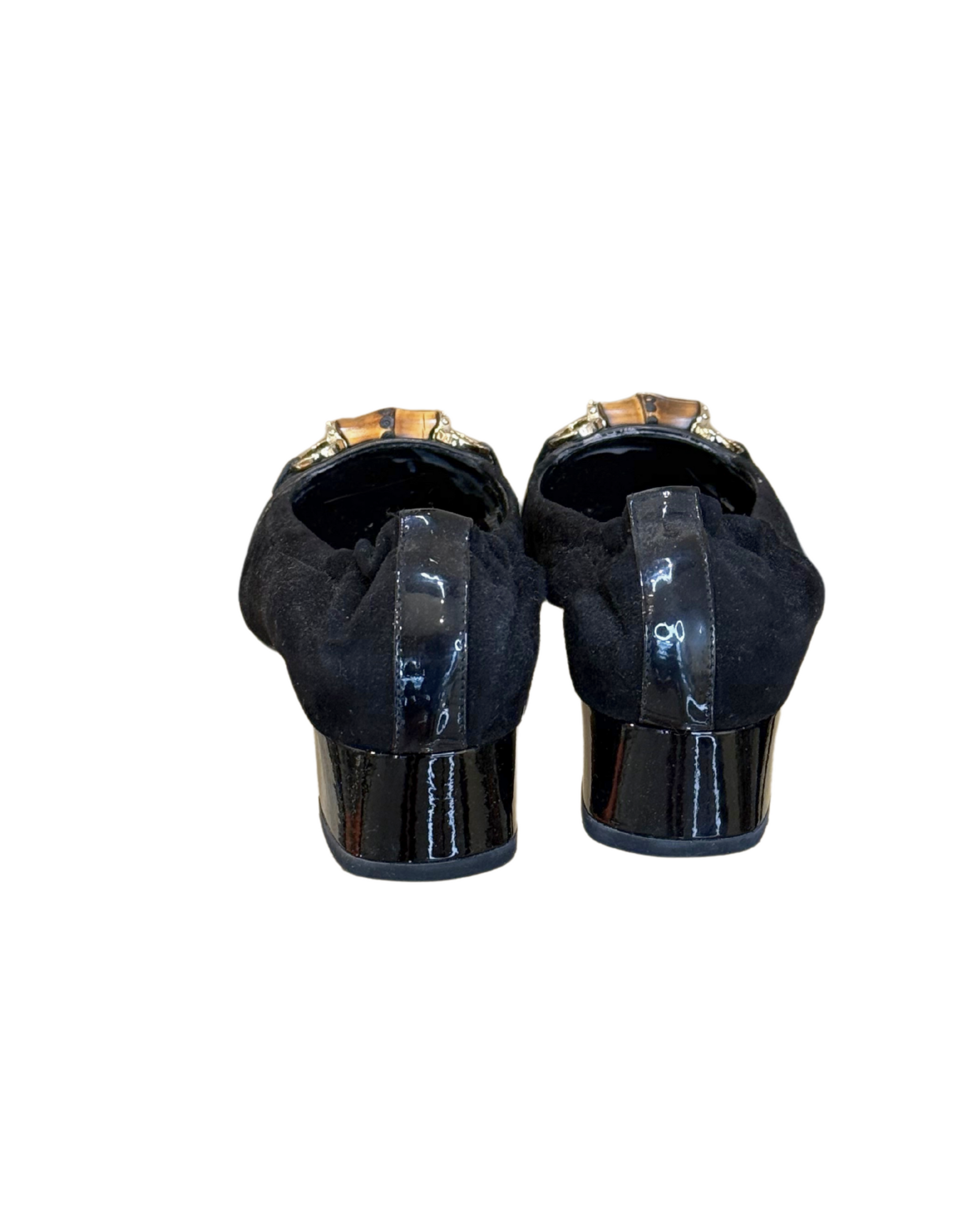 Eleganza discreta e dettagli iconici per queste ballerine firmate Gucci. Realizzate in morbido suede nero, arricchite da punta in vernice lucida e impreziosite dall'inconfondibile ferro di cavallo con inserto bamboo sulla parte frontale.Il modello presenta un tacco basso squadrato, ideale per slanciare senza rinunciare alla comodità.