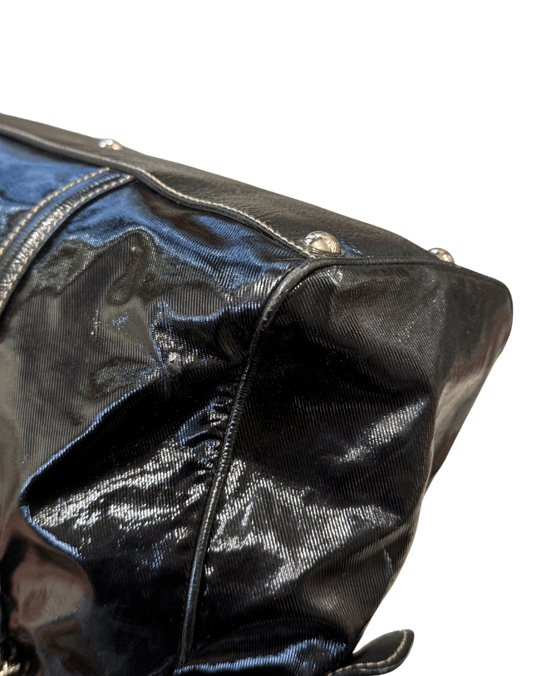Questa borsa Gucci è un modello iconico che unisce carattere e praticità. Realizzata in PVC lucido nero, con riflessi cangianti e dettagli in pelle nera a contrasto, è un accessorio che non passa inosservato. Sul frontale spicca l’iconico logo GG dorato con nastro web verde e rosso, emblema inconfondibile della Maison. La struttura è morbida ma resistente, con chiusura superiore a doppia zip e piedini metallici sul fondo per garantire maggiore protezione. All’interno, la fodera logata offre un ampio spazio capiente, perfetto per accompagnarti nelle giornate più intense o come pratica borsa da viaggio. (codice 170010 – 212792)