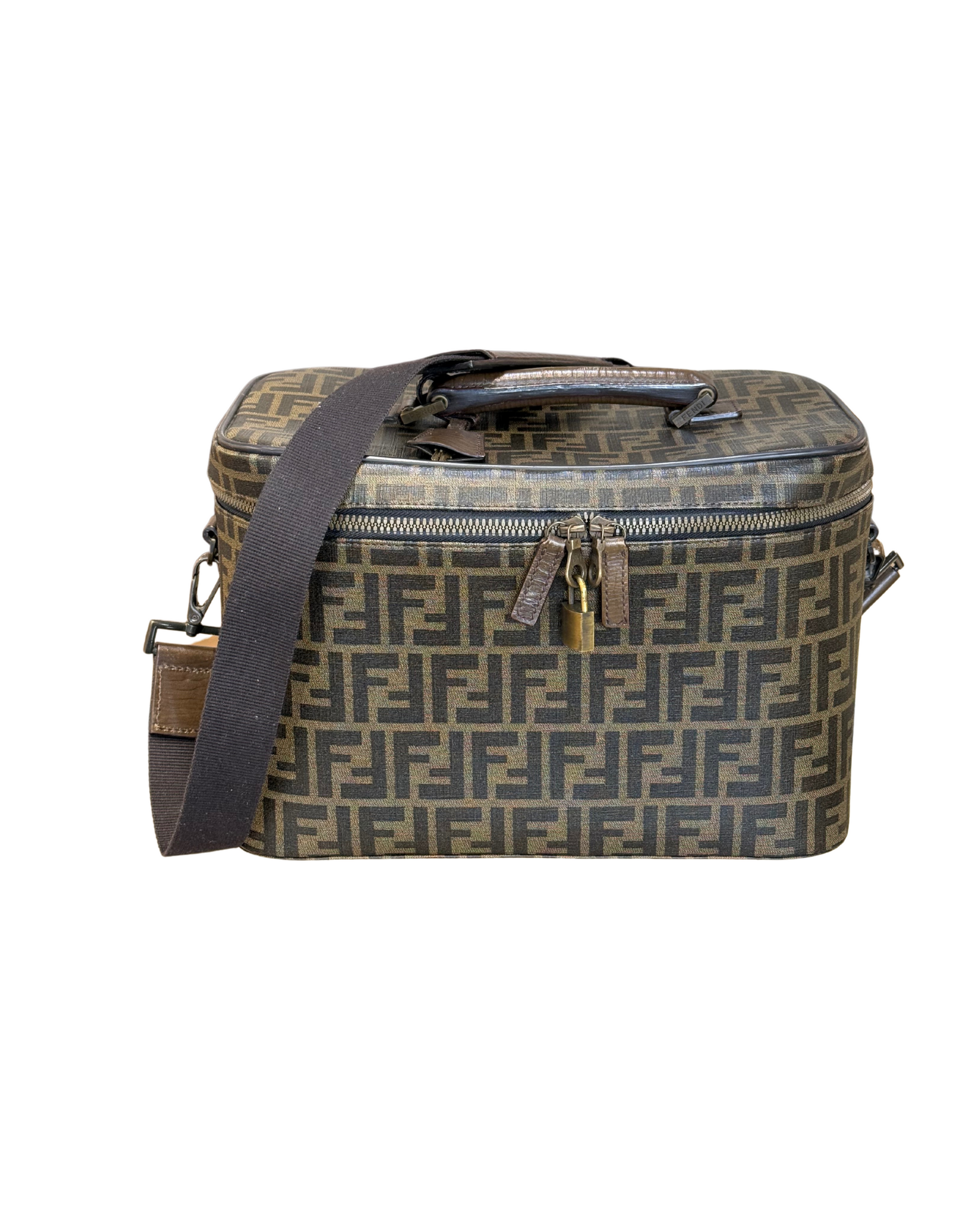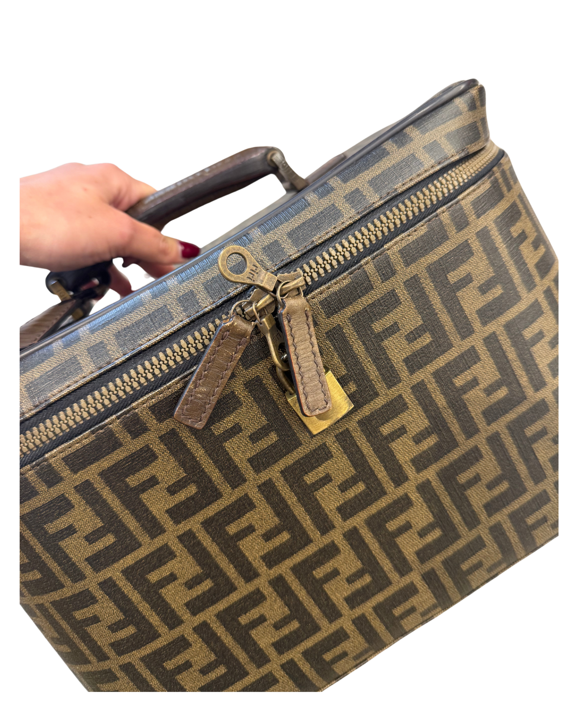 Iconico, spazioso e dal fascino vintage, questo beauty case Fendi è un must per le amanti del lusso anche in viaggio. Realizzato in resistente tela con il celebre motivo FF Zucca su sfondo marrone e metalleria in ottone anticato. Manico rigido superiore, tracolla in tessuto regolabile ed amovibile. Zip con doppio cursore e lucchetto. All'interno presenta una struttura funzionale con elastici portaoggetti e una tasca piatta, ideale per organizzare al meglio i tuoi prodotti di bellezza o da toeletta. Perfetto come beauty case, mini bag da viaggio o anche come elemento decorativo raffinato.