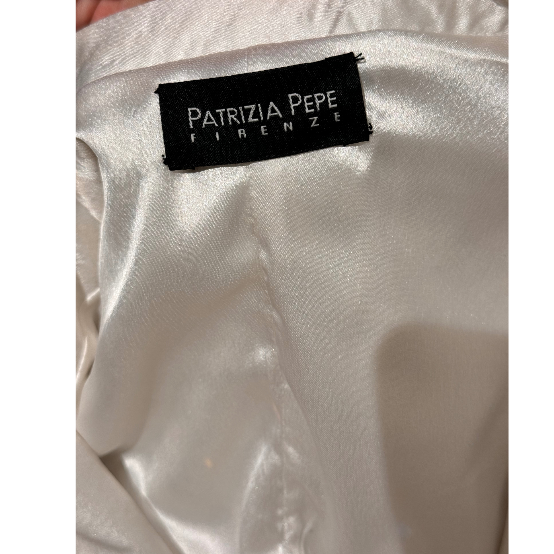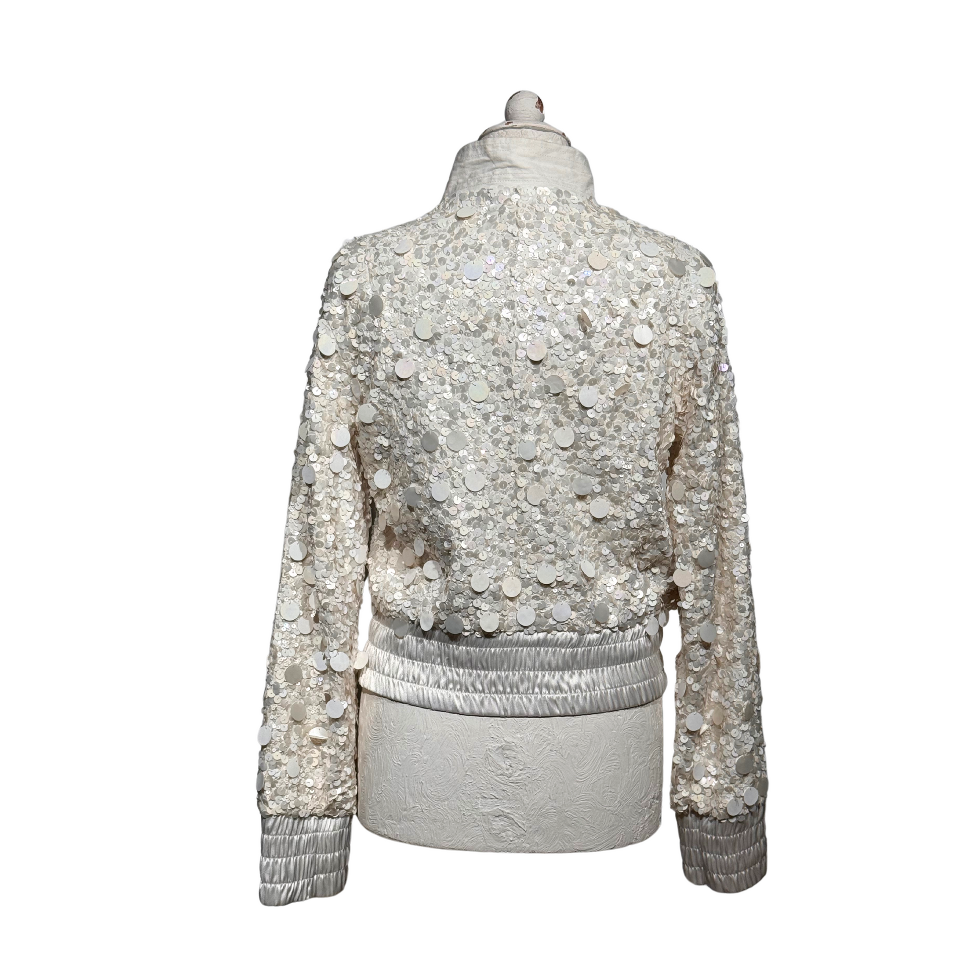 Bomber di Patrizia Pepe bianco impreziosito da paillettes di diverse dimensioni. Elastici in corrispondenza dei polsi e della vita. tasche laterali.