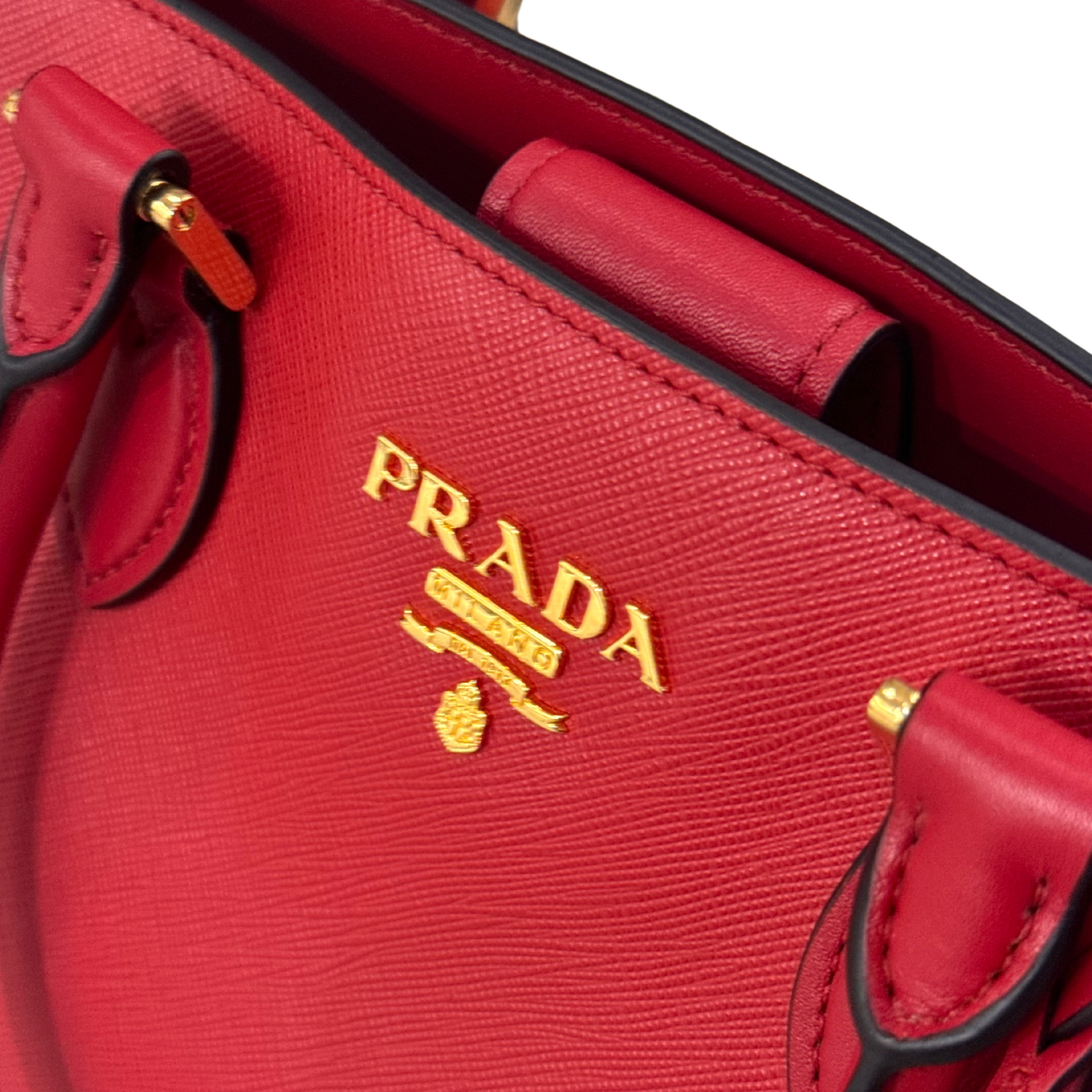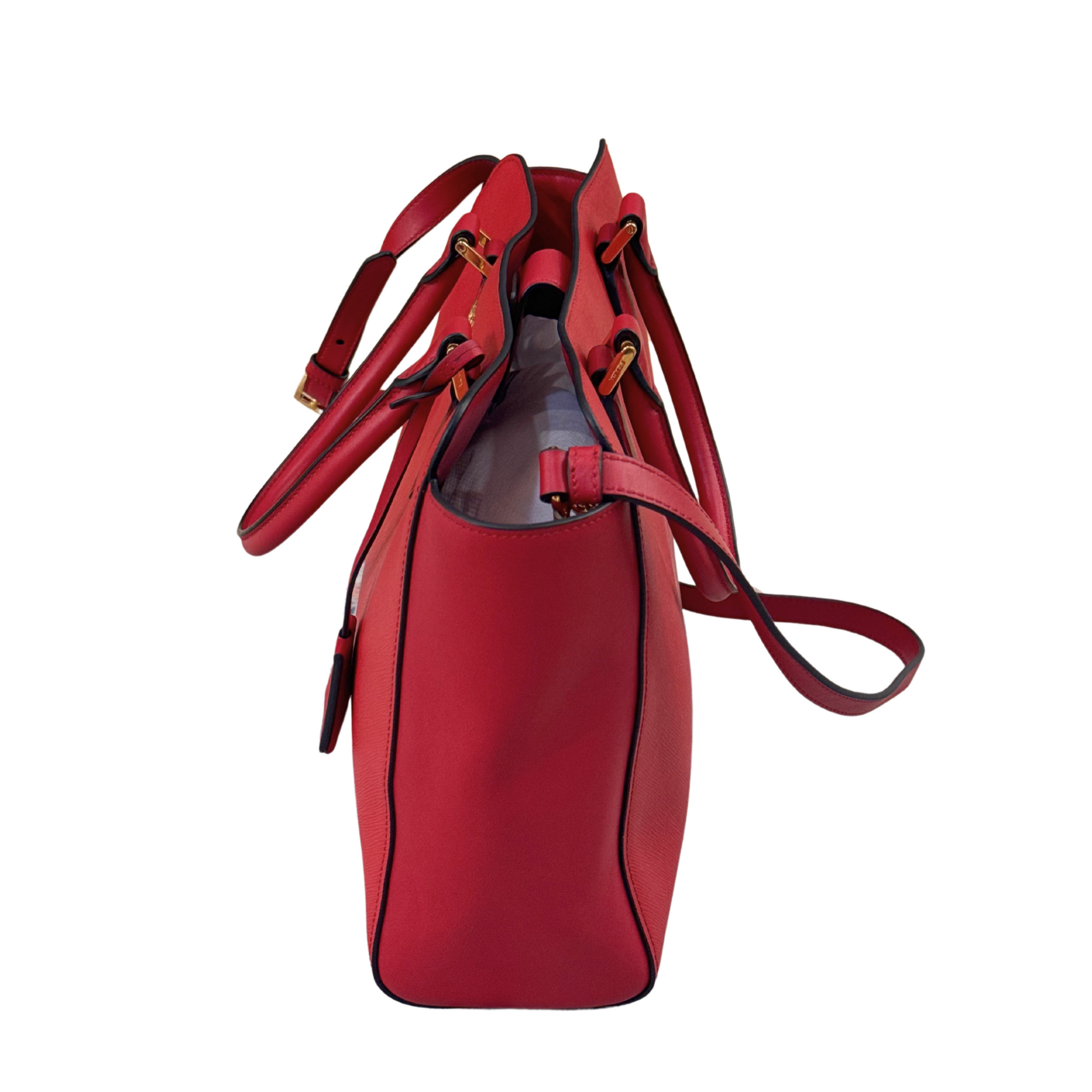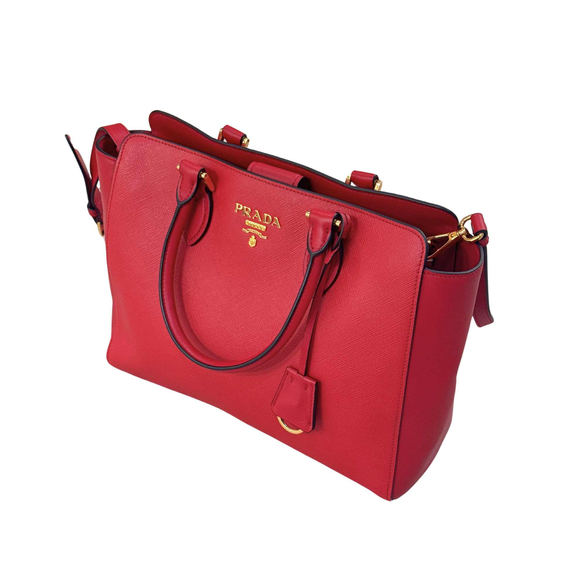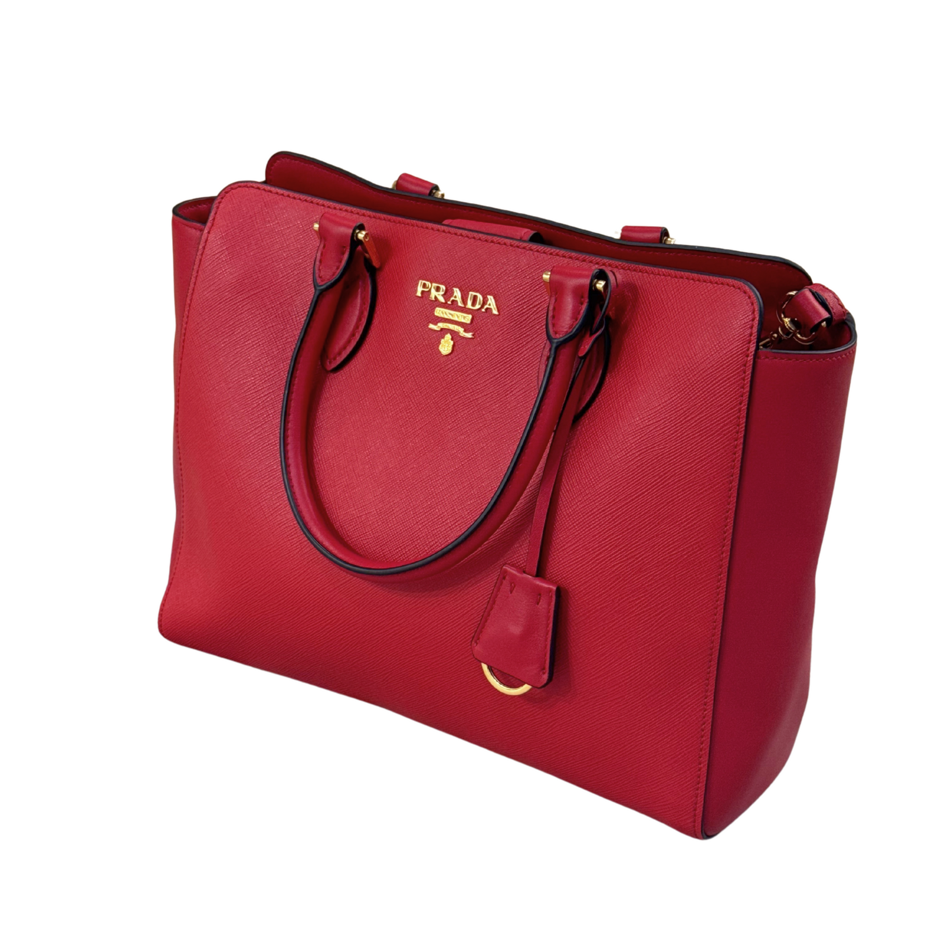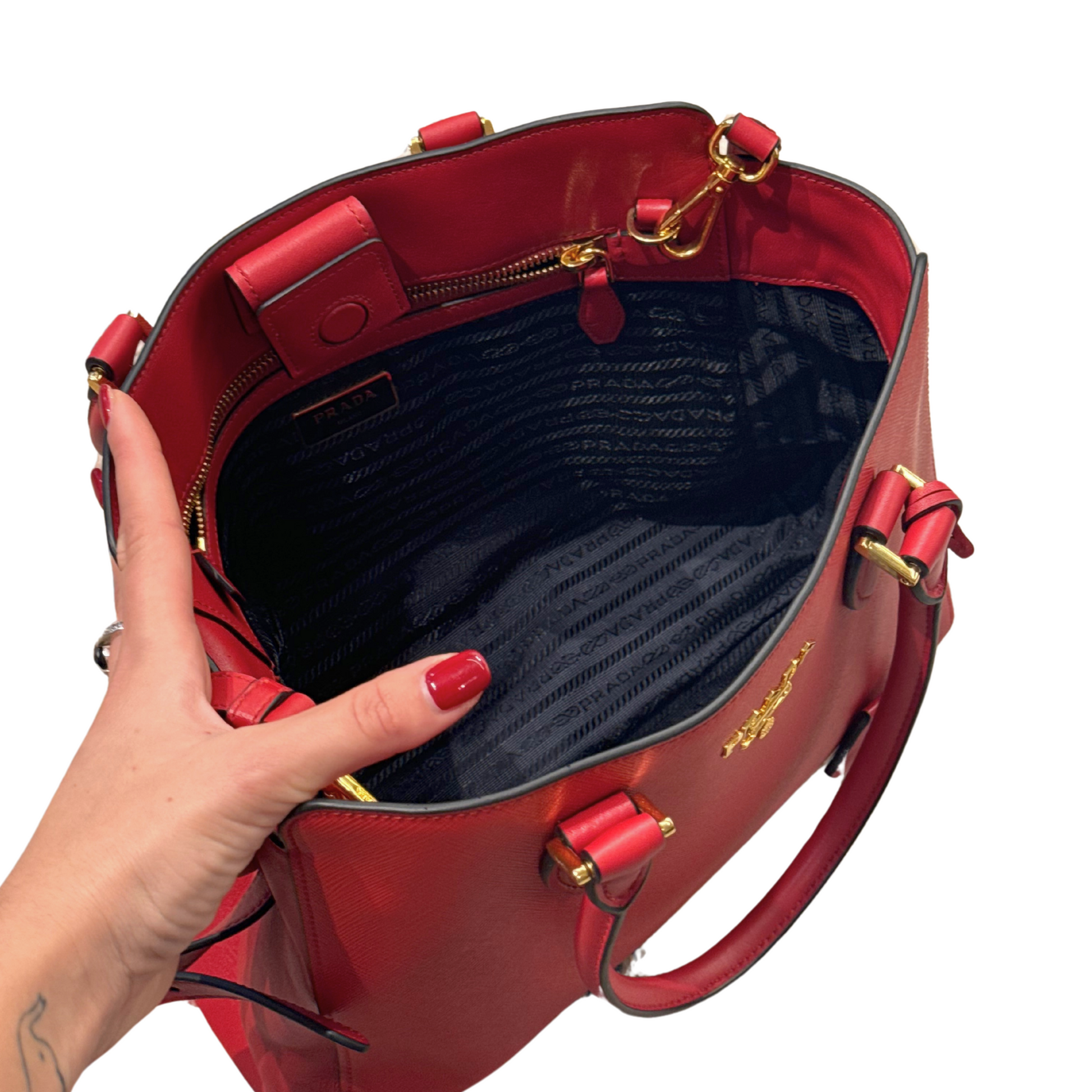 Borsa di Prada realizzata in pelle saffiano rossa, rifiniture laterali in pelle liscia. Doppi manici e tracolla amovibile. Scritta frontale in metallo dorato. Interno in tessuto nero logato, tasca. Comoda pratica e capiente.