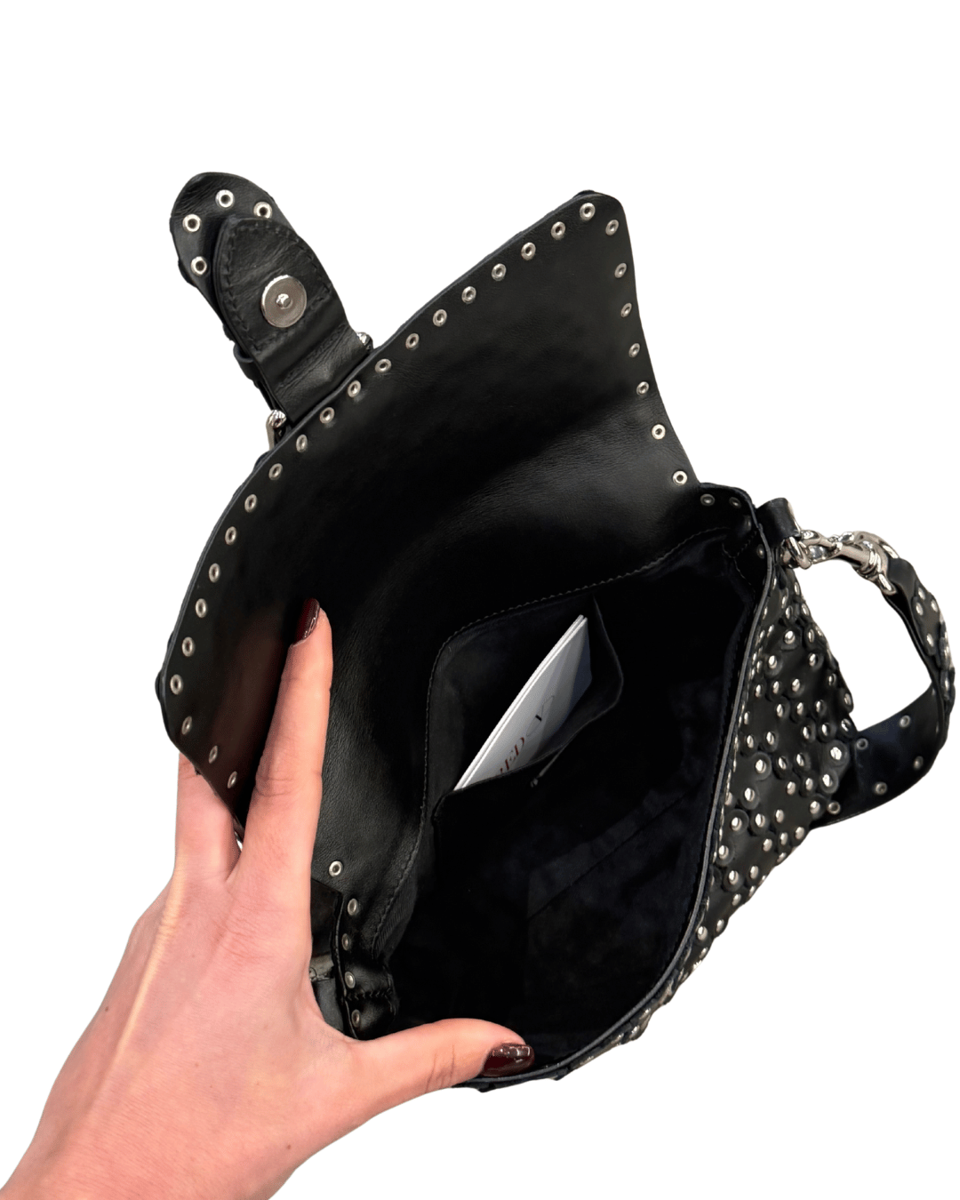 Borsa Red Valentino in pelle nera, impreziosita da una particolare lavorazione a fiorellini in pelle, ciascuno rifinito con piccole borchie metalliche che creano un effetto luminoso e tridimensionale. Un modello ricercato, in cui l’anima rock delle borchie incontra un’estetica più femminile e raffinata, rendendola un accessorio unico e riconoscibile. La struttura morbida è completata da una patta frontale con chiusura a fibbia, dettaglio iconico che dona ulteriore personalità al design. La tracolla amovibile permette di indossarla anche a spalla. Interno spazioso con tasca, ideale per organizzare l’essenziale.