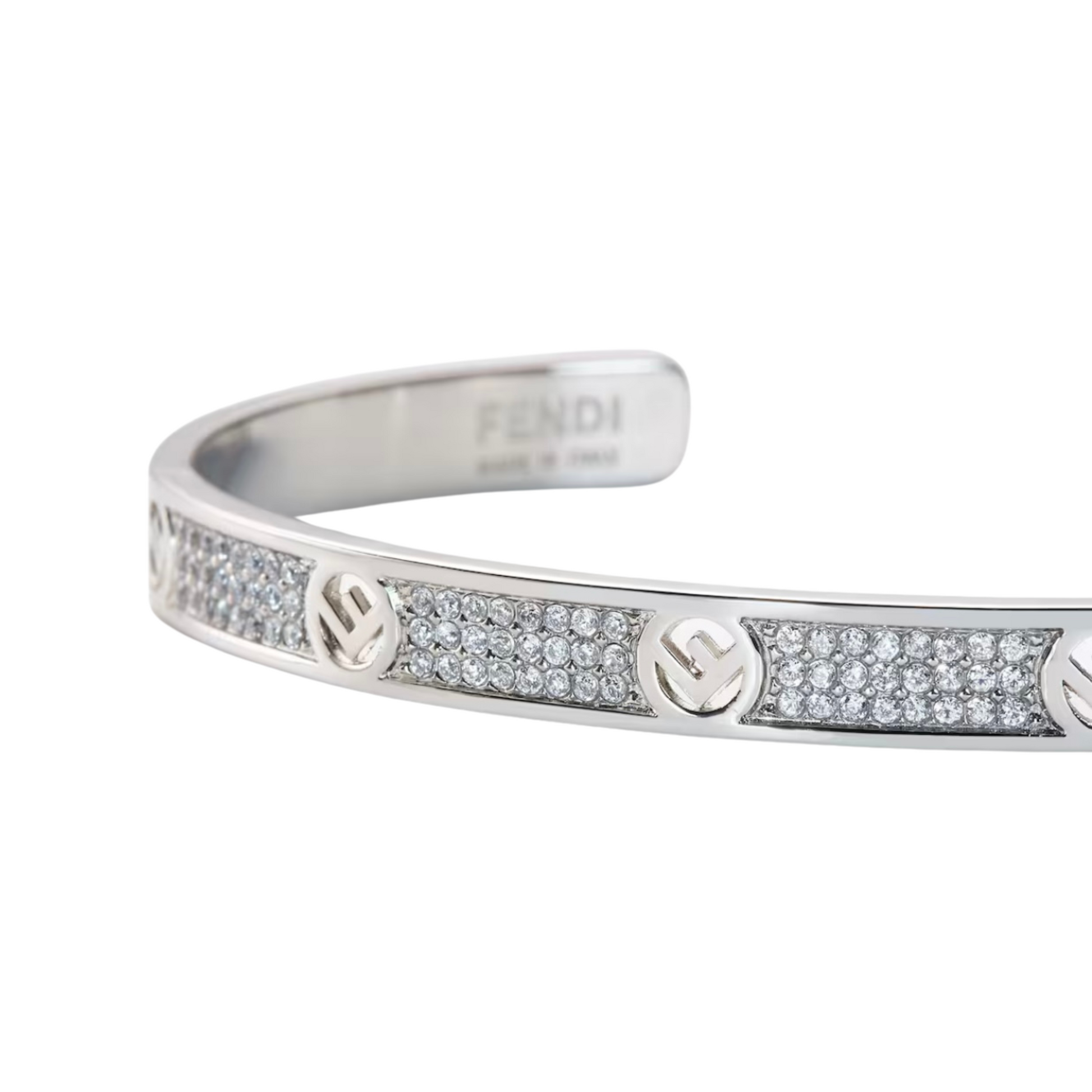 Bracciale rigido con elementi intagliati a forma di logo F is Fendi. Realizzato in metallo con finitura argento. Decorato con cristalli naturali