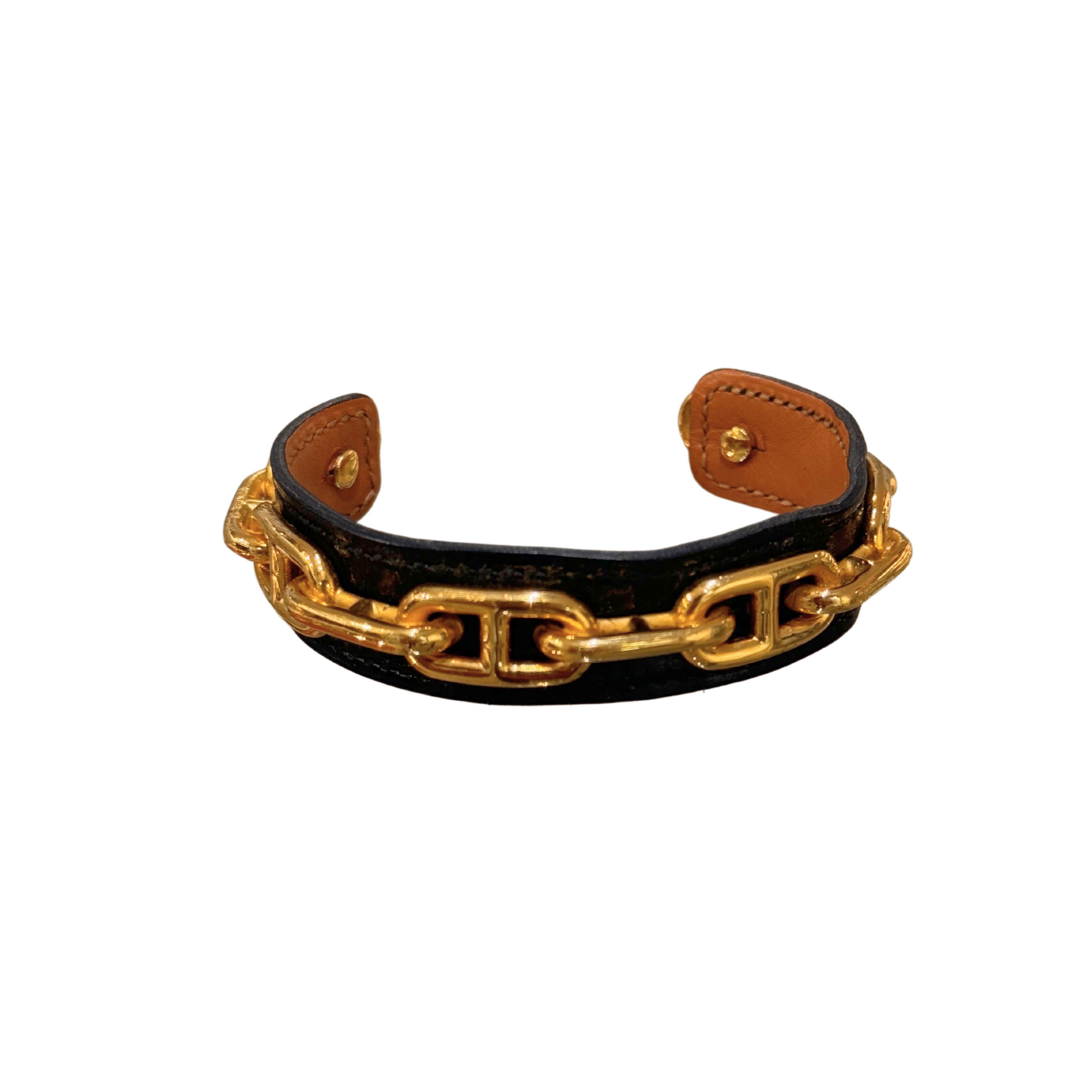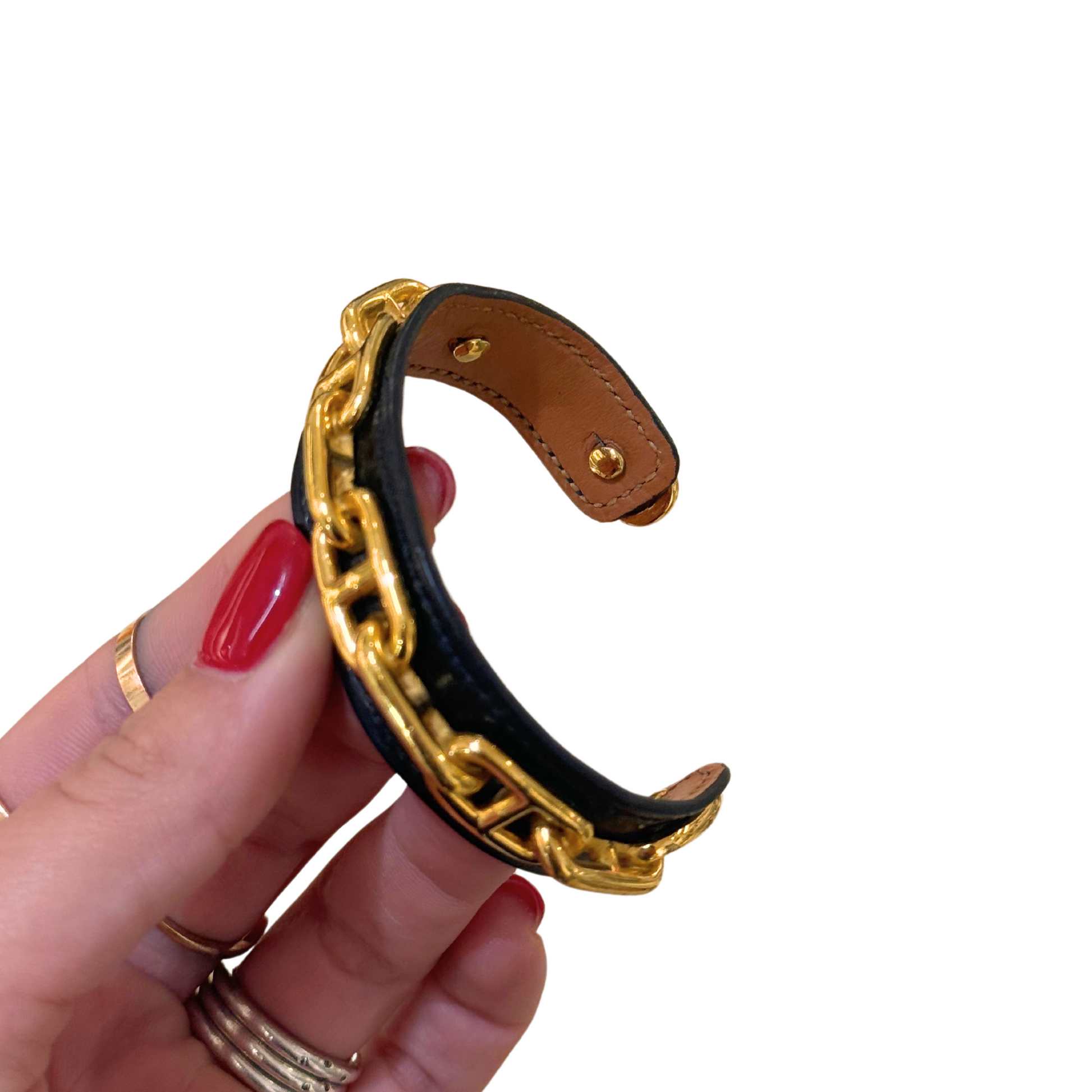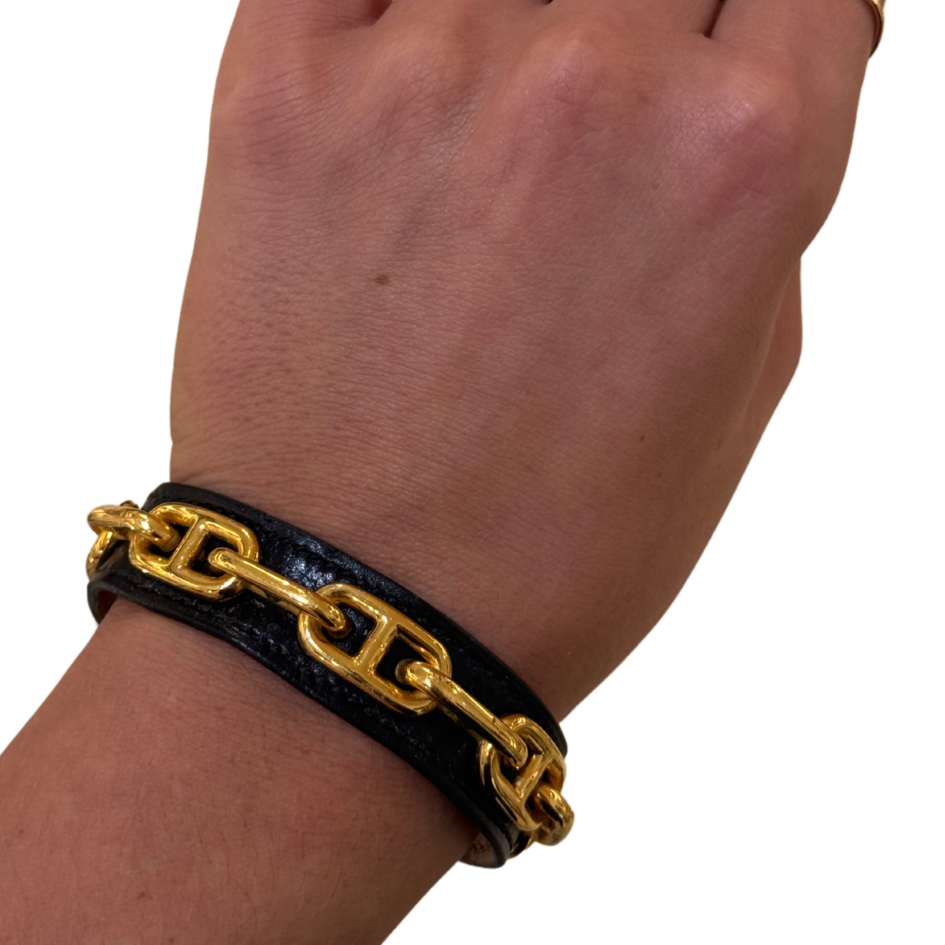 Bracciale di Hermes in pelle nera con dettagli in metallo dorato. Interno in pelle color cuoio.
