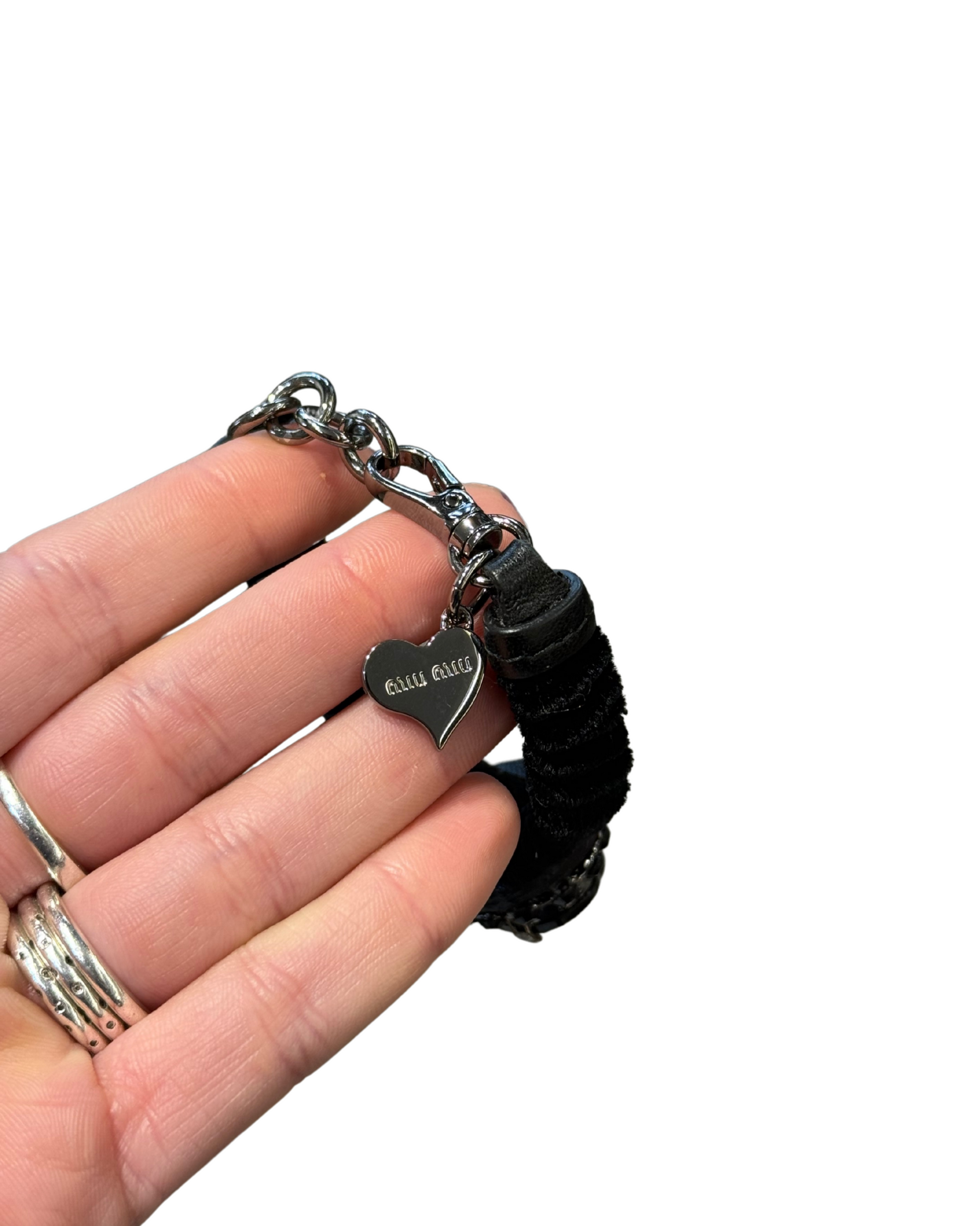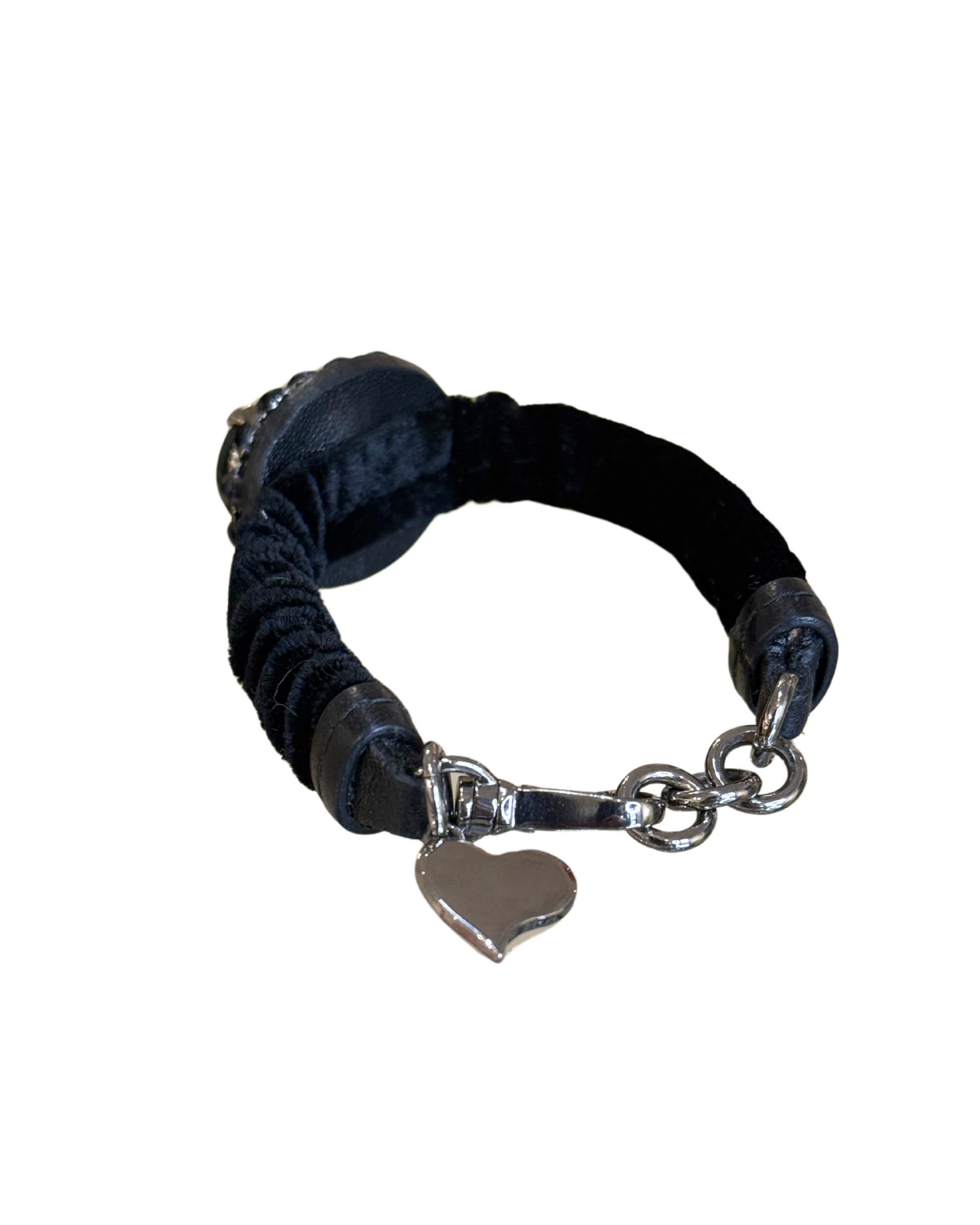 Bracciale MiuMiu in velluto nero con pietra frontale nera. Apertura con gancio, metalleria argentata. E' presente anche un piccolo ciondolo a forma di cuore con logo inciso.