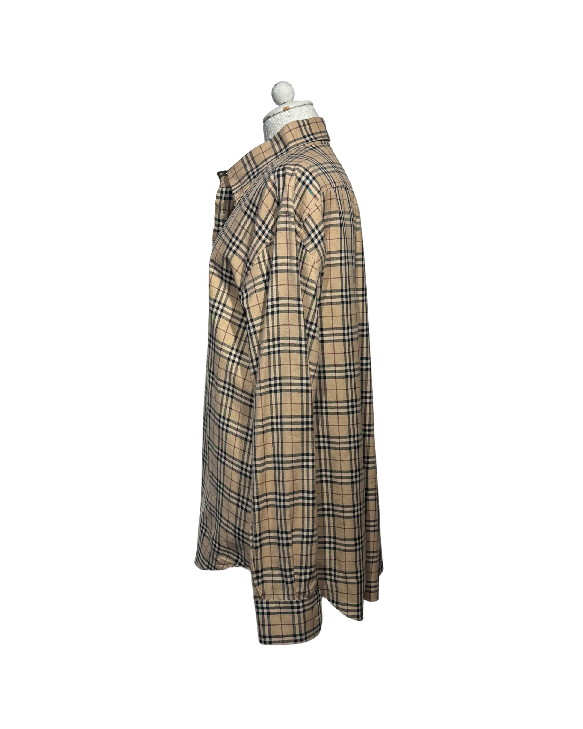 Camicia a maniche lunghe in puro cotone, caratterizzata dal classico motivo Burberry Check beige con dettagli in nero, bianco e rosso bordeaux. Il modello presenta colletto classico, chiusura con bottoni madreperlati , logo Burberry ricamato tono su tono sul petto. Vestibilità regular ( non slip), perfetta anche come vestitino da donna . Si tratta di un articolo periodo pre-2016.