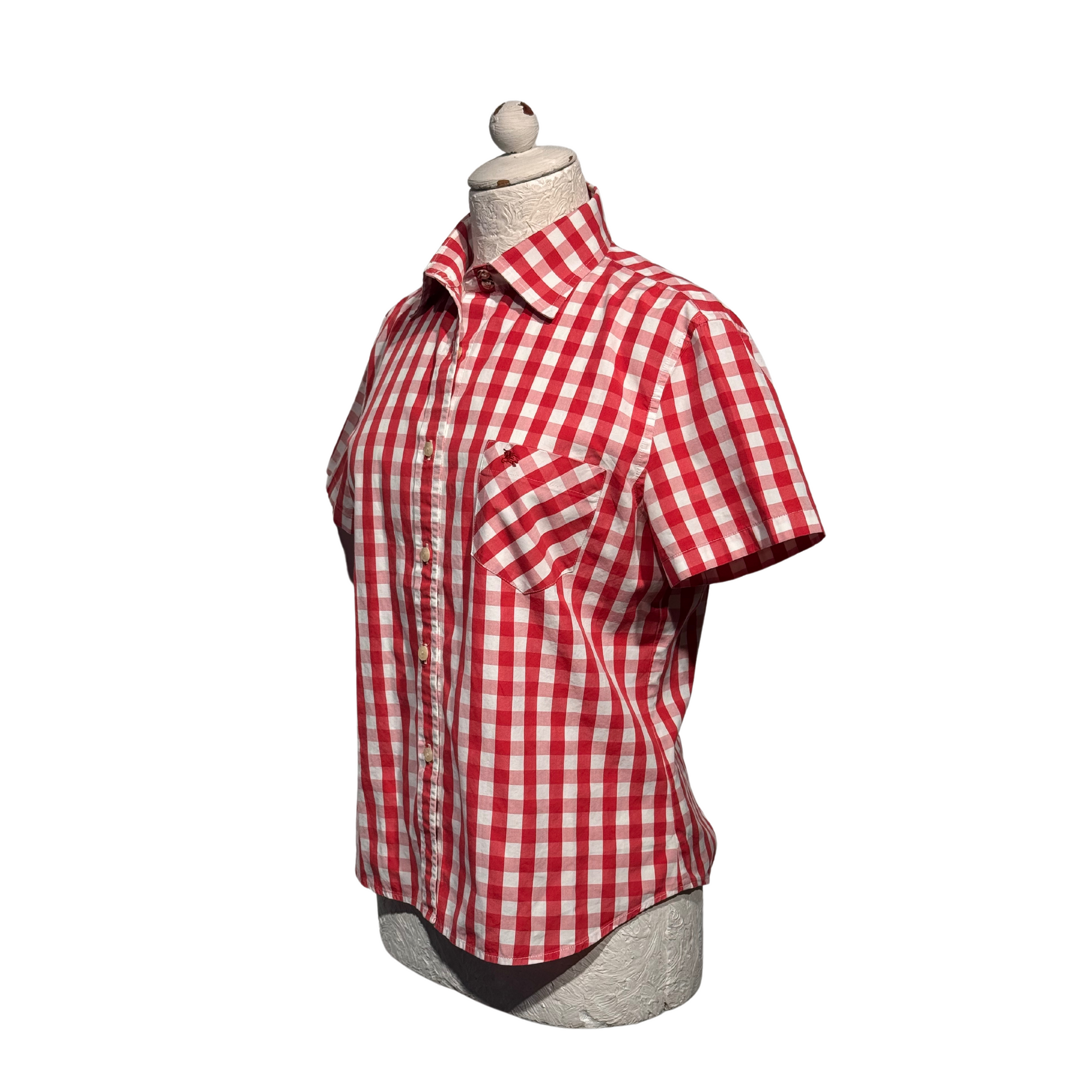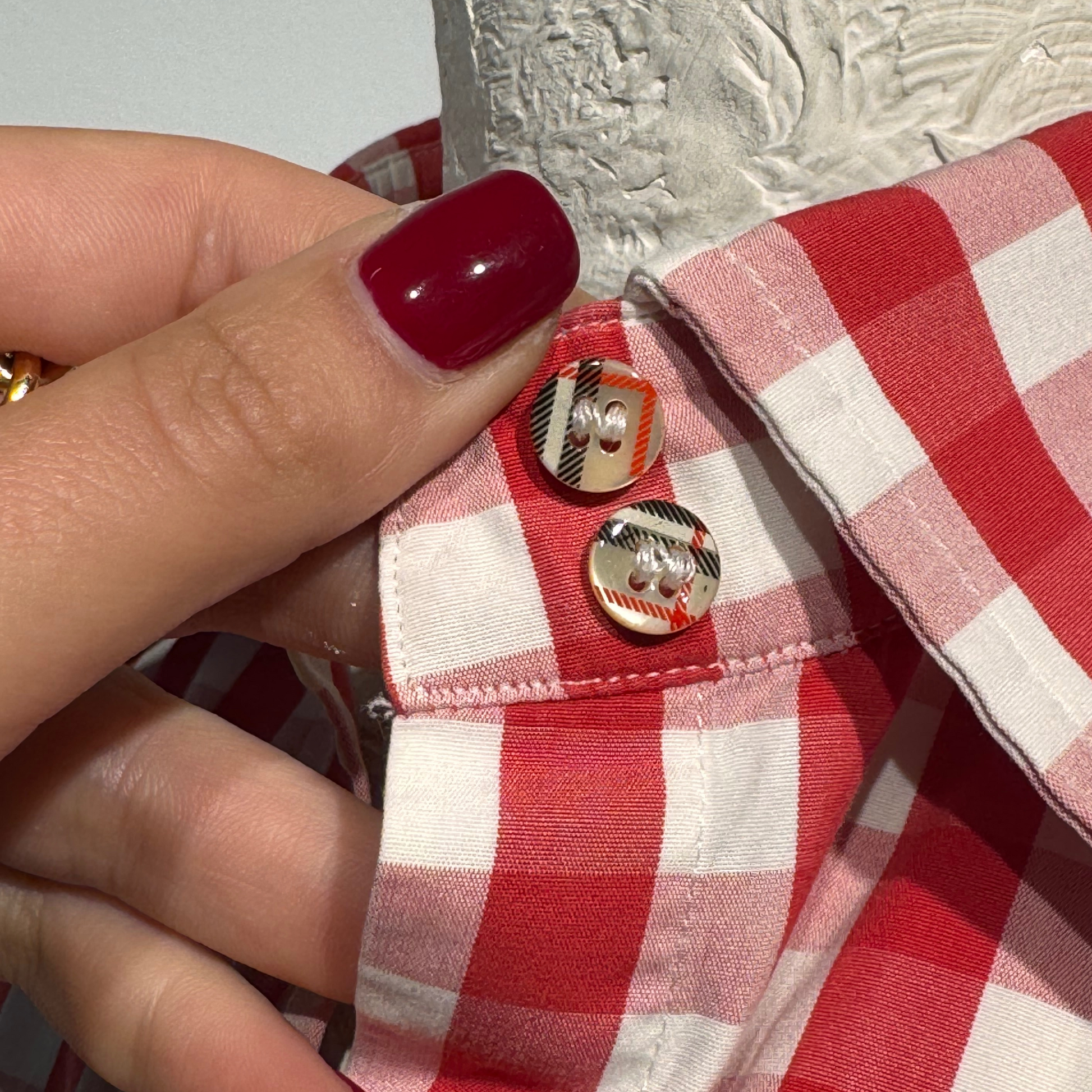 Camicia in cotone di Burberry , trama a quadretti bianchi e rossi. Maniche corte, apertura frontale con bottoni . Taschino in corrispondenza del petto.