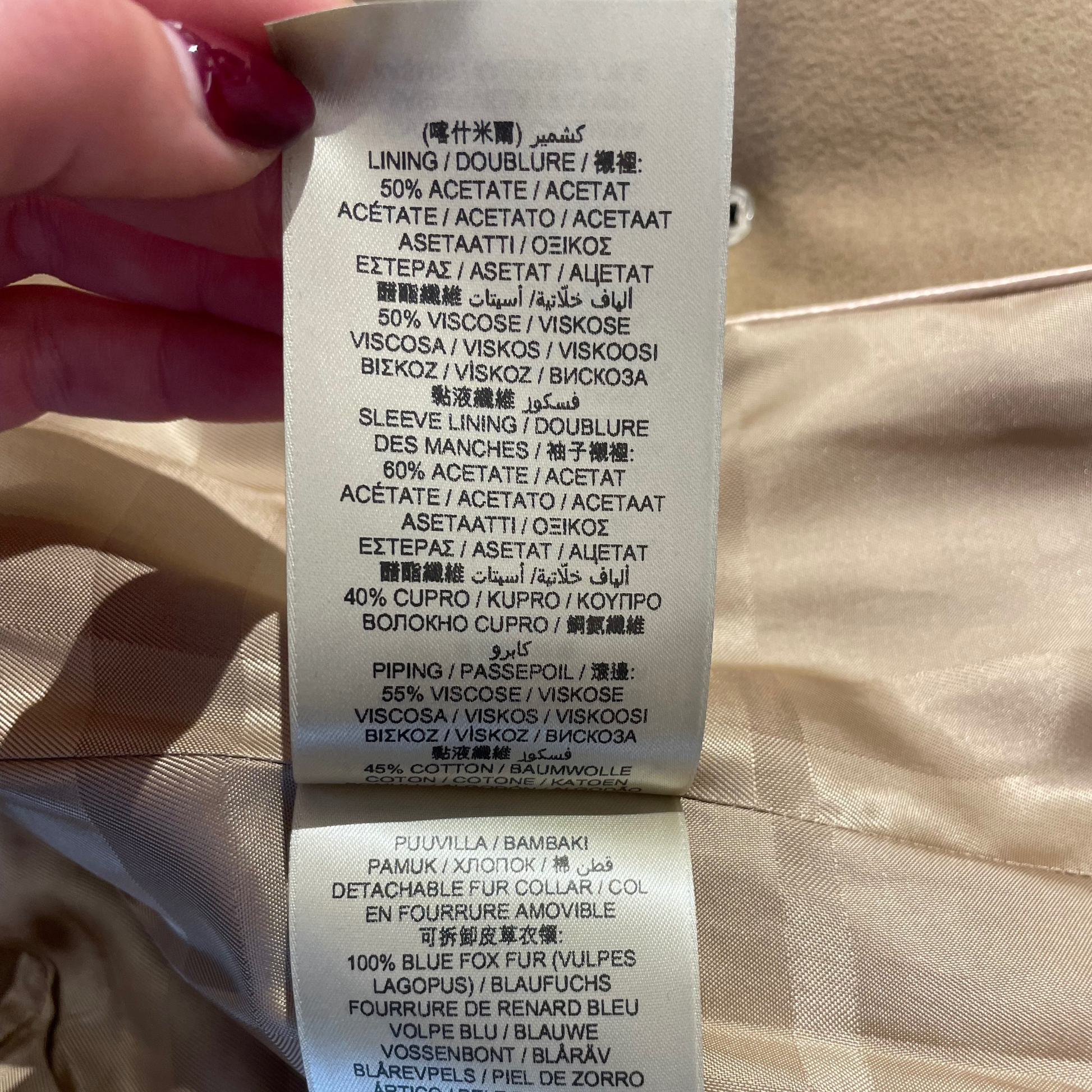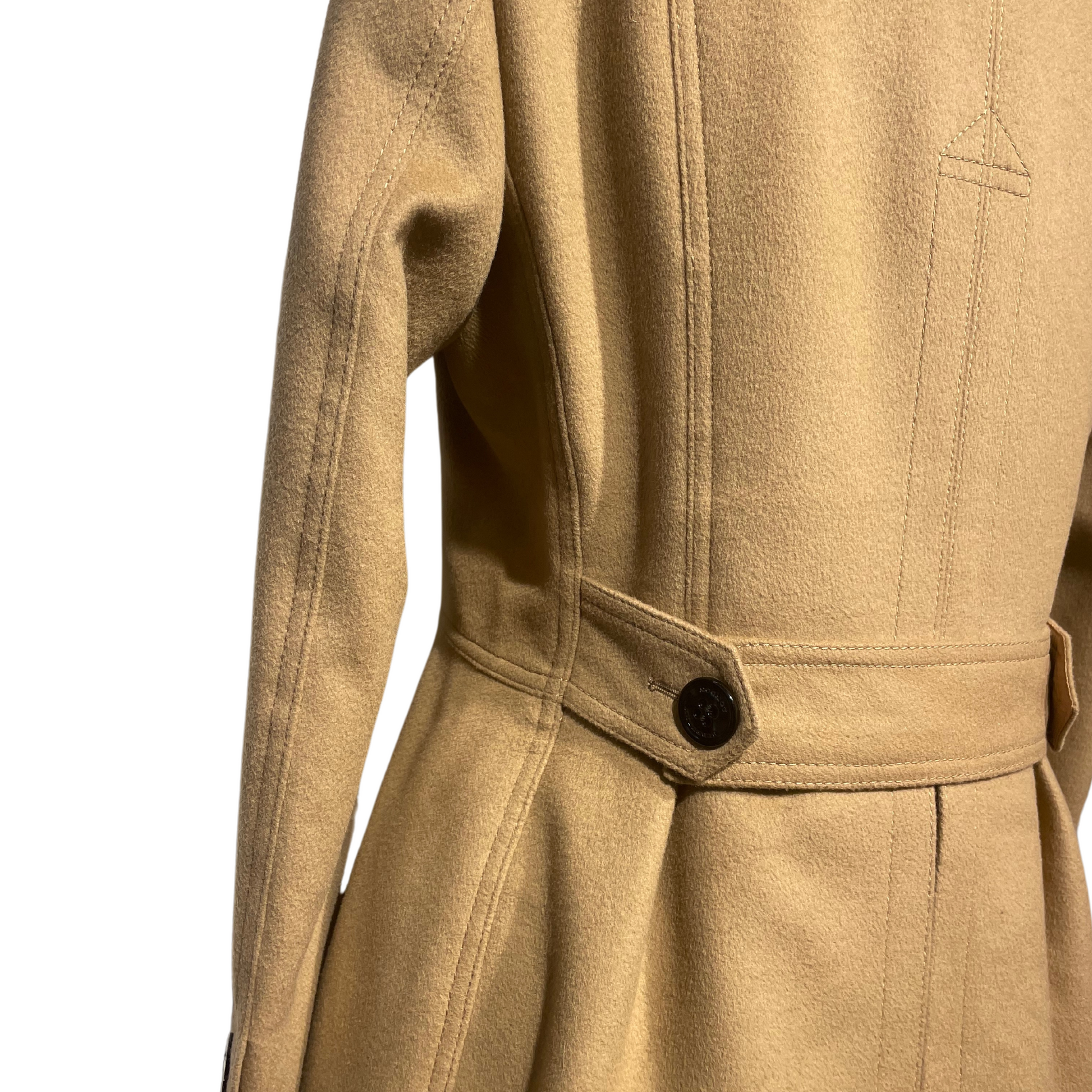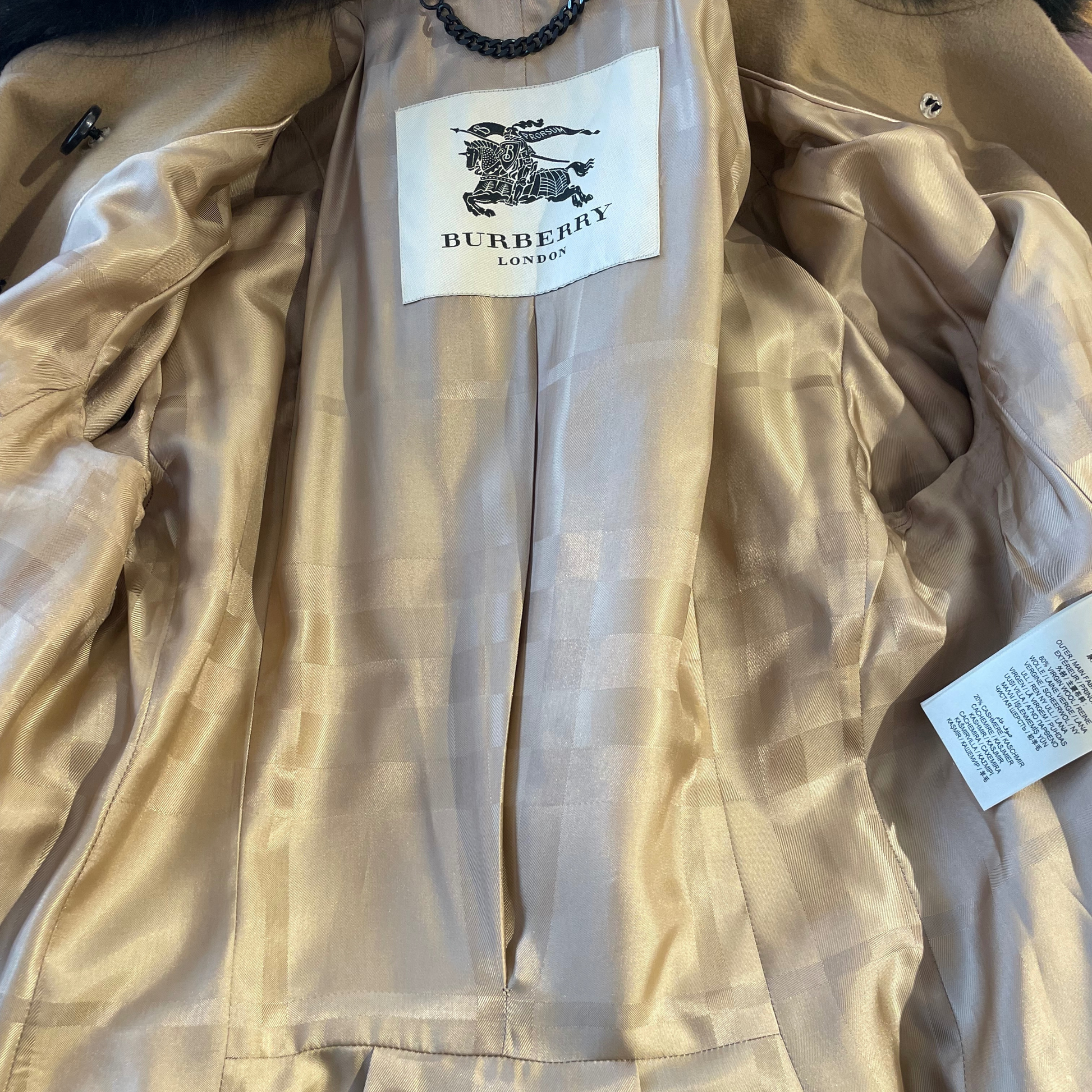 Cappotto Burberry color cammello in lana e cachemire, apertura doppio petto con bottoni neri. Stretto in vita e scampanato in fondo. Tasche laterali. Impreziosito da pelo di volpe nero sul colletto, amovibile. Interno classico tartan tono su tono.