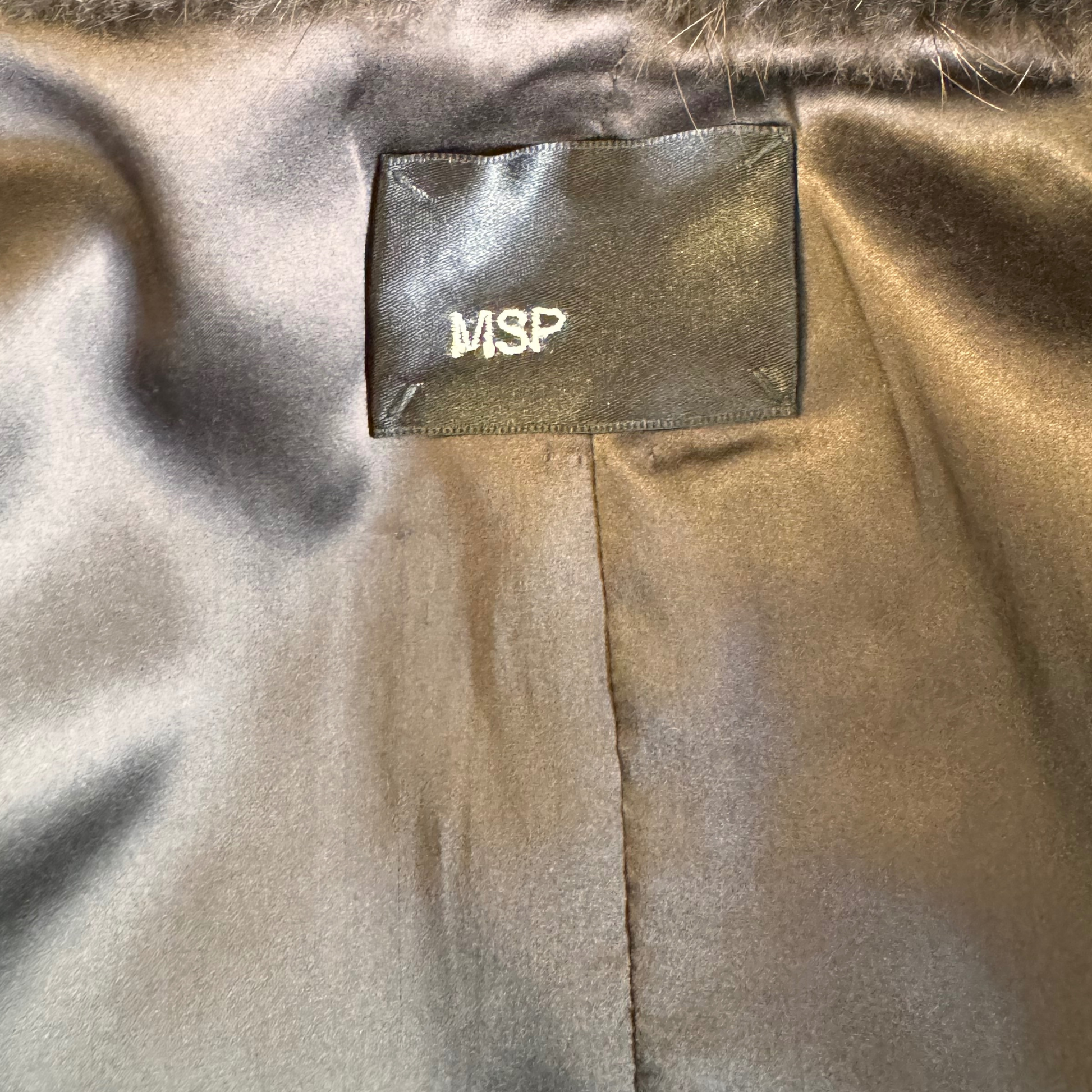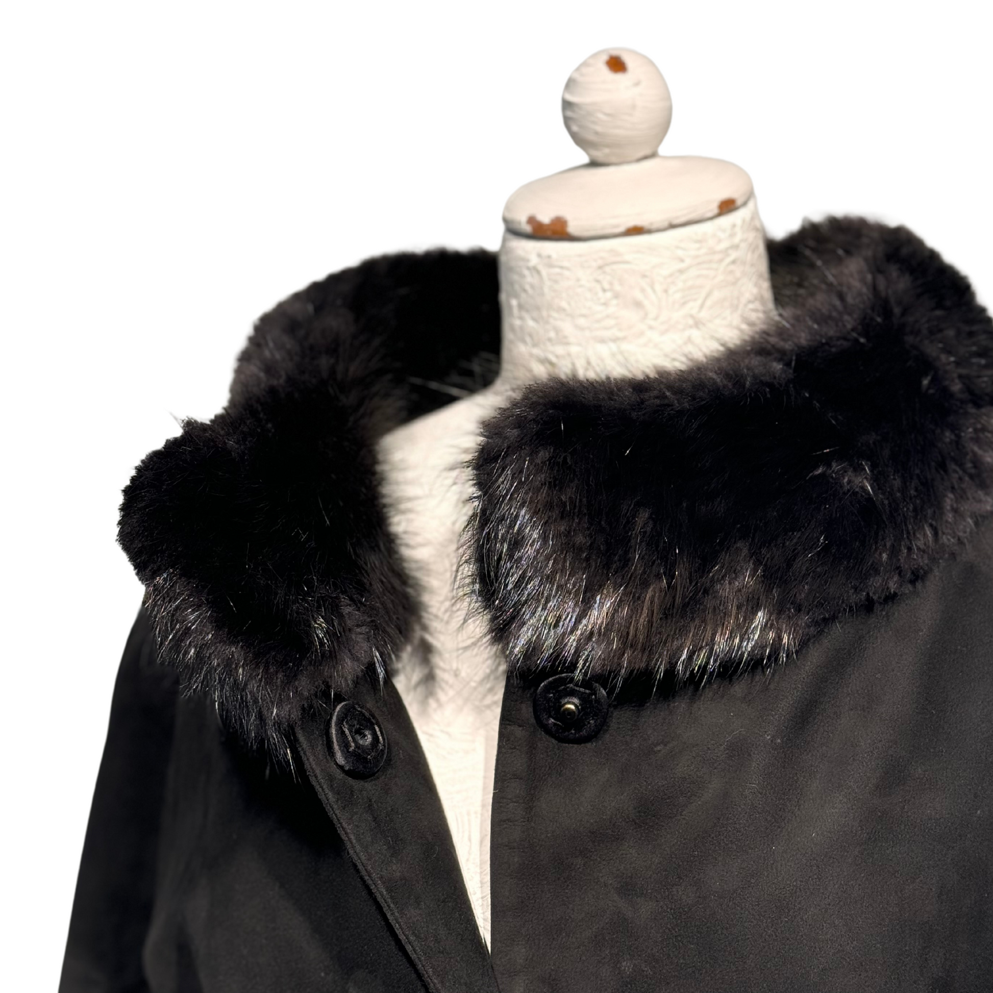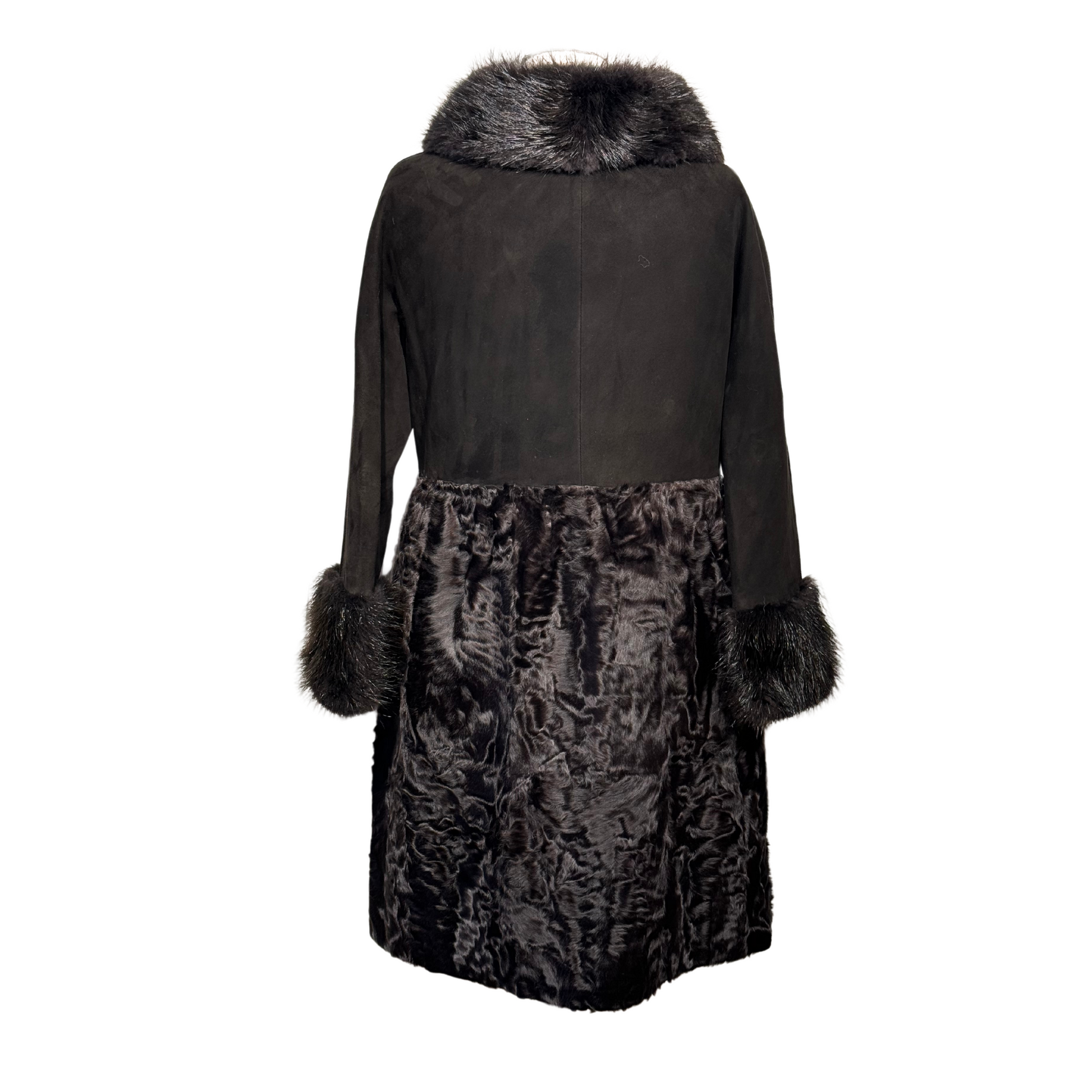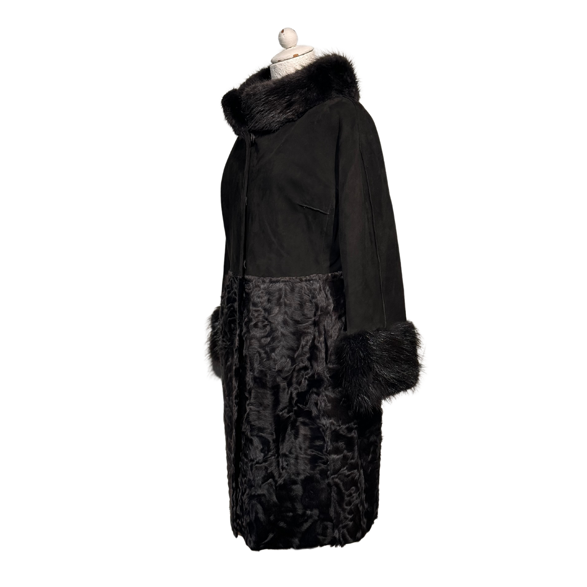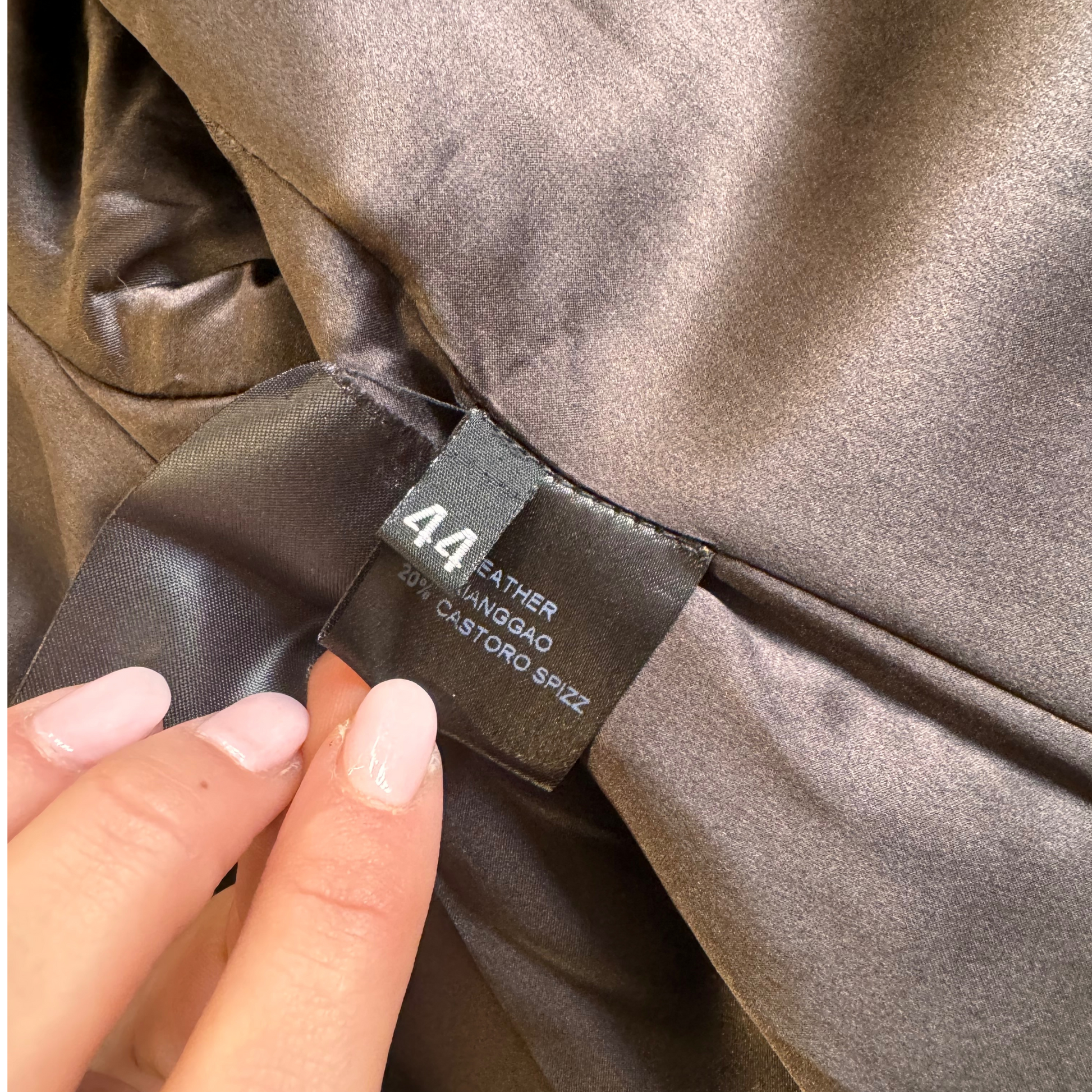 Cappotto in pelle e pelo di castoro color testa di moro. Apertura frontale con bottoni , tasche laterali. Fodera in seta marrone.