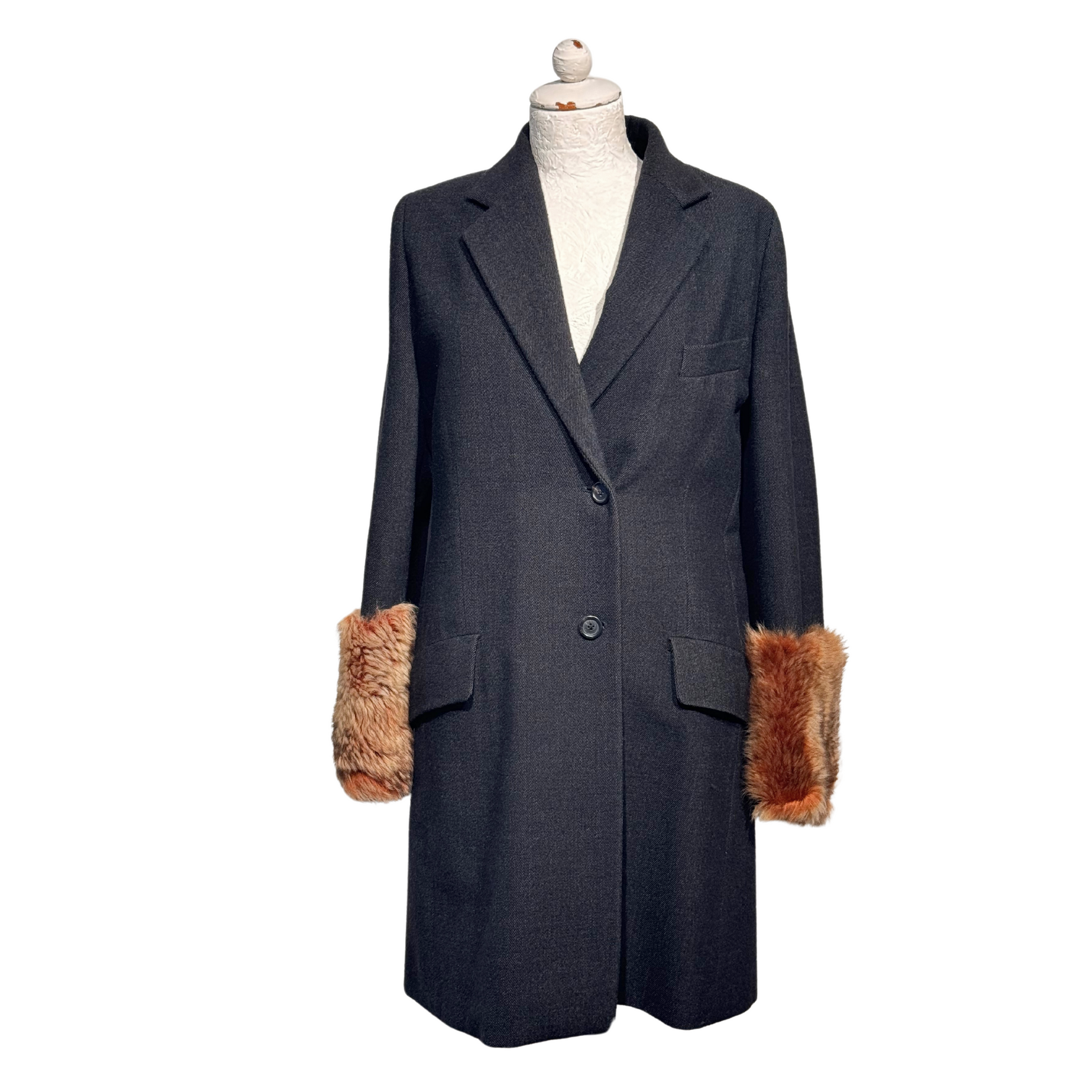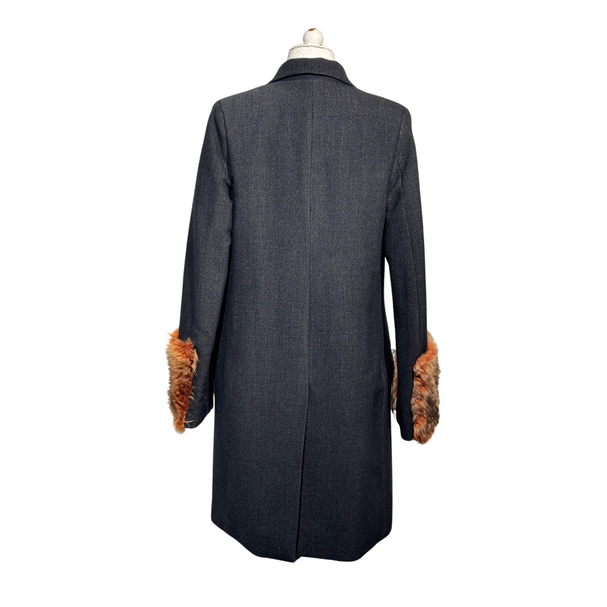 Cappotto Dries van Noten grigio impreziosito da manicotti in ecopelliccia aranciato. Apertura frontale con bottoni, tasche laterali.