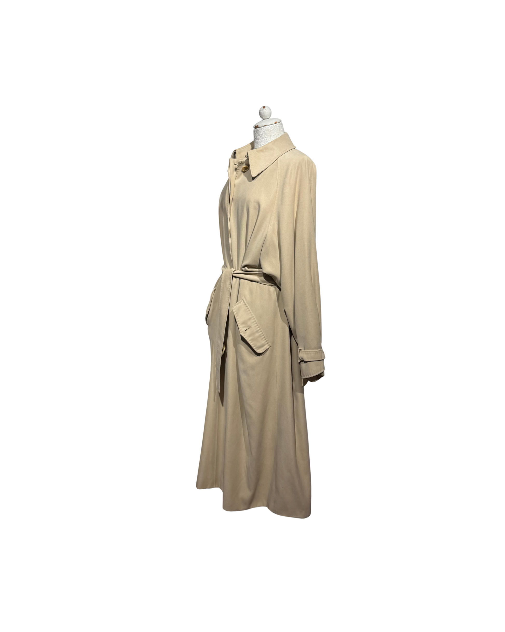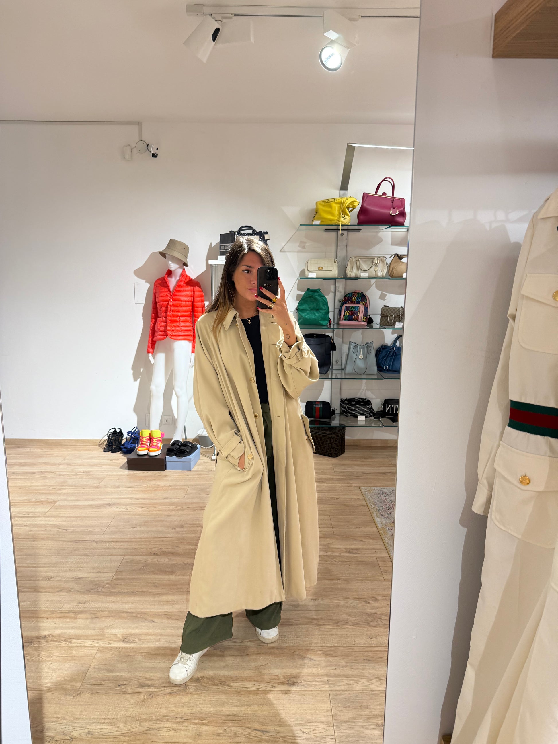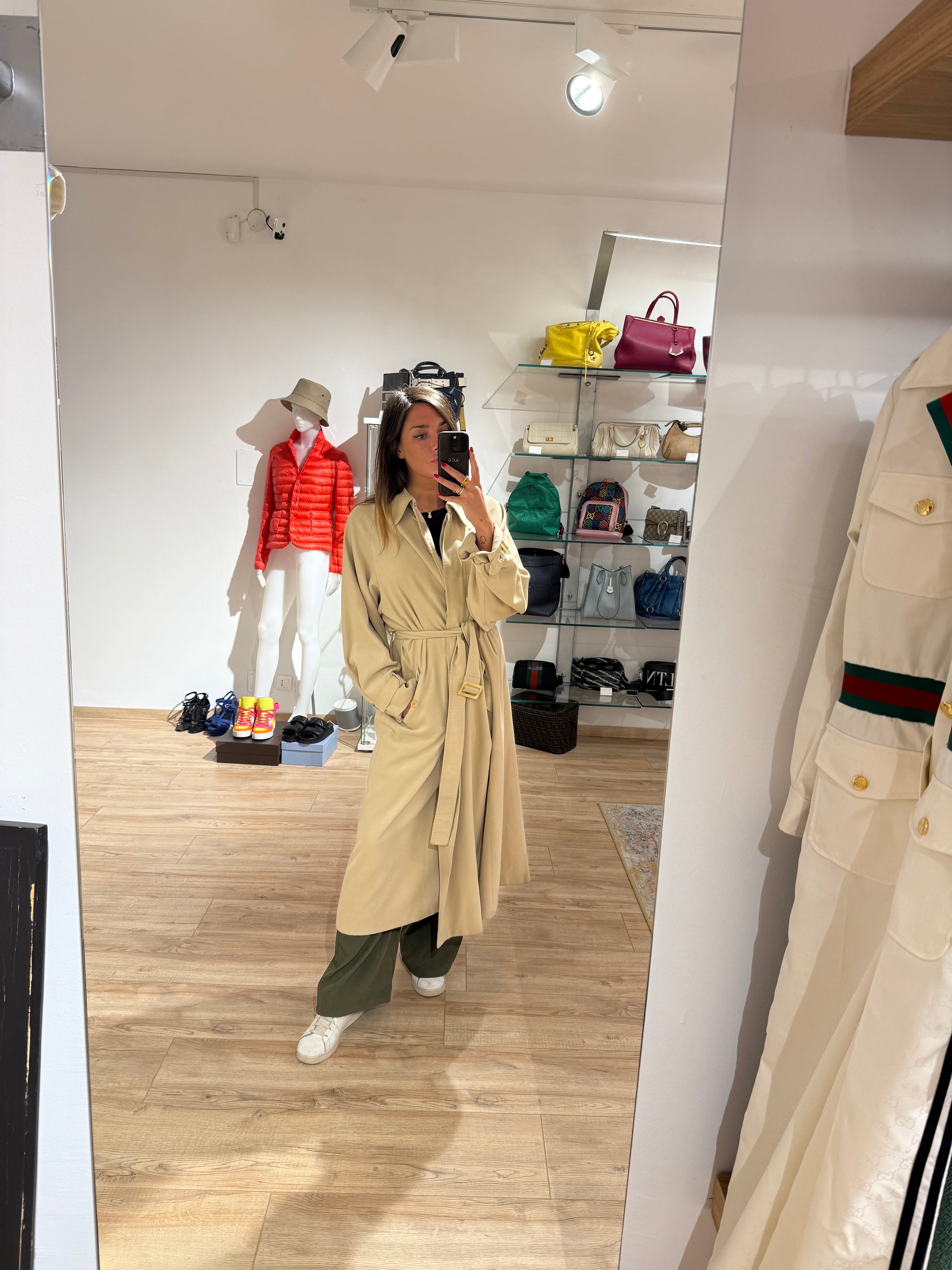 Un capospalla senza tempo firmato Max Mara, perfetto per la mezza stagione. Realizzato in tessuto fluido color sabbia , presenta una linea morbida e avvolgentesi con cintura coordinata in vita che ne sottolinea la femminilità. Il modello è arricchito da dettagli curati come le maniche con cinturini regolabili, tasche e bottoni logati. Foderato internamente in viscosa e copro, assicura comfort e leggerezza. La linea rimane over.