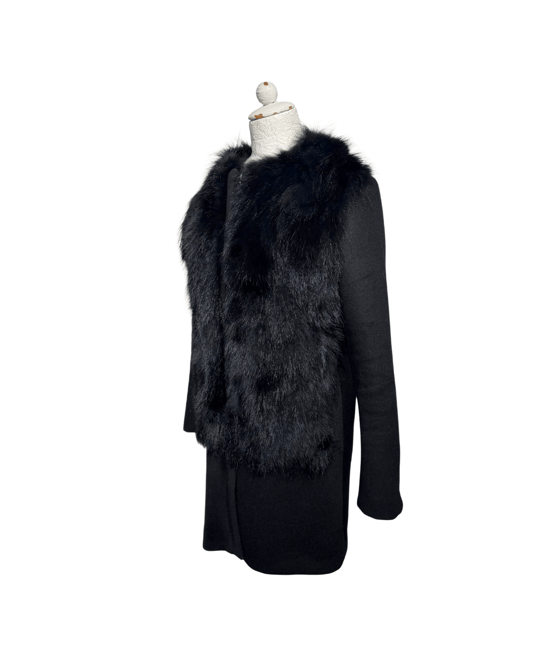 Cappotto elegante e raffinato firmato Pianca, realizzato in Italia, pensato per chi ama i capi importanti ma dal design pulito e senza tempo. Il modello presenta una linea dritta e femminile, valorizzata da un inserto frontale in vero pelo di volpe nero, morbido e voluminoso, che dona carattere e luminosità al capo senza risultare eccessivo.