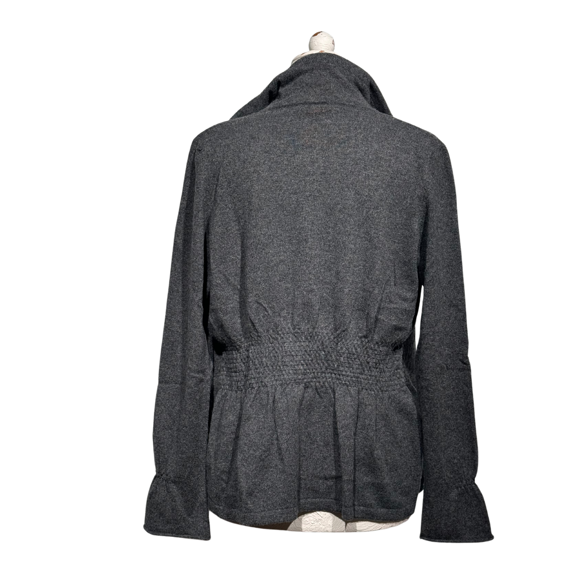 Cardigan grigio antracite di Brunello Cucinelli. Apertura frontale con bottoni, elastico nella parte posteriore. Coulisse in corrispondenza del colletto. 100% cashmere.
