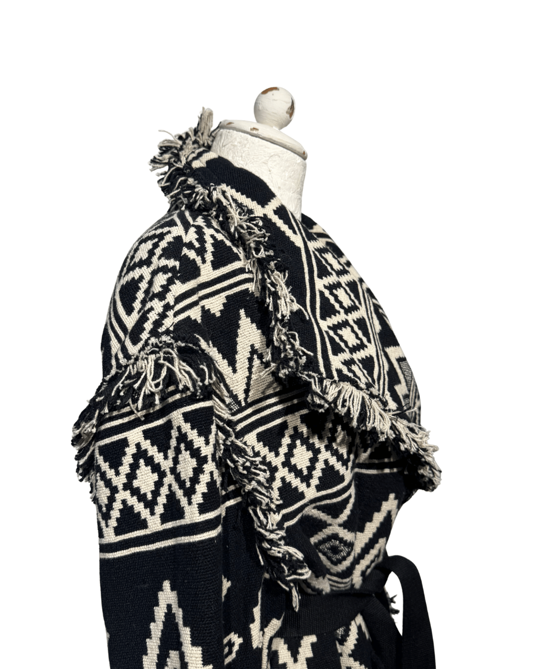 Cardigan Isabel Marant, realizzato in tessuto jacquard 100% cotone, con iconica lavorazione grafica nei toni del nero e bianco che richiama uno stile etnico-chic, perfettamente in linea con l’estetica boho raffinata del brand. Il capo presenta una costruzione morbida e avvolgente, con ampio collo sciallato rifinito da frange decorative che donano movimento e carattere. La chiusura è regolata da cintura in vita nello stesso tessuto, ideale per valorizzare la silhouette mantenendo un fit confortevole.