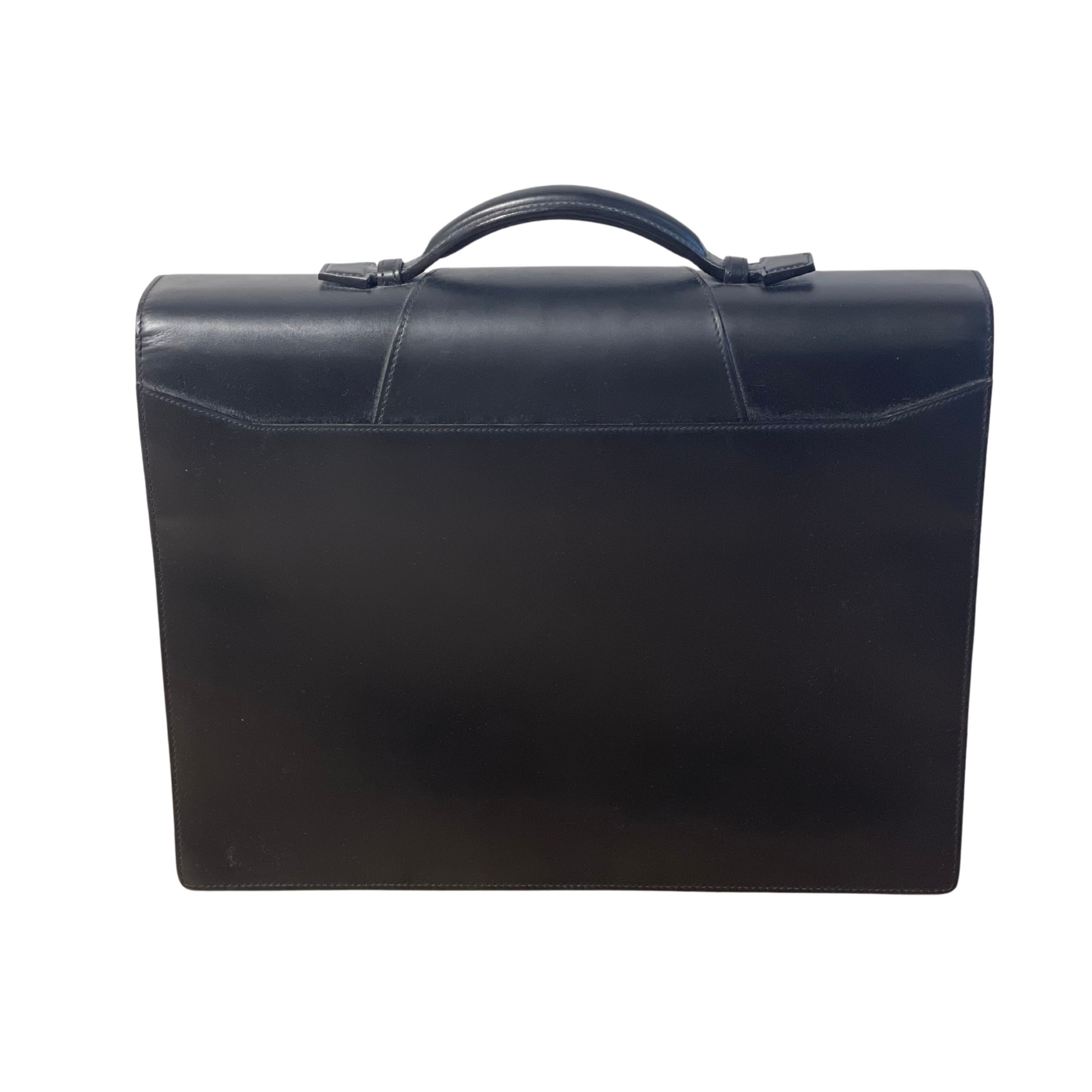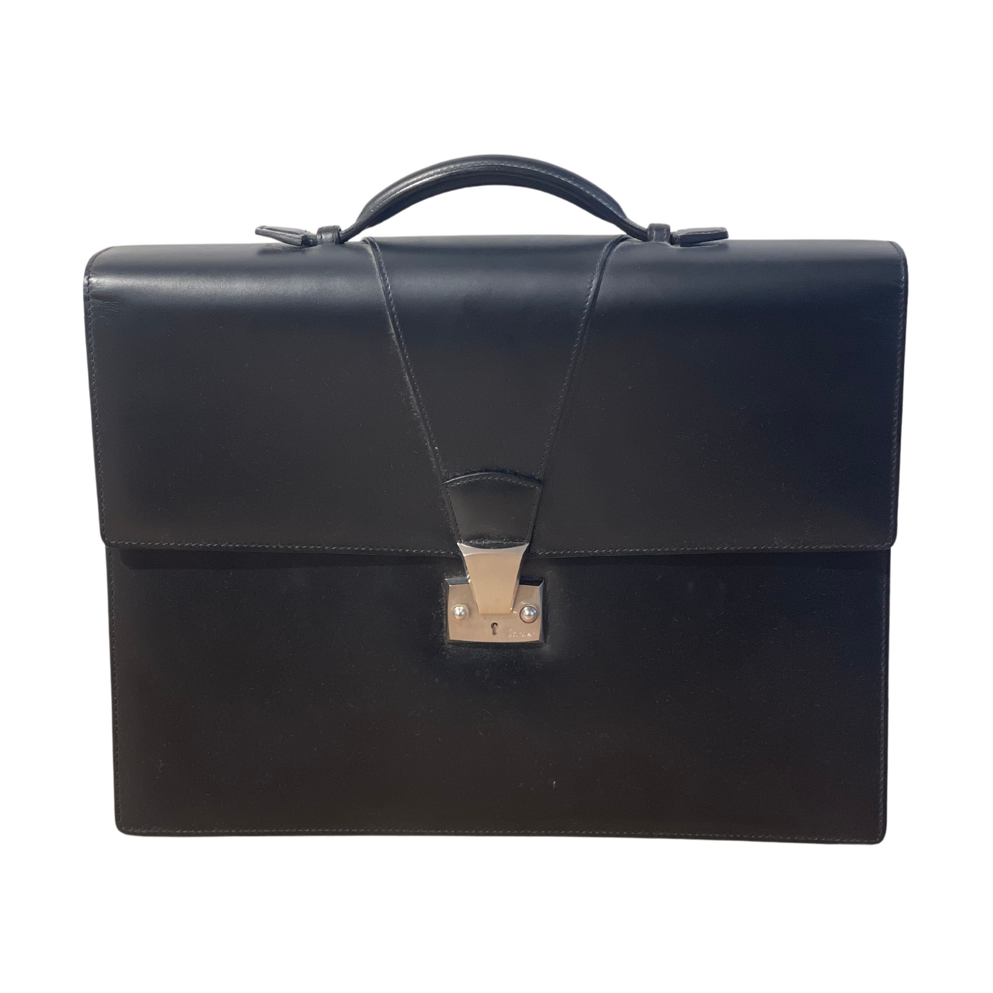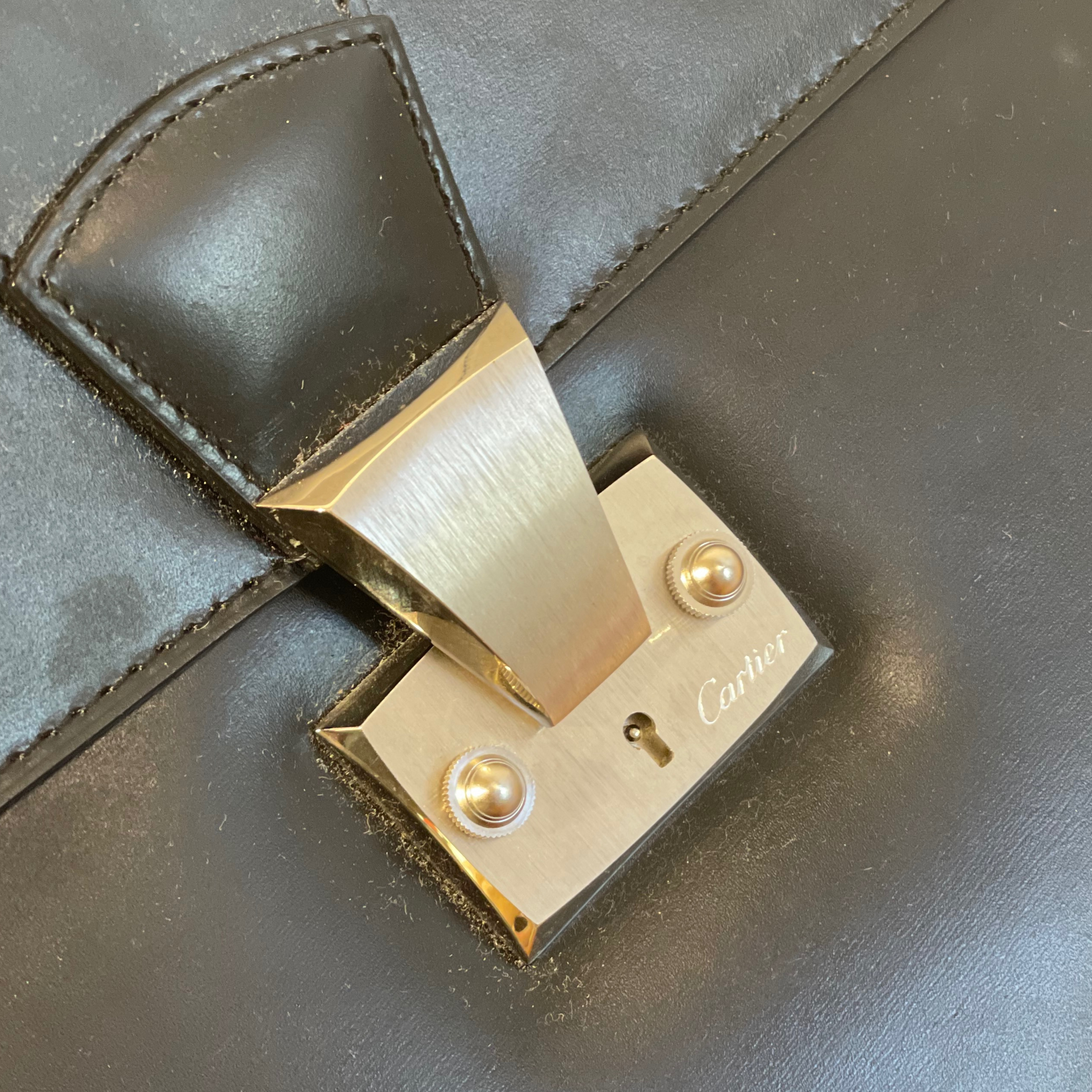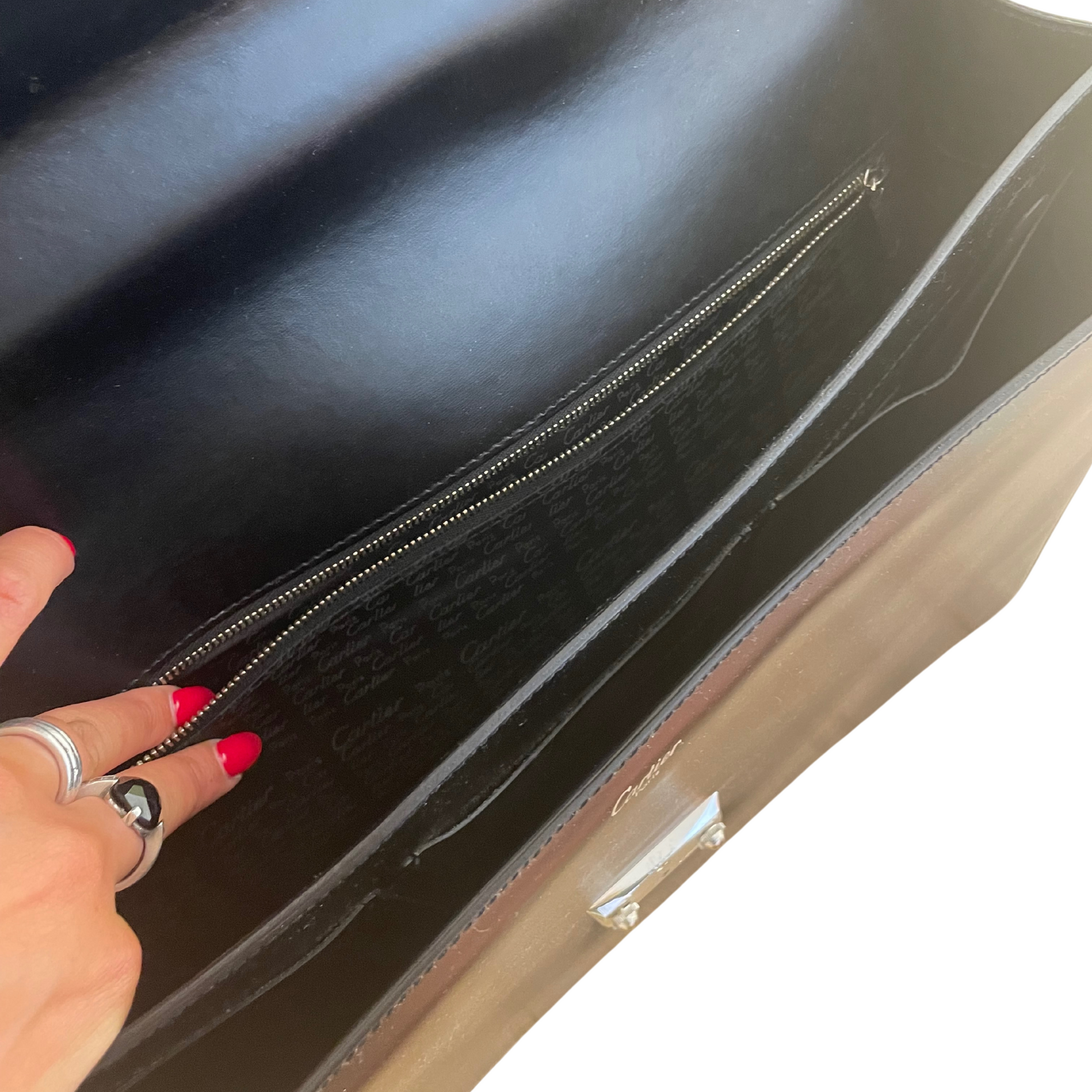 Cartella da lavoro di Cartier in pelle di vitello liscia nera. Hardware argentato. Patta frontale, apertura a pressione. Logo stampato Interno in pelle e tessuto nero logato suddiviso in due scomparti. Tasche piatte e tasca con cerniera. Manico singolo.