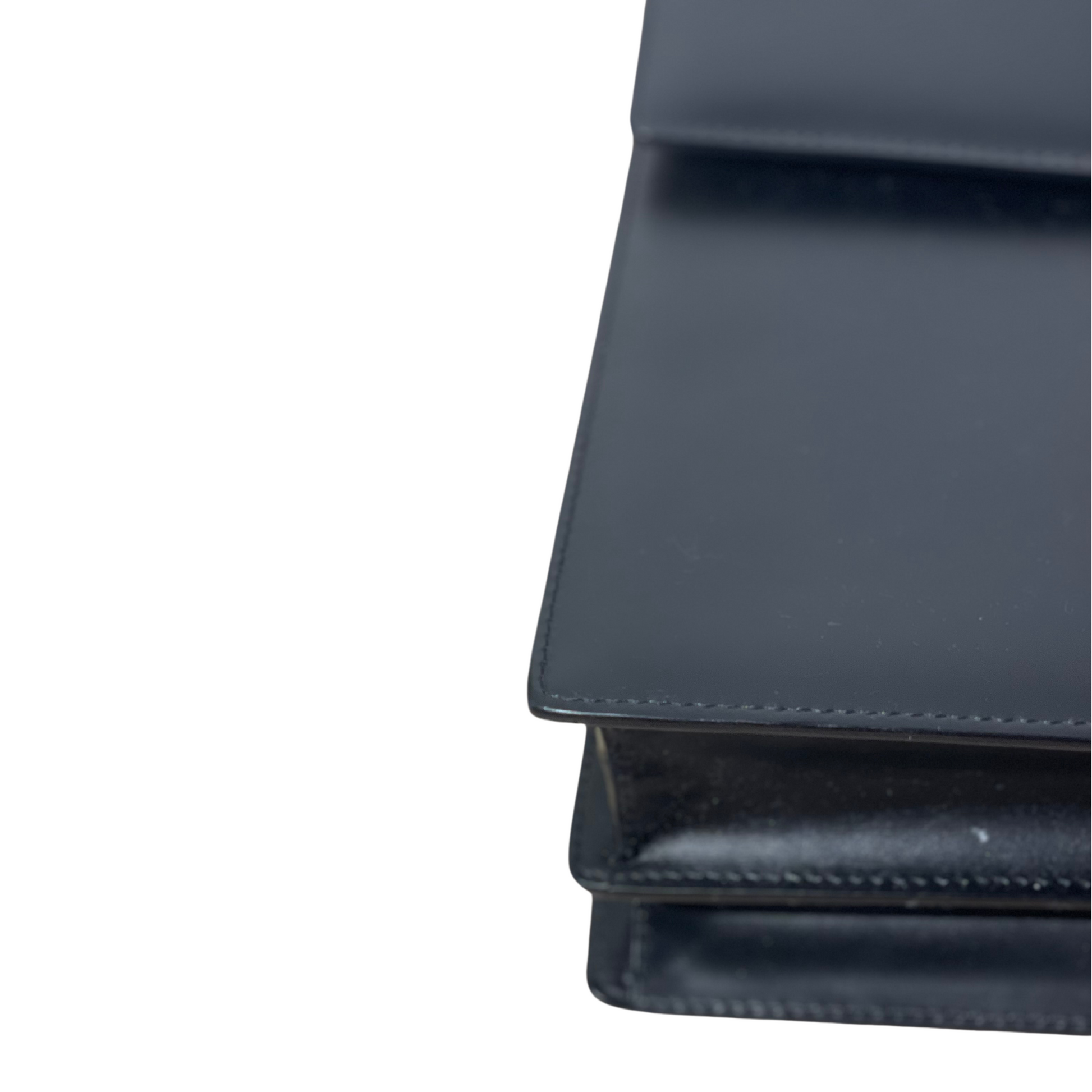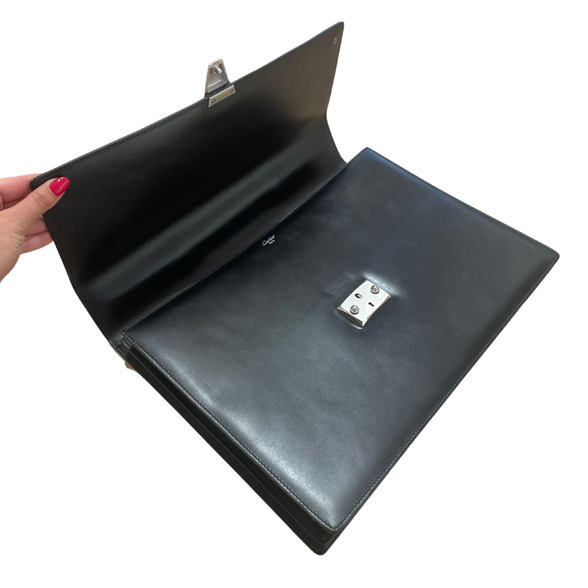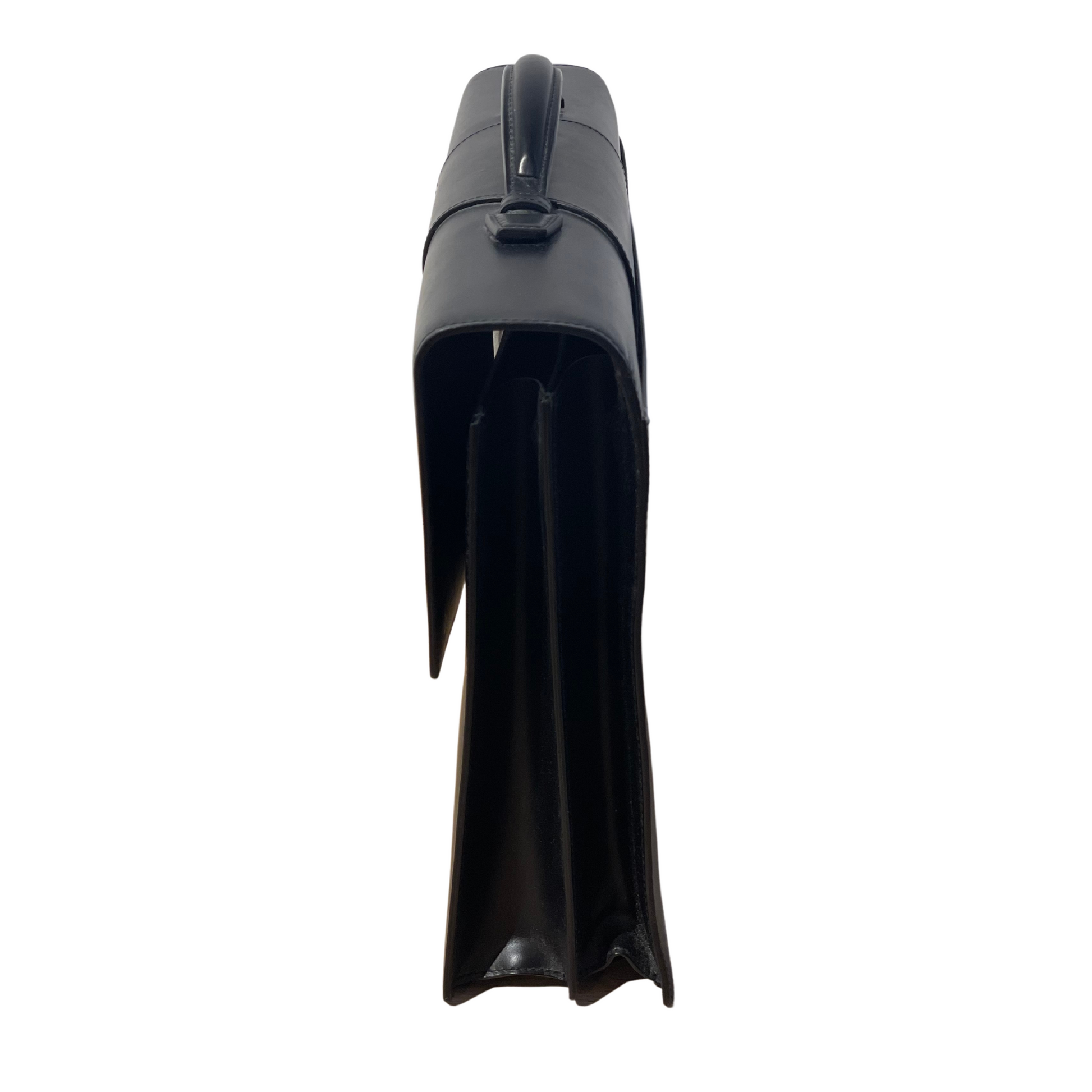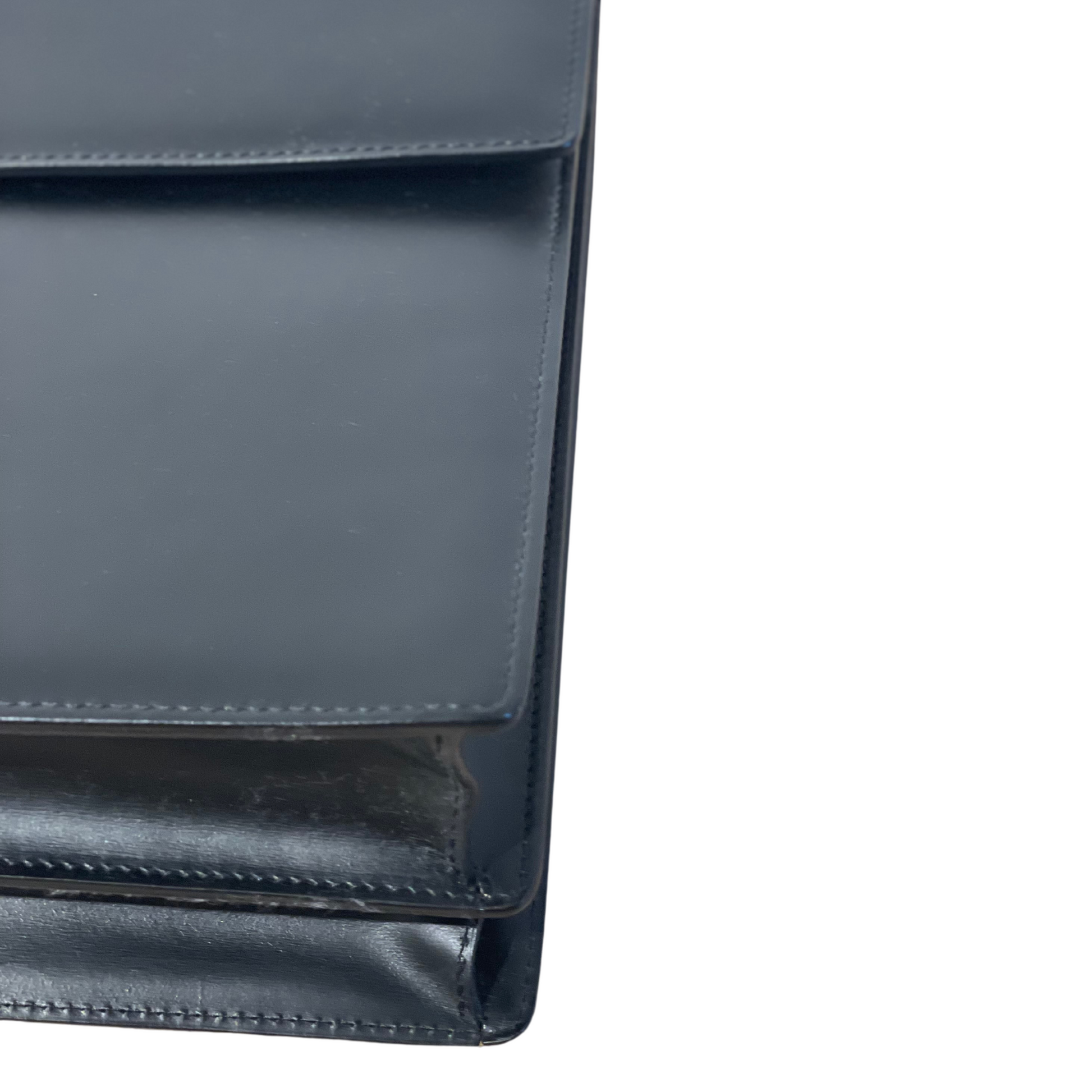 Cartella da lavoro di Cartier in pelle di vitello liscia nera. Hardware argentato. Patta frontale, apertura a pressione. Logo stampato Interno in pelle e tessuto nero logato suddiviso in due scomparti. Tasche piatte e tasca con cerniera. Manico singolo.