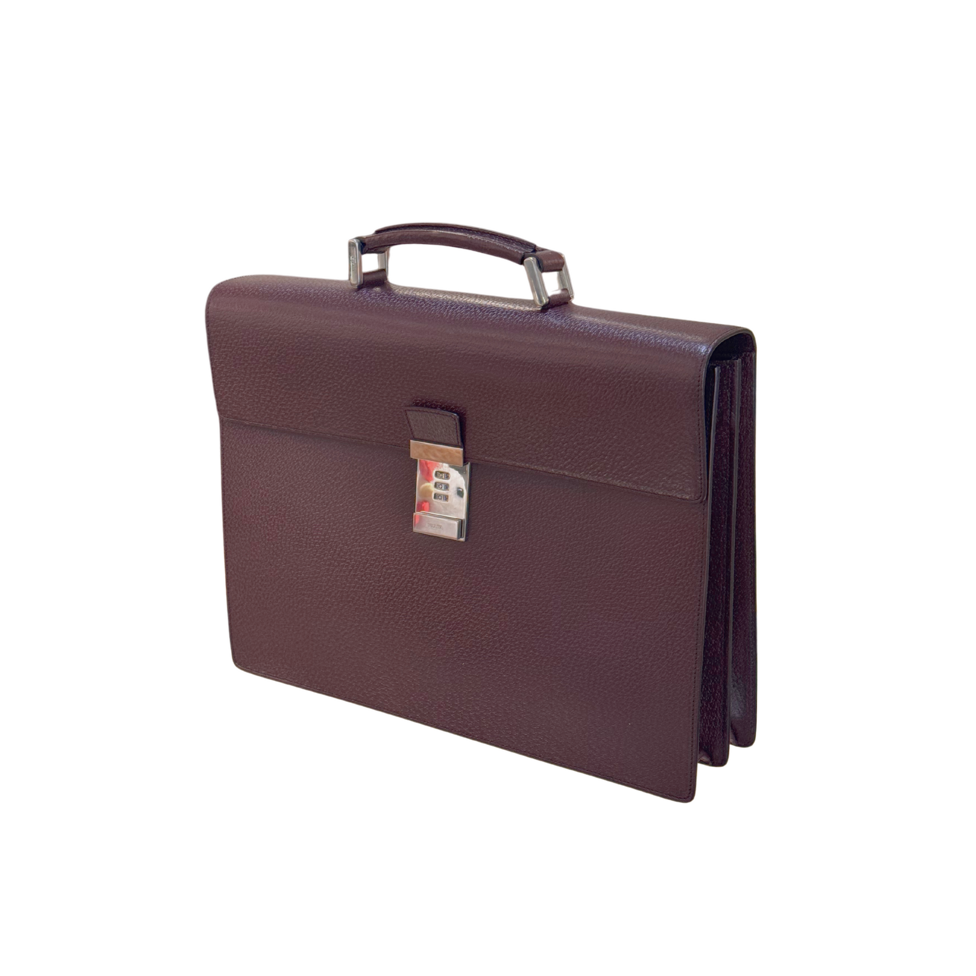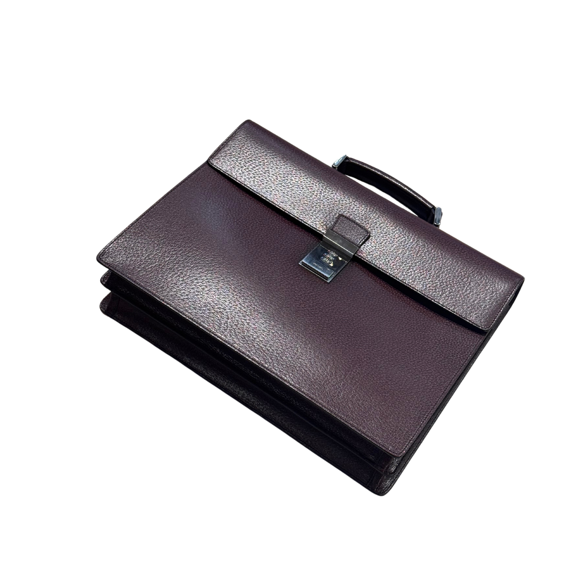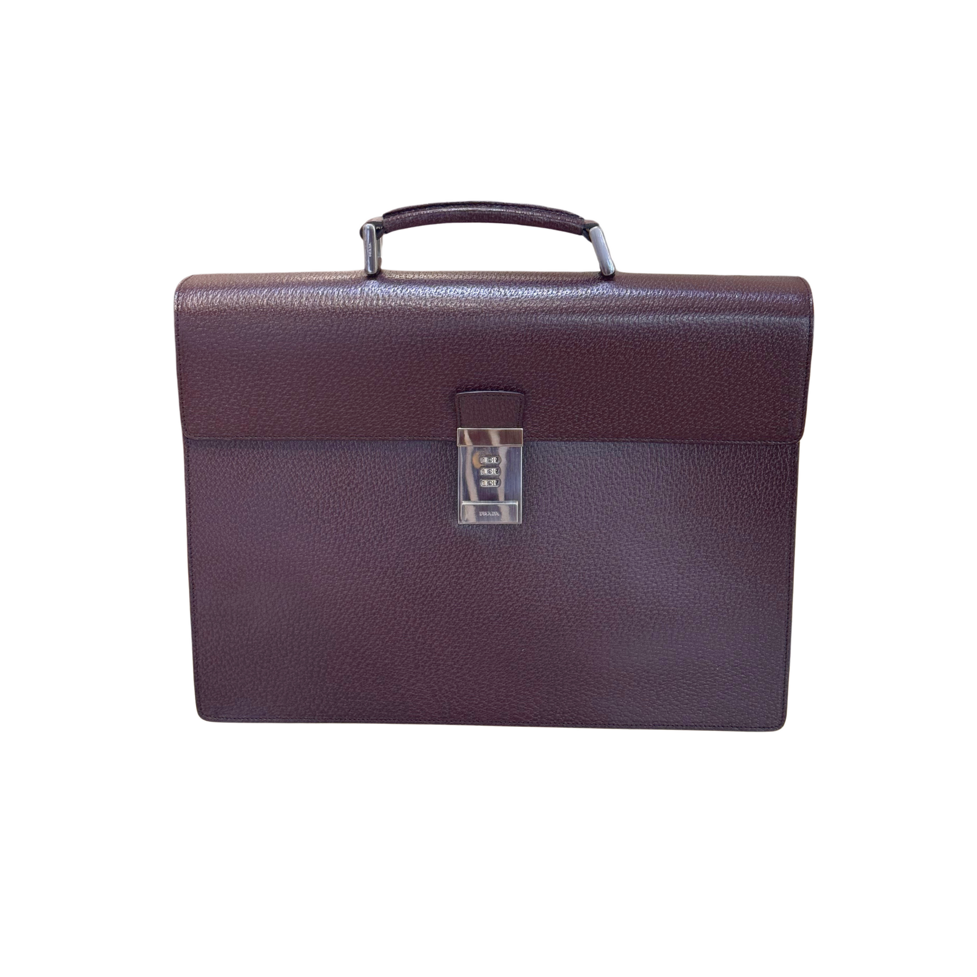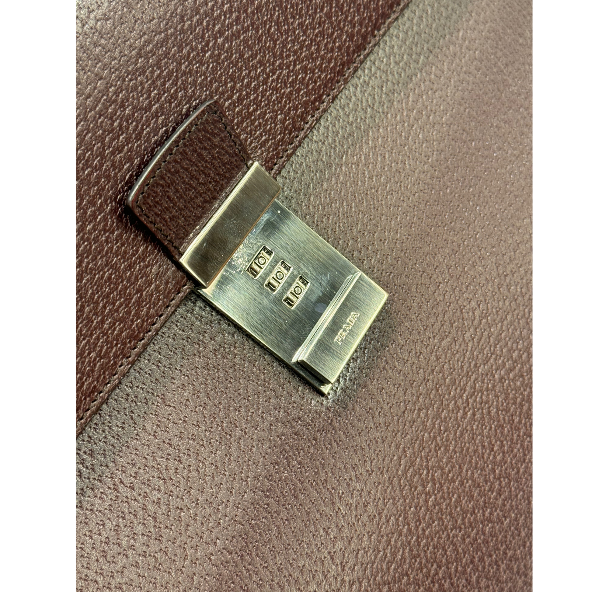 Cartella di Prada in pelle martellata marrone. Manico superiore in pelle. Apertura con hardware e combinazione in metallo argentato. Interno in pelle suddiviso in due scomparti . Portapenne e portacellulare interno.
