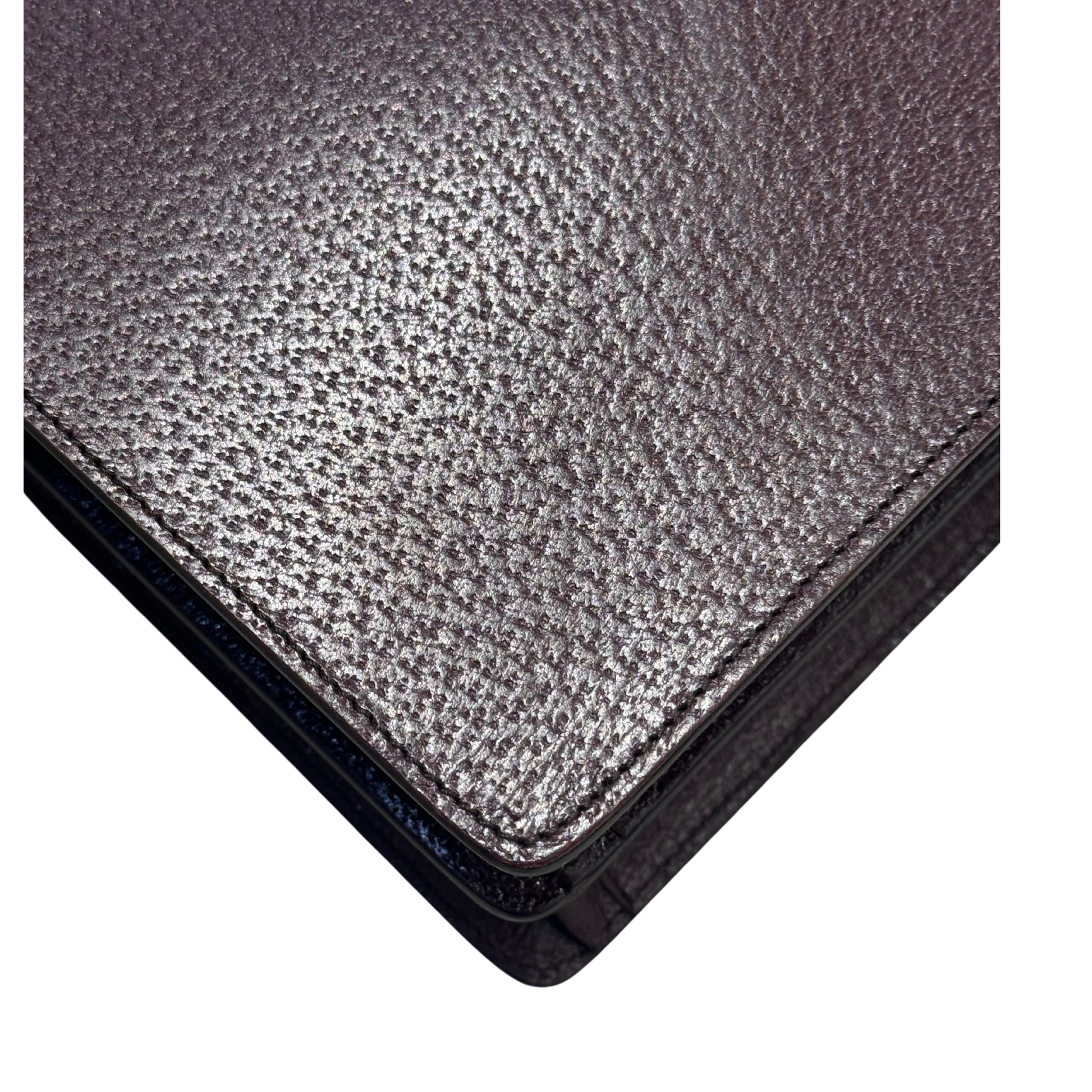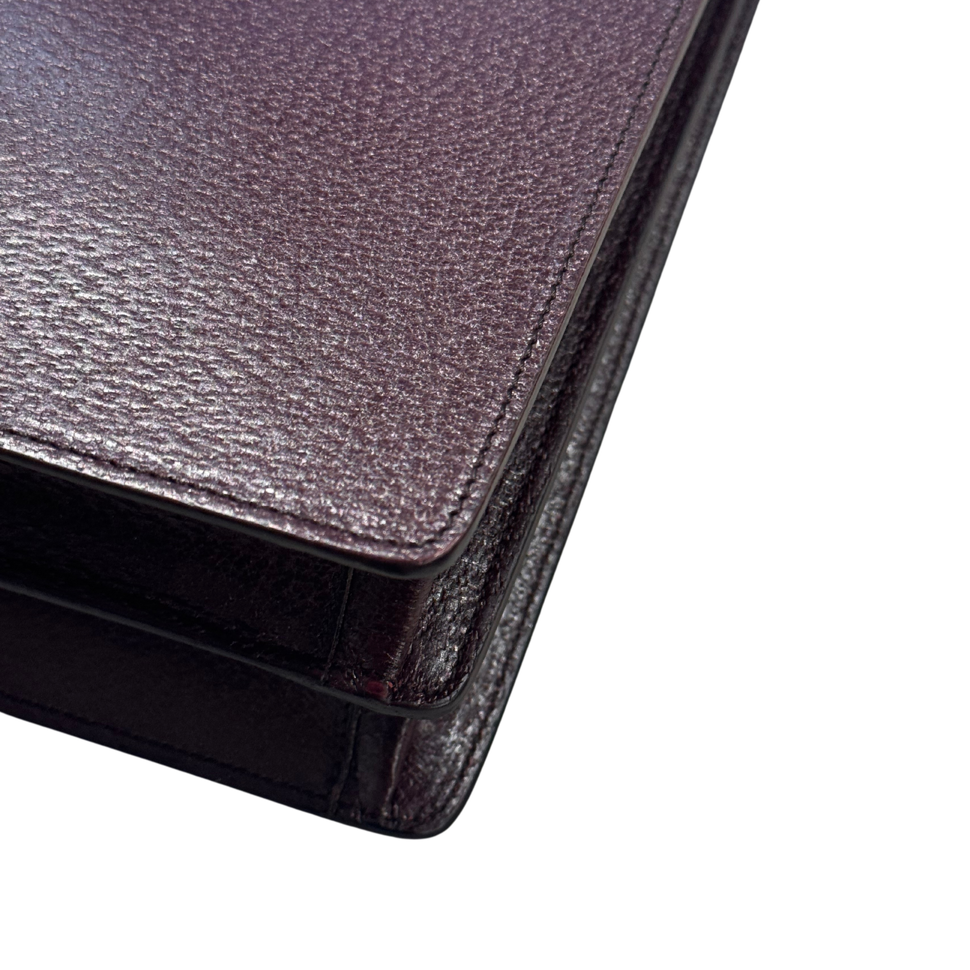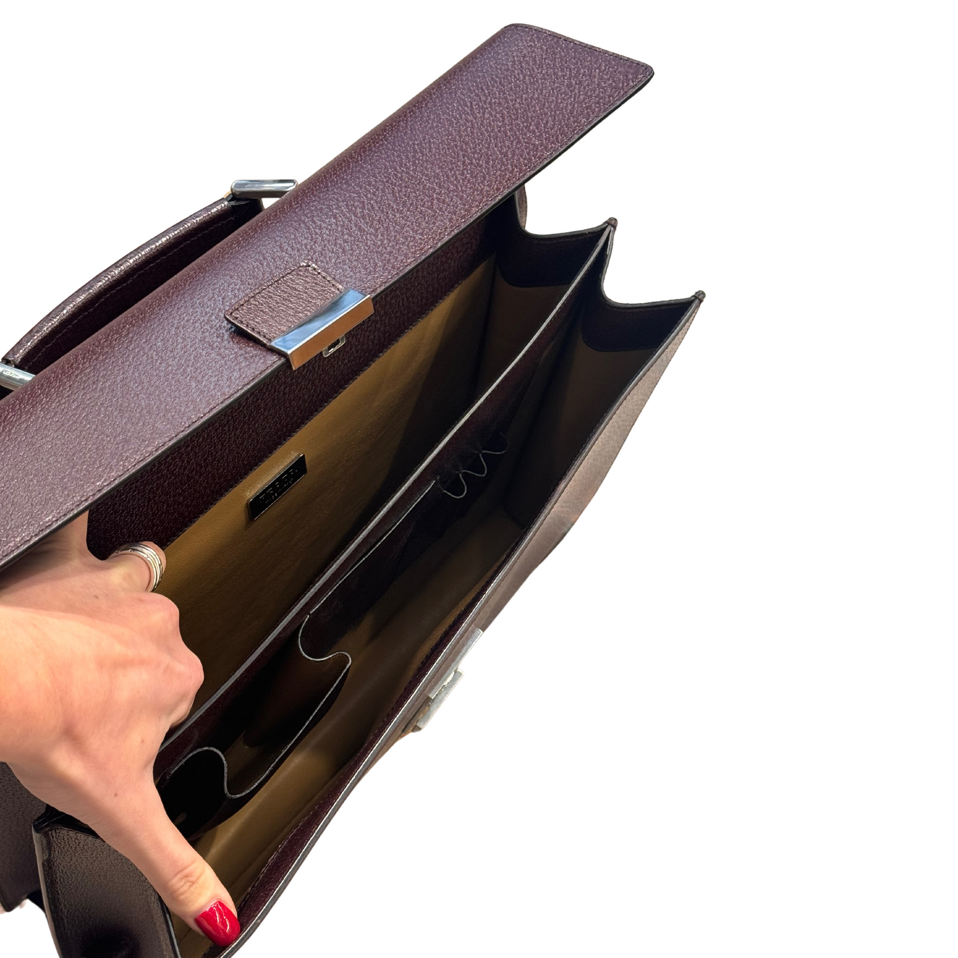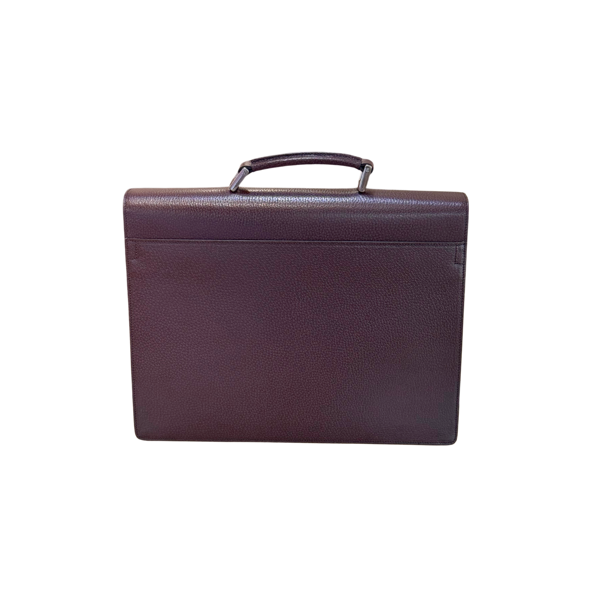 Cartella di Prada in pelle martellata marrone. Manico superiore in pelle. Apertura con hardware e combinazione in metallo argentato. Interno in pelle suddiviso in due scomparti . Portapenne e portacellulare interno.