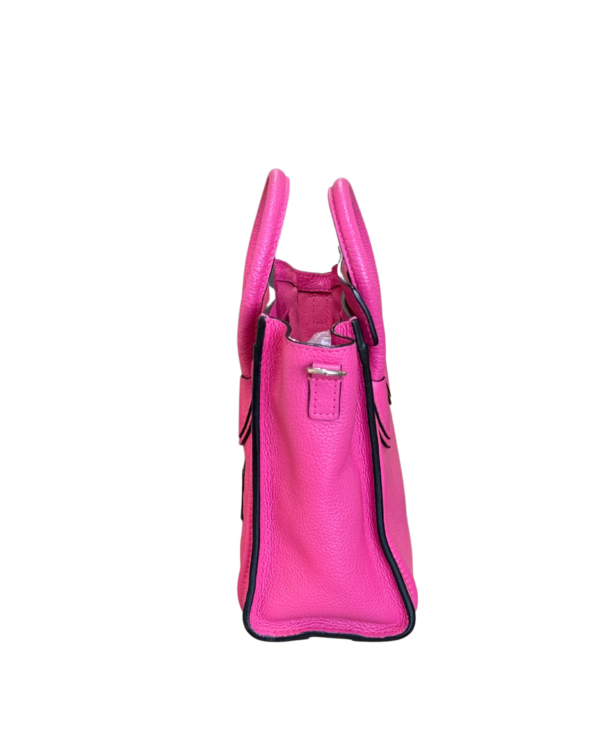 Celine Luggage small realizzata in pelle martellata fucsia. Piccola tasca frontale con cerniera. Doppi manici in pelle nera e tracolla amovibile per indossarla crossbody. Apertura superiore con cerniera. Interno pelle scamosciata tono su tono.