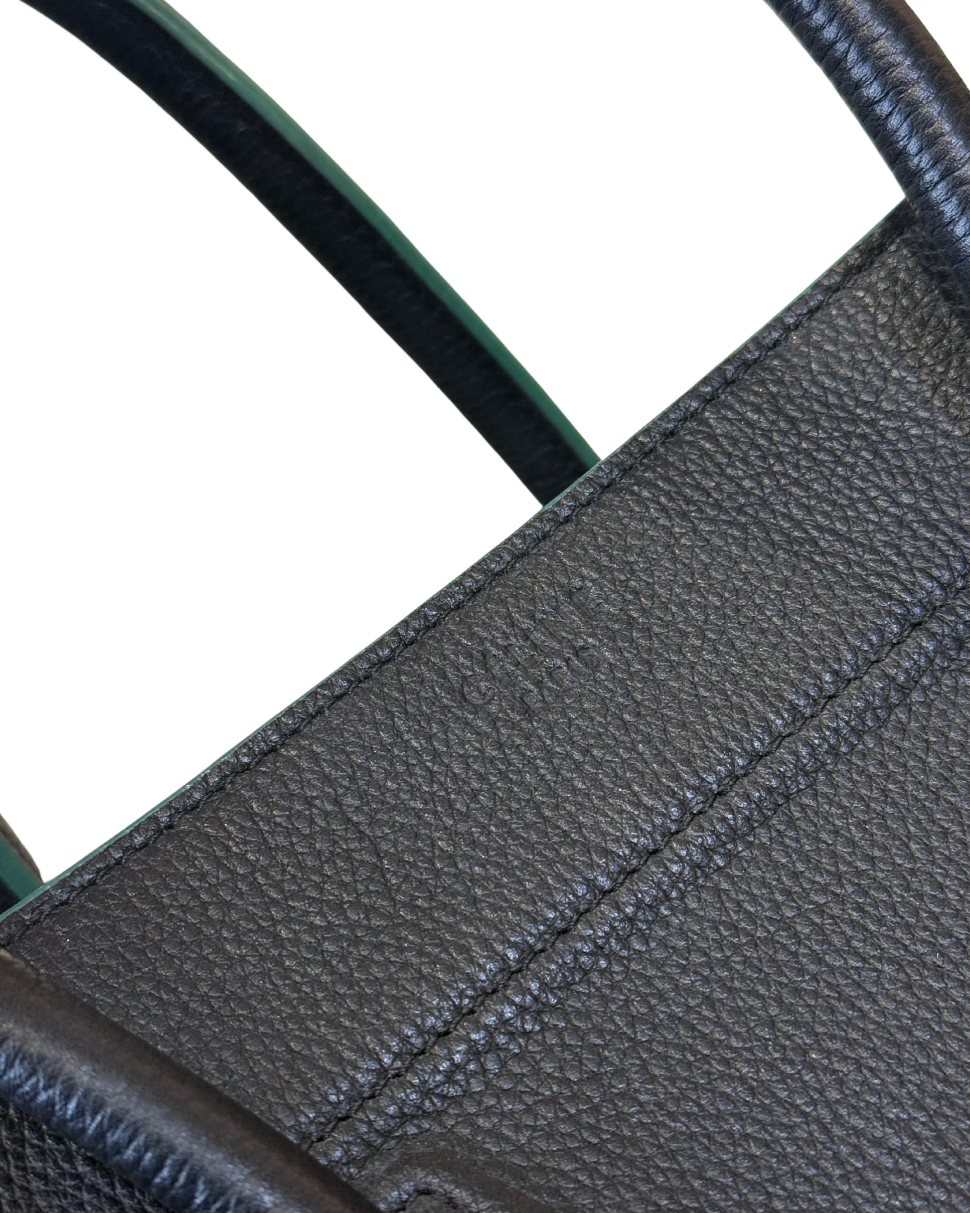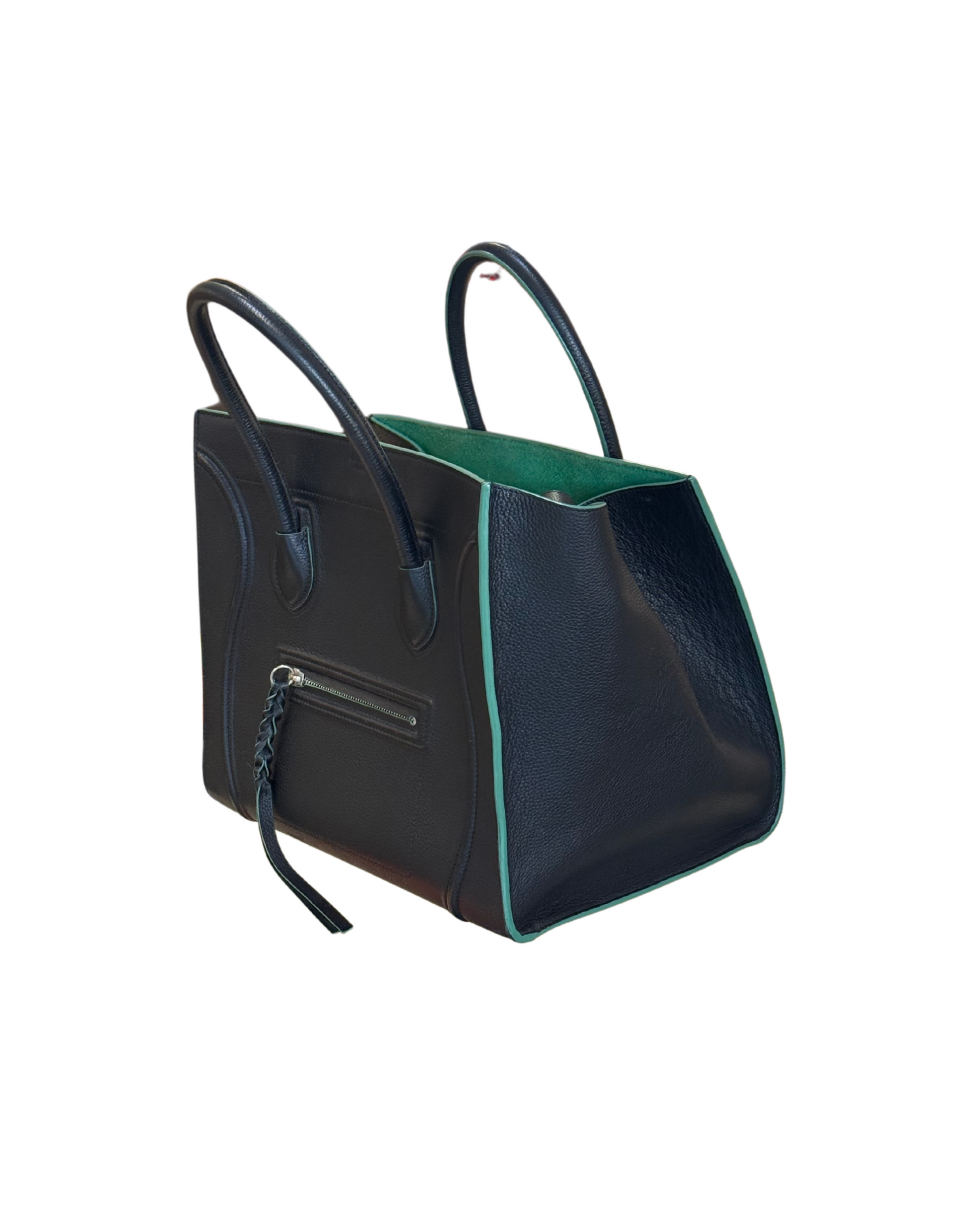 Borsa Celine Luggage grande realizzata in pelle martellata nera , logo frontale impresso. Doppi manici in pelle arrotolata. Interno in pelle scamosciata verde. Laccio per diminuirne le dimensioni: