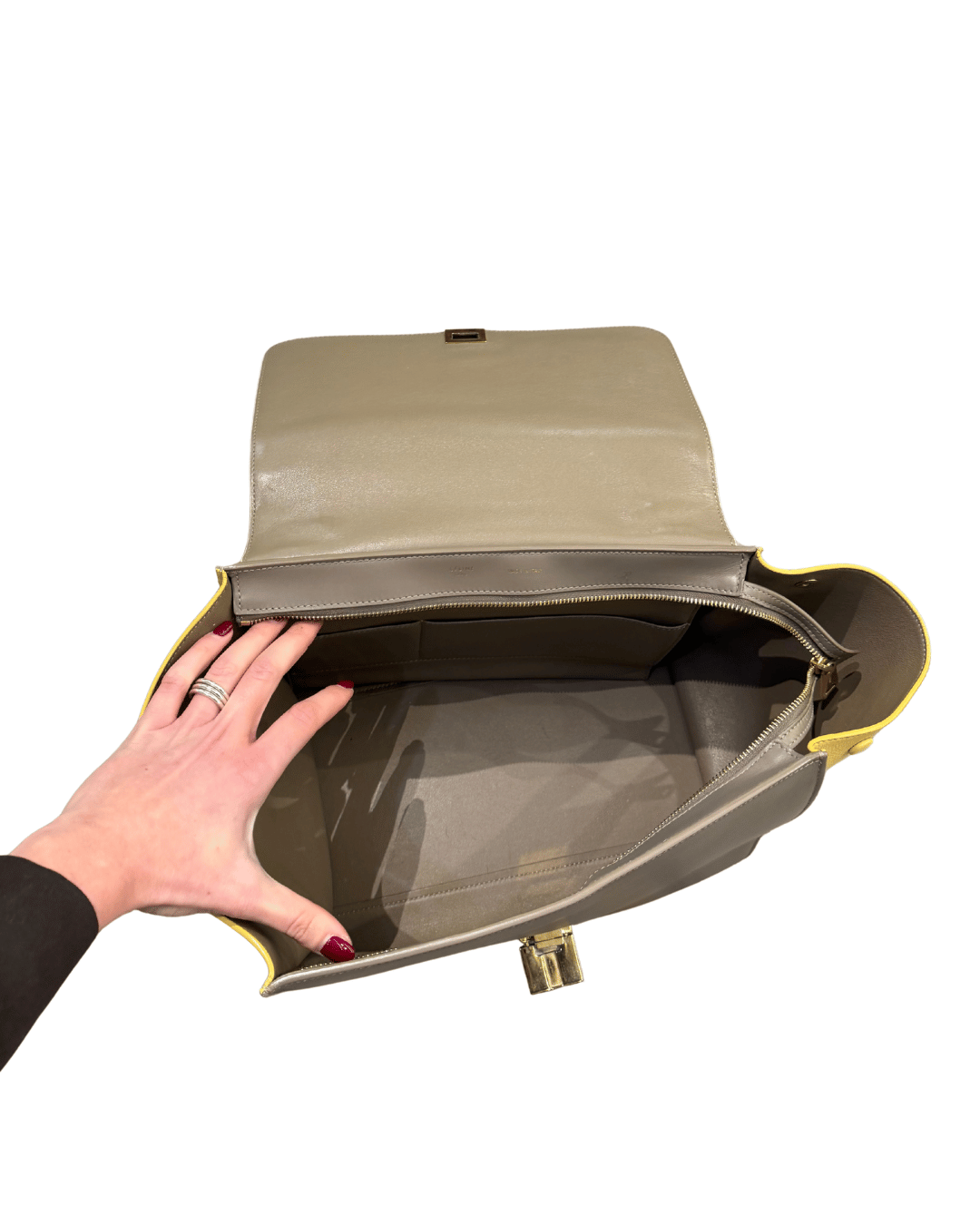Iconica e sofisticata, questa Céline Trapeze unisce tre tonalità delicate – bianco panna, grigio tortora e giallo pastello – in un equilibrio perfetto tra minimalismo francese e carattere contemporaneo. Realizzata in pelle liscia, mantiene la struttura pulita e geometrica tipica del modello, con le classiche “ali” laterali che donano volume e un tocco subito riconoscibile. La chiusura a scatto in metallo dorato, firmata Céline, aggiunge un accento elegante e senza tempo. All’interno offre un ampio scomparto foderato, una tasca con zip e tutta la praticità di una borsa da giorno ideale per lavoro, quotidianità o viaggi. Sul retro, una comoda tasca esterna con zip.