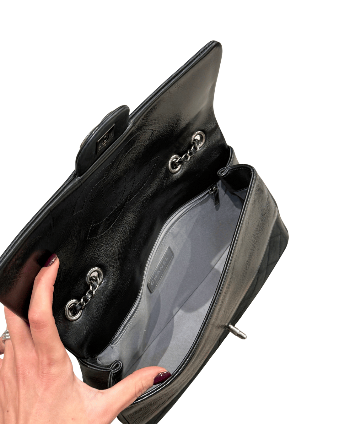 Un modello iconico e intramontabile firmato Chanel, realizzato in morbida pelle di agnello nera con la classica impuntura matelassé, simbolo per eccellenza della Maison. A renderla ancora più particolare è il contrasto tra le texture: la patta e i pannelli principali presentano una pelle vellutata al tatto, mentre i bordi e il fondo hanno una finitura leggermente più lucida e strutturata, che crea un effetto sofisticato e tridimensionale. La chiusura con logo CC intrecciato in metallo argentato anticato e la tracolla a catena scorrevole intrecciata in pelle aggiungono il tocco inconfondibile di eleganza Chanel, rendendola perfetta sia per un look da giorno ricercato che per la sera. L’interno, rivestito in tessuto grigio chiaro, è organizzato con una tasca piatta e una con zip, ideale per custodire i propri essenziali con ordine. (codice: 20502130 , ANNO 2014-2015)