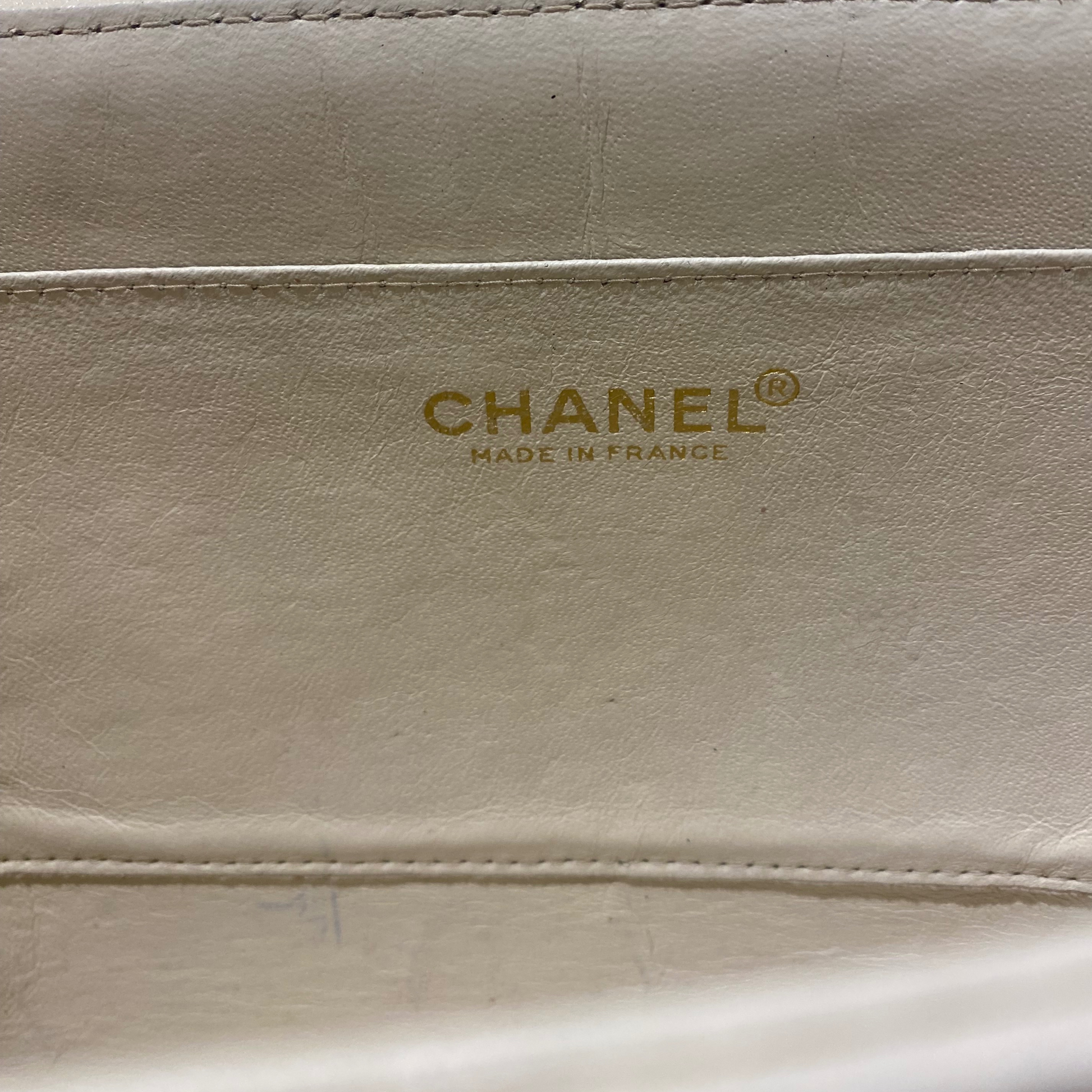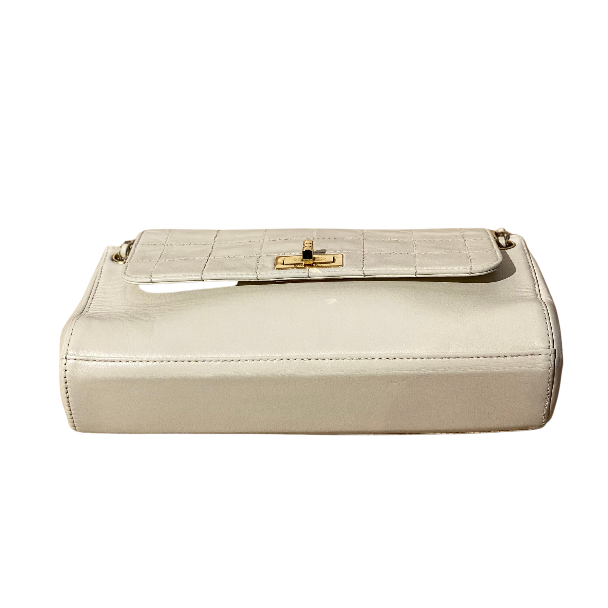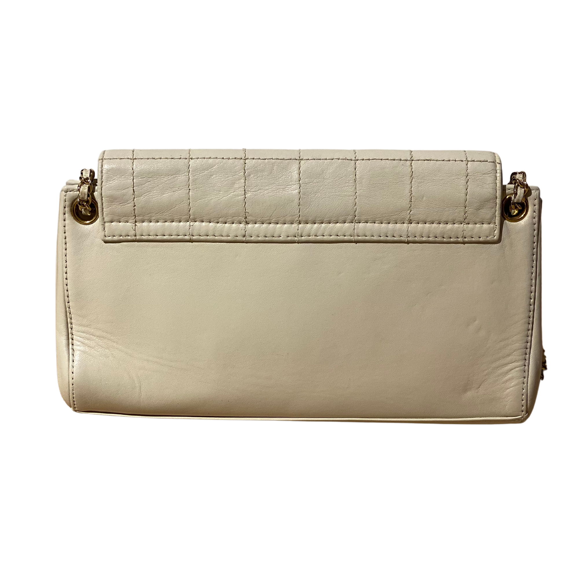 Chanel in pelle di agnello color crema anno 2002/2003. Chiusura a girello con placca rettangolare dorata, logo inciso. Corpo in pelle liscia, patta con trama quadrata. Doppia catena con pelle. Interno in pelle, tasca piatta.