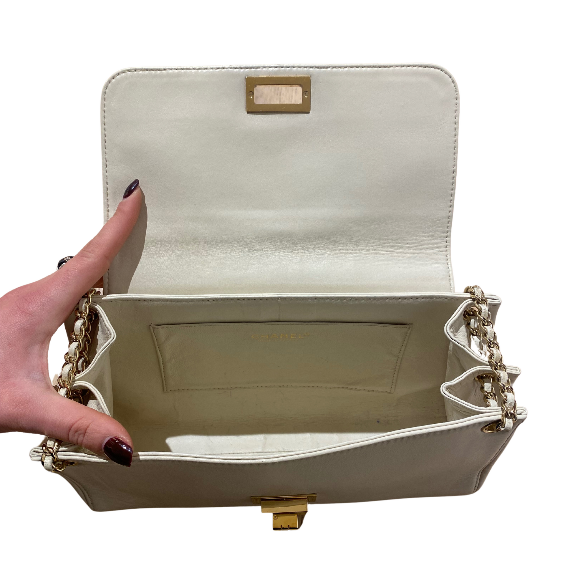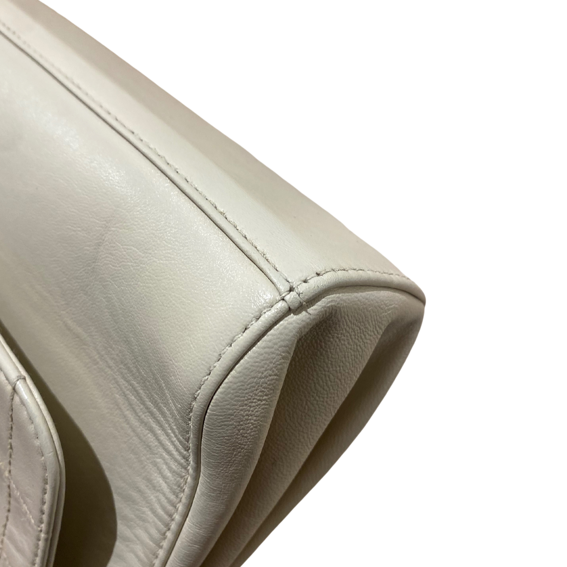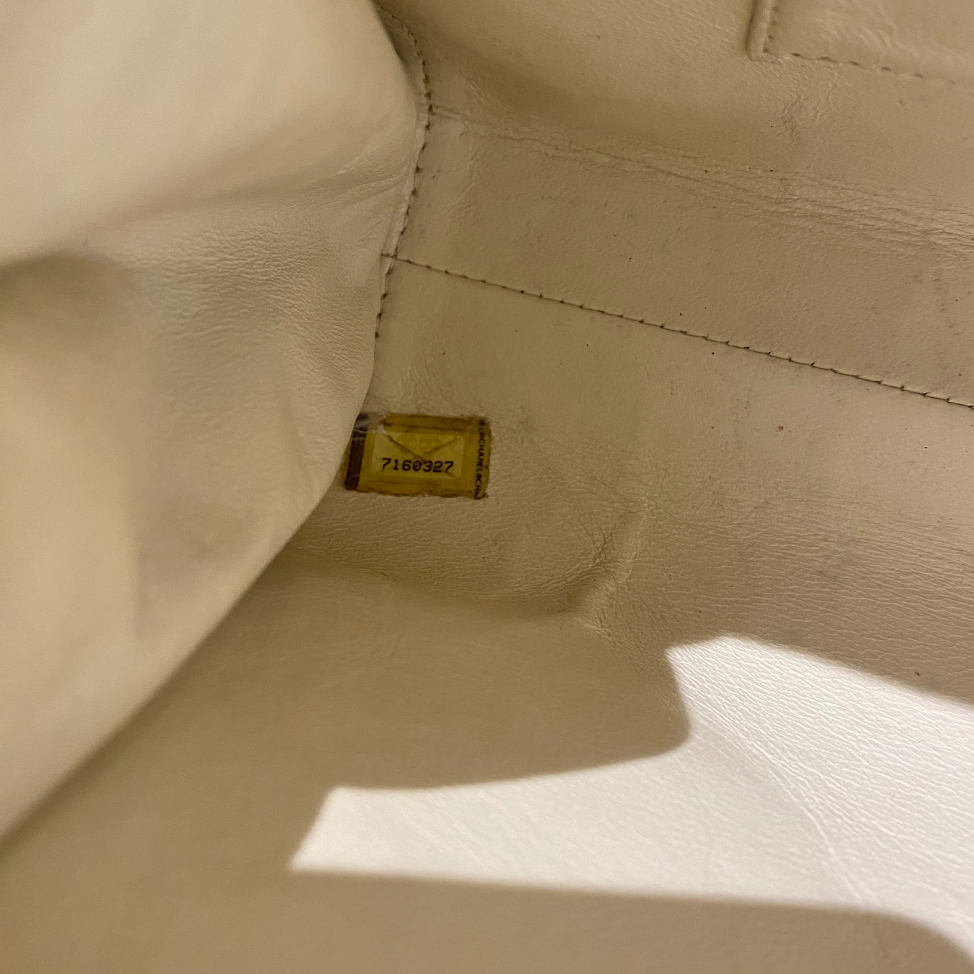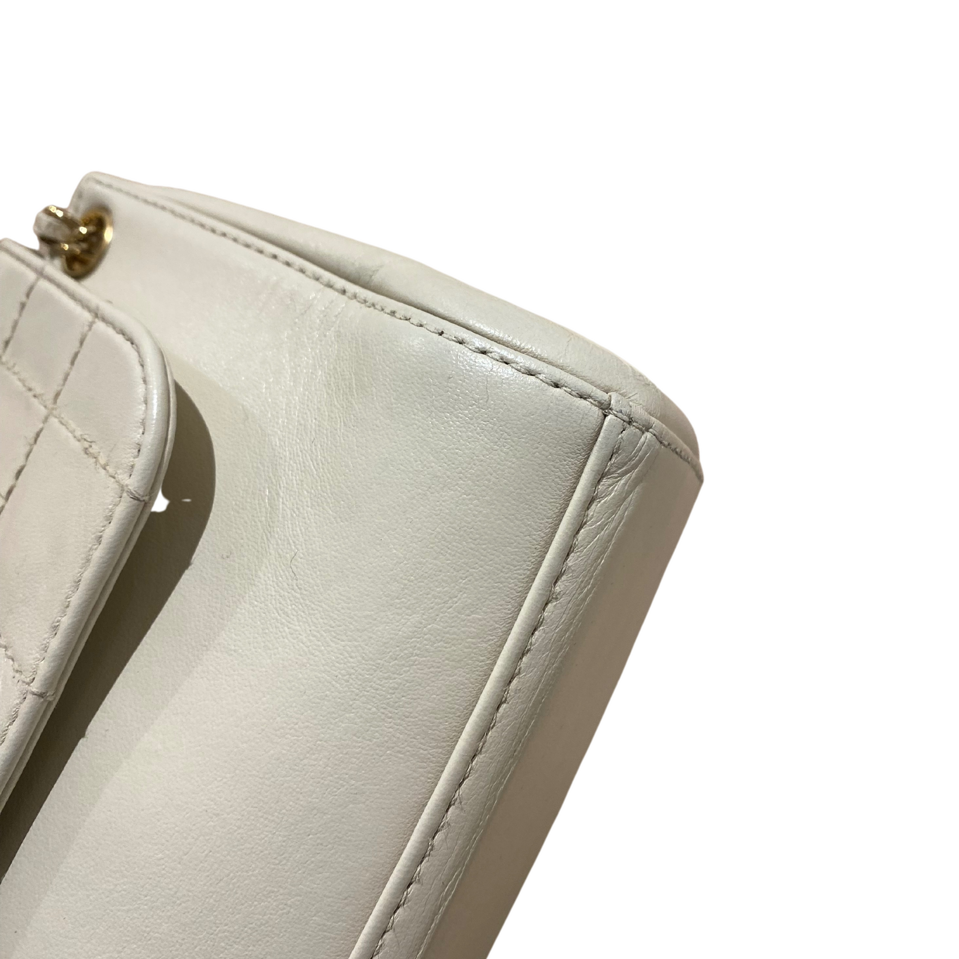 Chanel in pelle di agnello color crema anno 2002/2003. Chiusura a girello con placca rettangolare dorata, logo inciso. Corpo in pelle liscia, patta con trama quadrata. Doppia catena con pelle. Interno in pelle, tasca piatta.