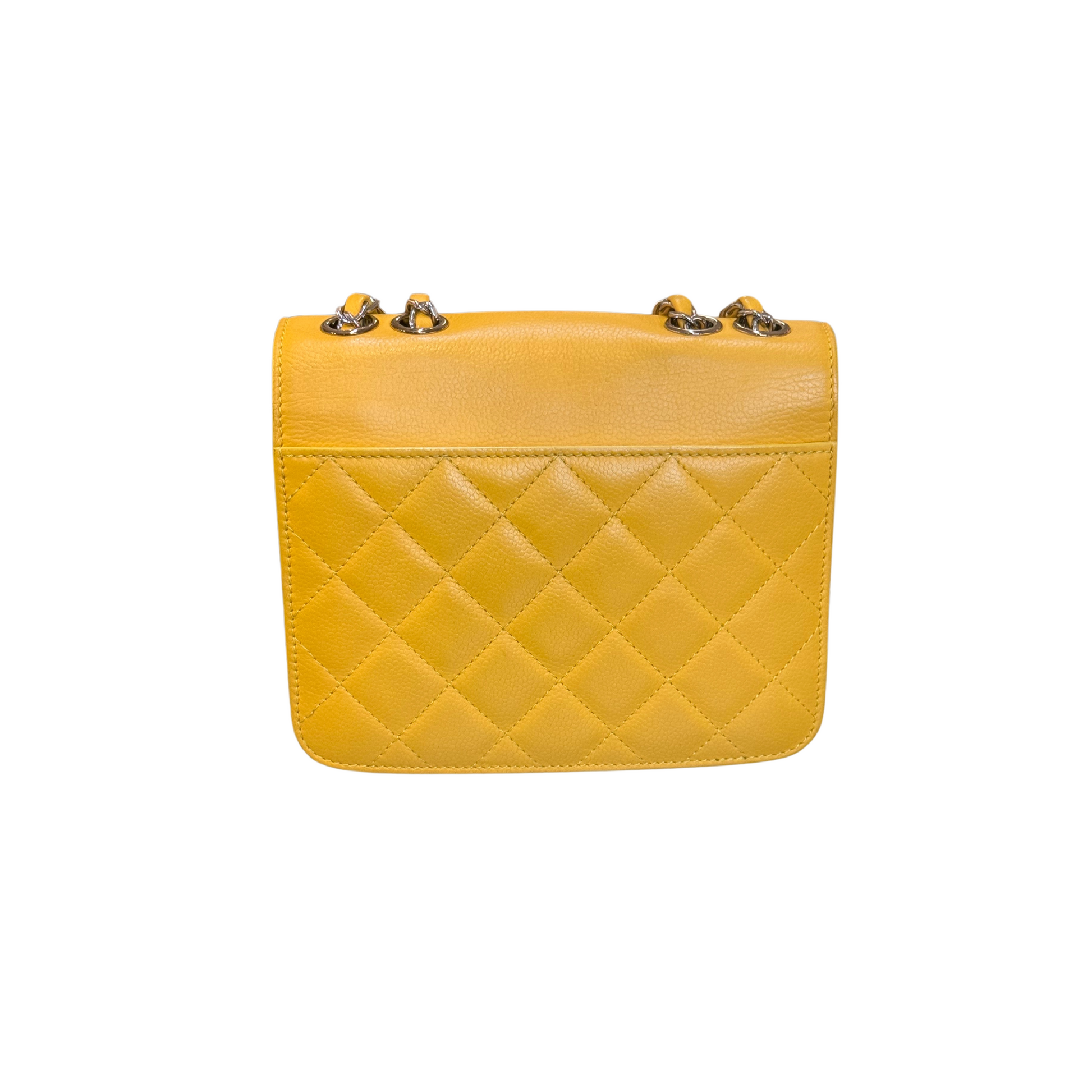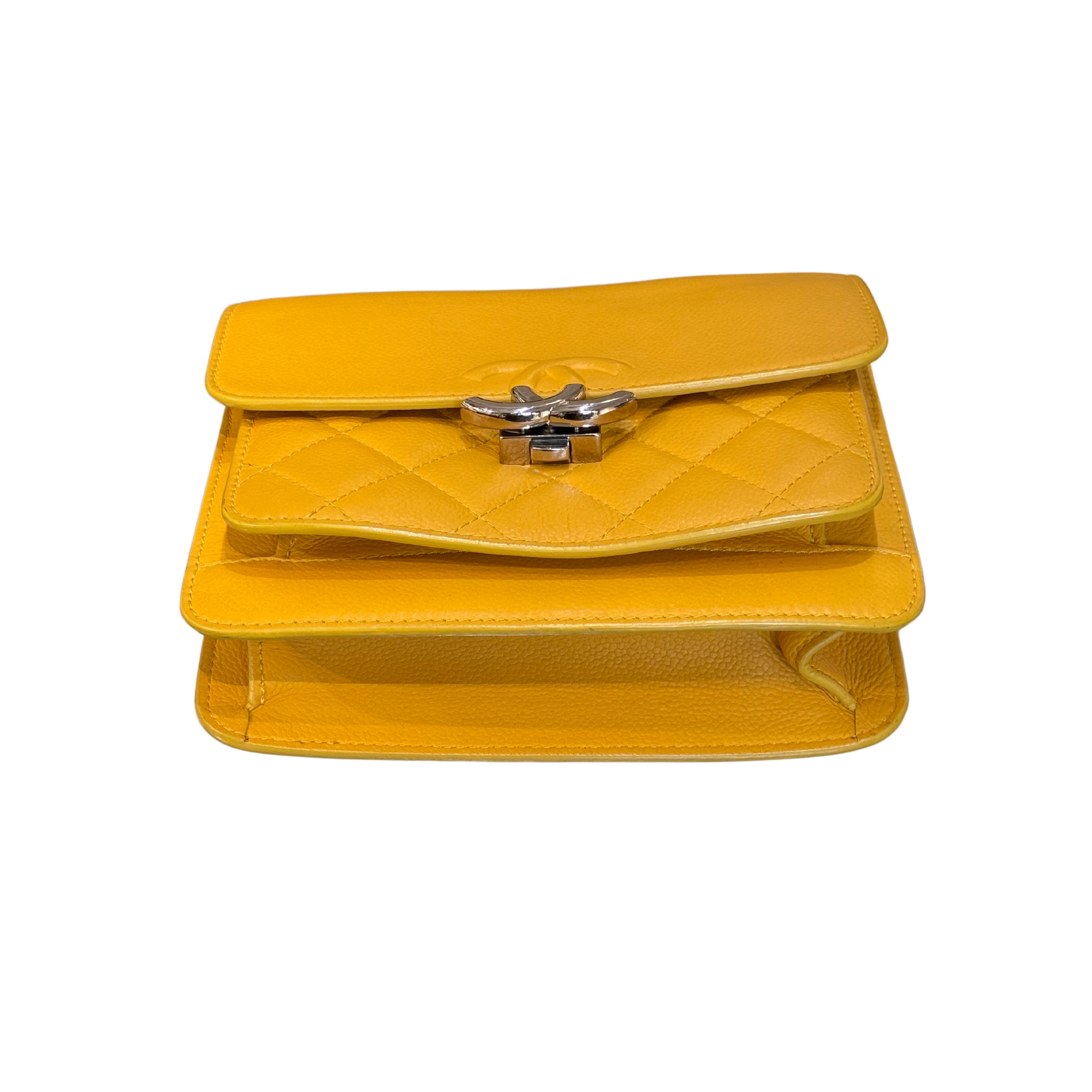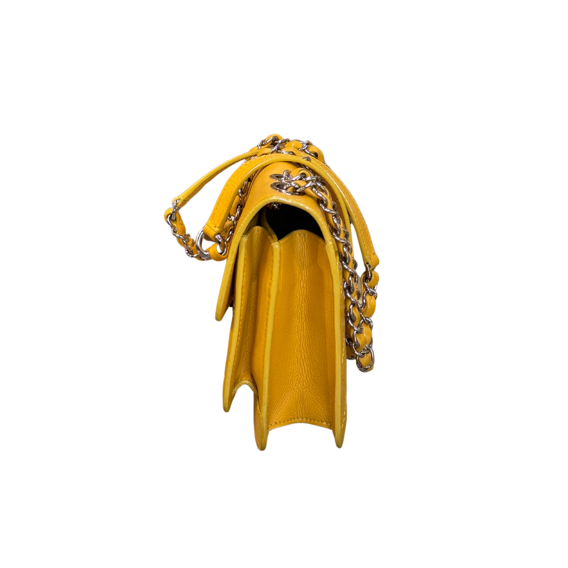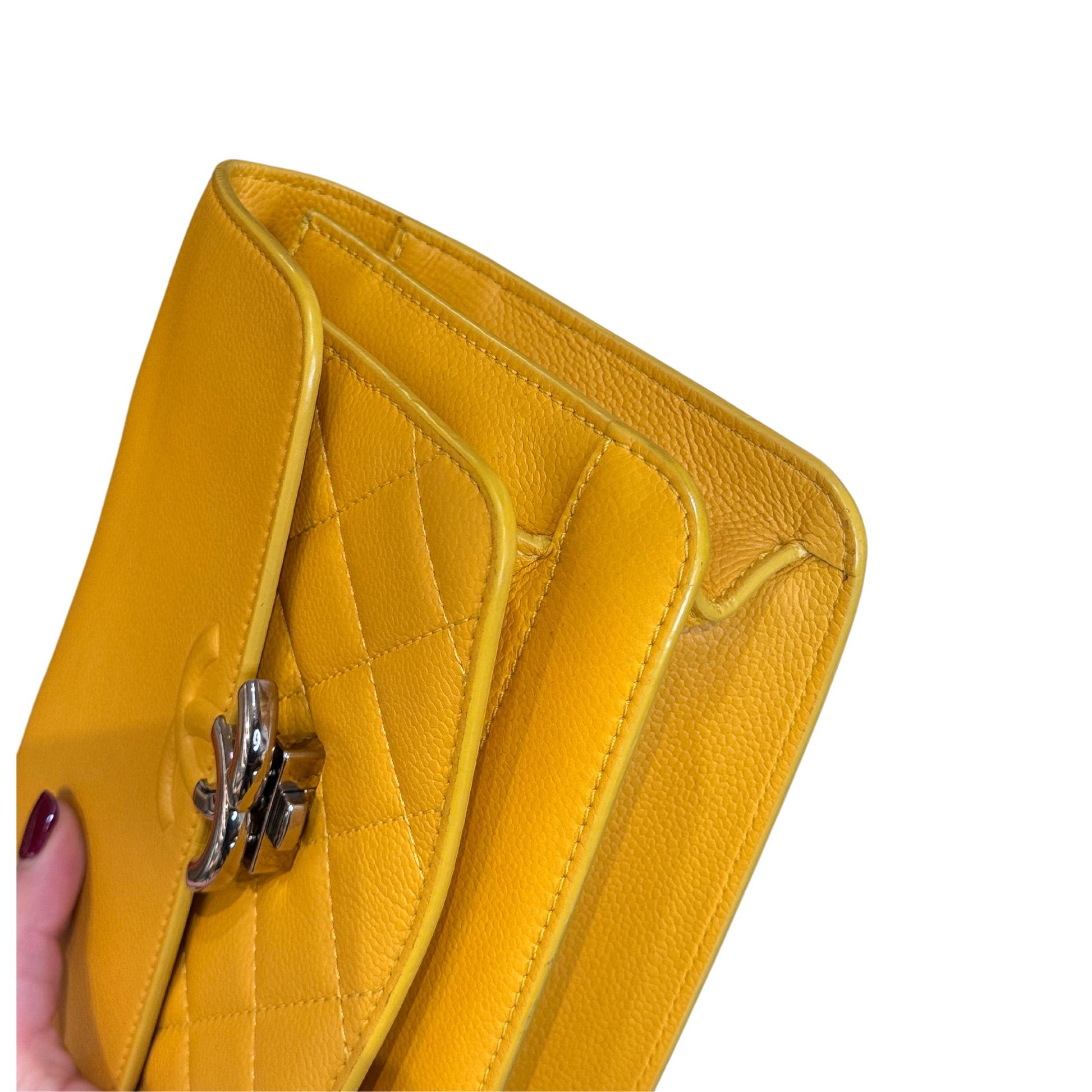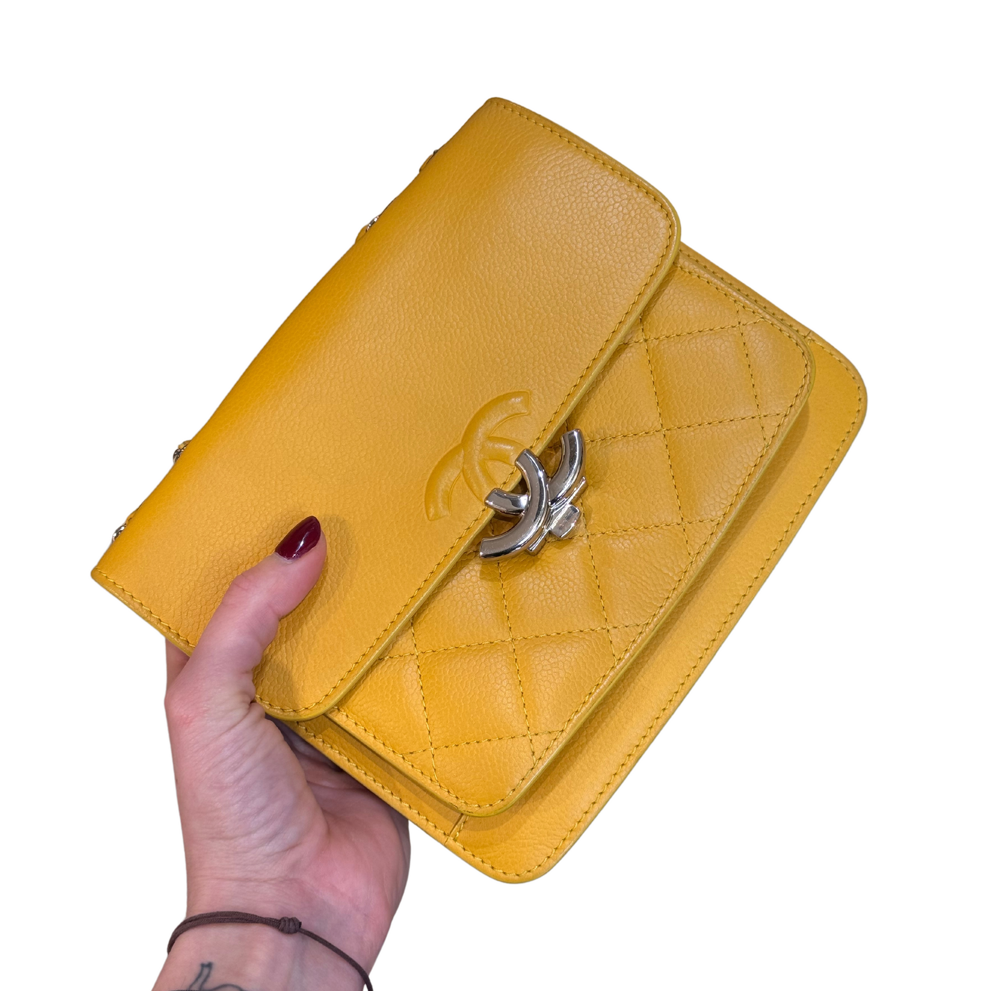 Meravigliosa Chanel realizzata in pelle gialla/ocra . Realizzata in trama a rombi la parte inferiore e la patta in pelle semplice. Hardware frontale CC metà in pelle e metà in metallo argentato. Apertura a pressione. Tracolla a catena scorrevole e poggia spalla in pelle, si può indossare sia a spalla sia a tracolla. Interno in tessuto tono su tono suddiviso in due scomparti. (codice: 23983401)