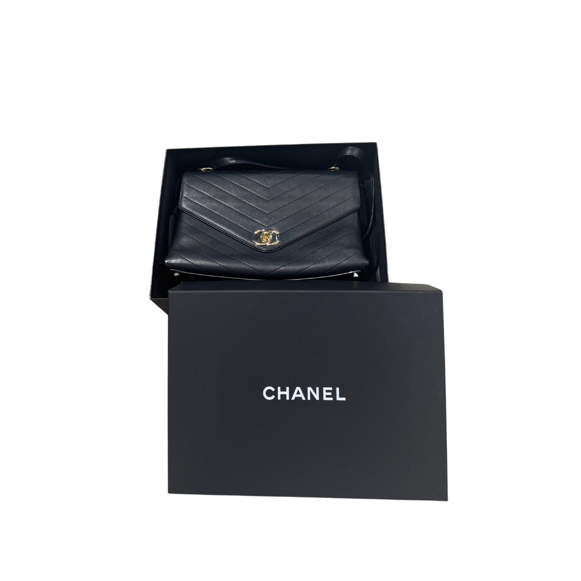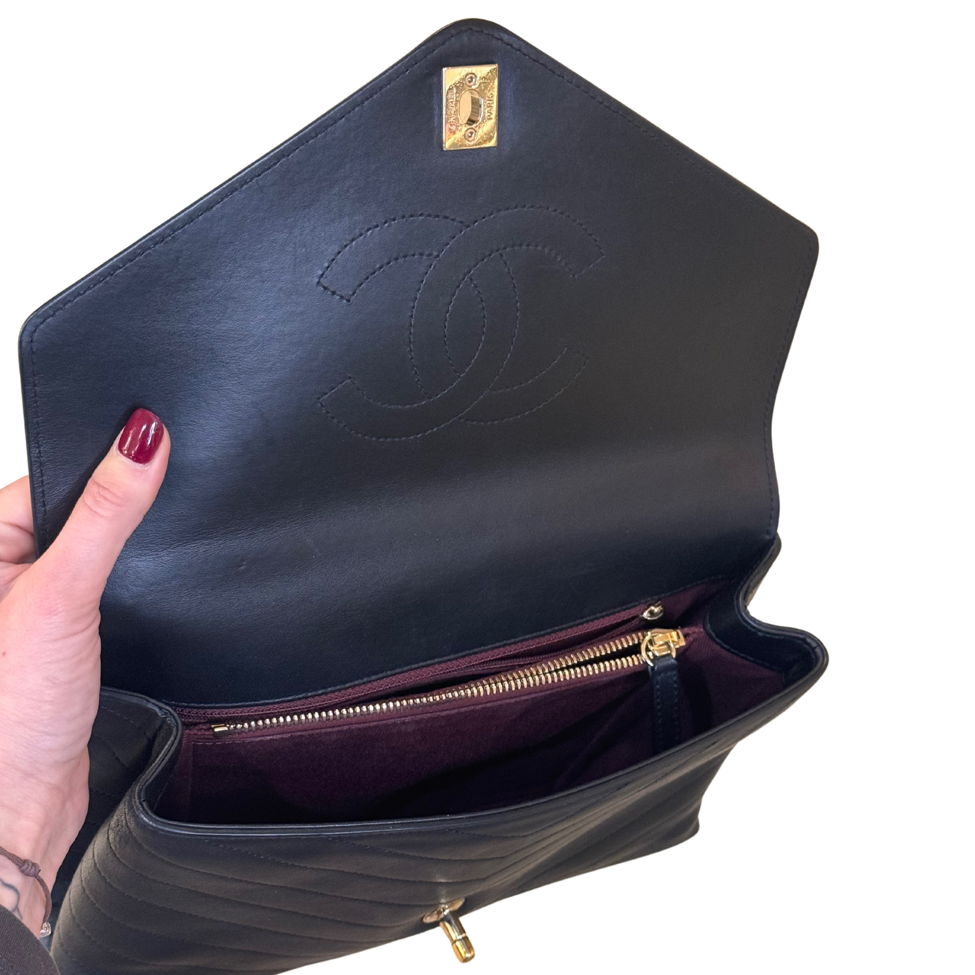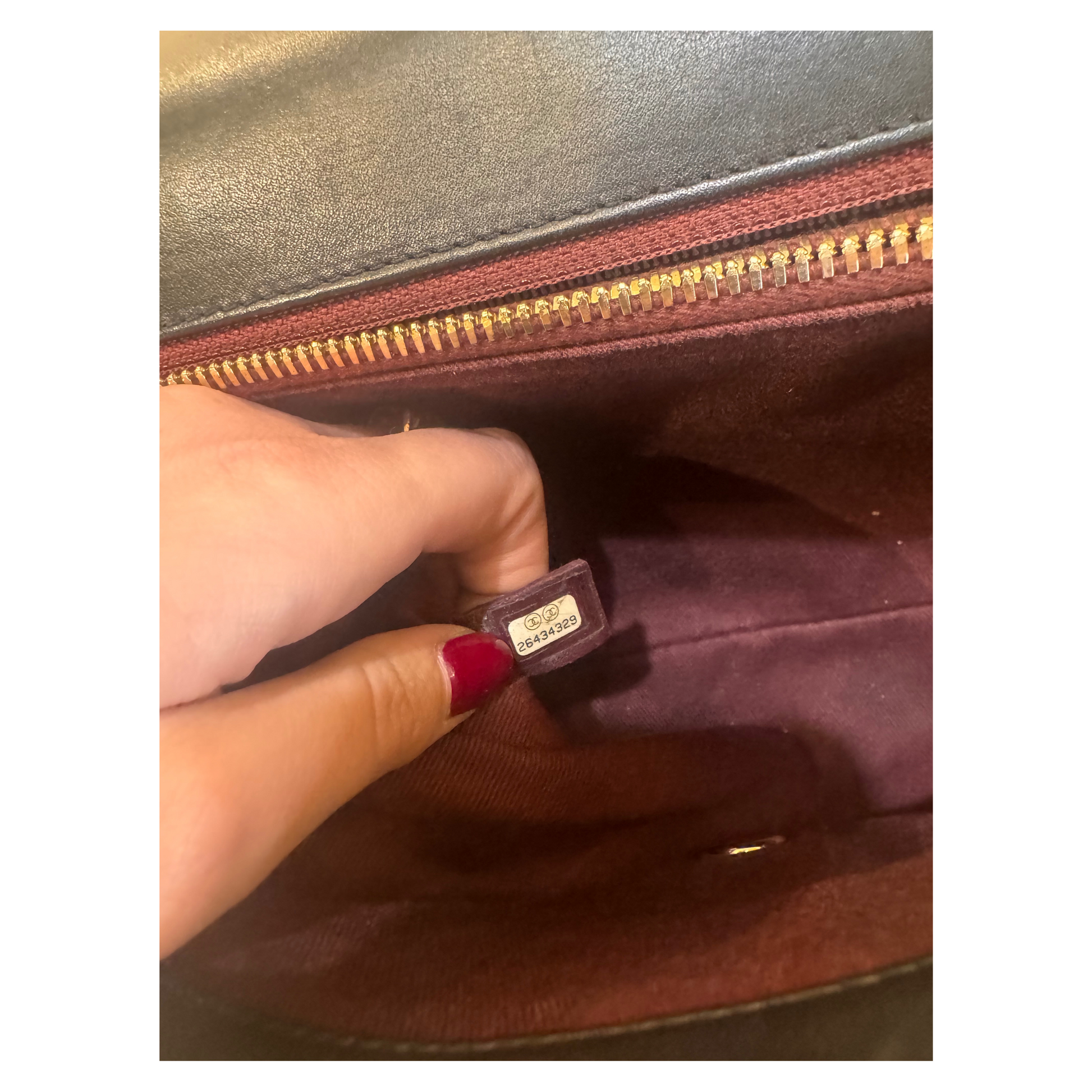 Borsa Chanel Realizzata in morbida pelle di agnello nera, cuciture oblique che vanno a formare una V. Logo frontale CC in metallo argentato. Manico superiore a catena che consente di indossarla a mano e tracolla a catena con poggia spalla in pelle per indossarla a tracolla. Interno in tessuto bordeaux, diviso in due scomparti da una tasca con cerniera. (codice: 26434329. Anno 2017)