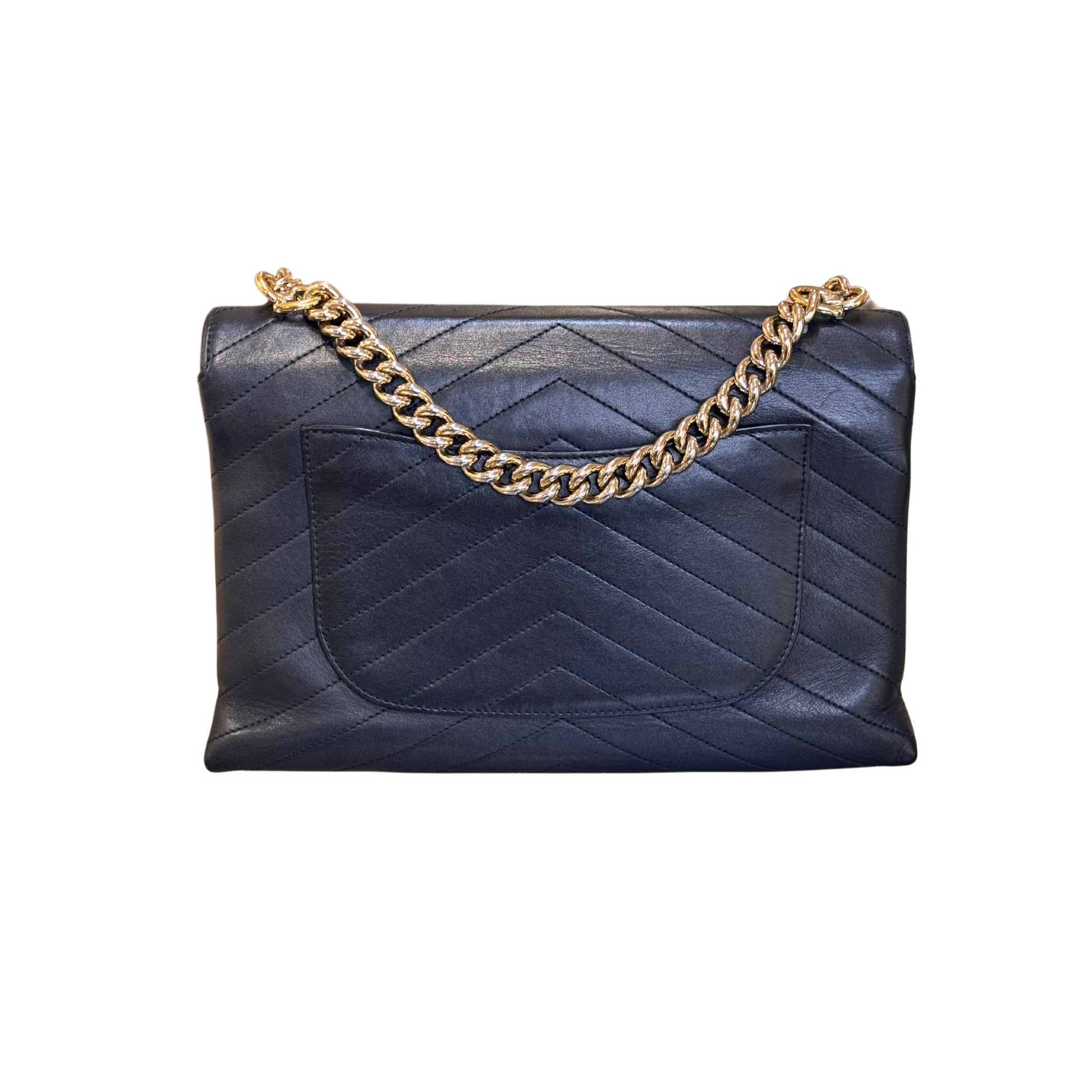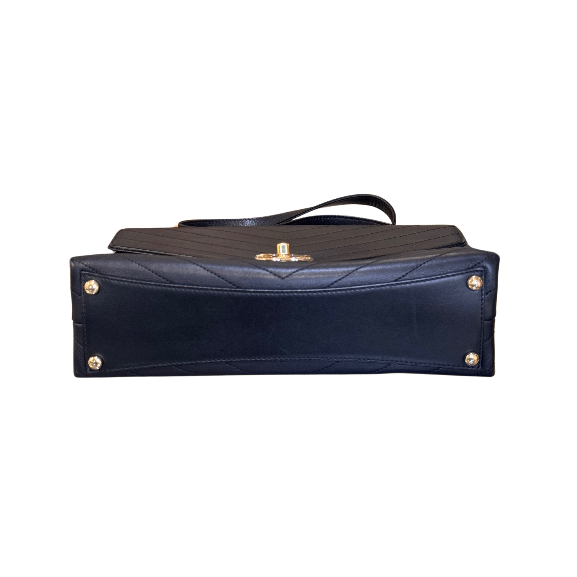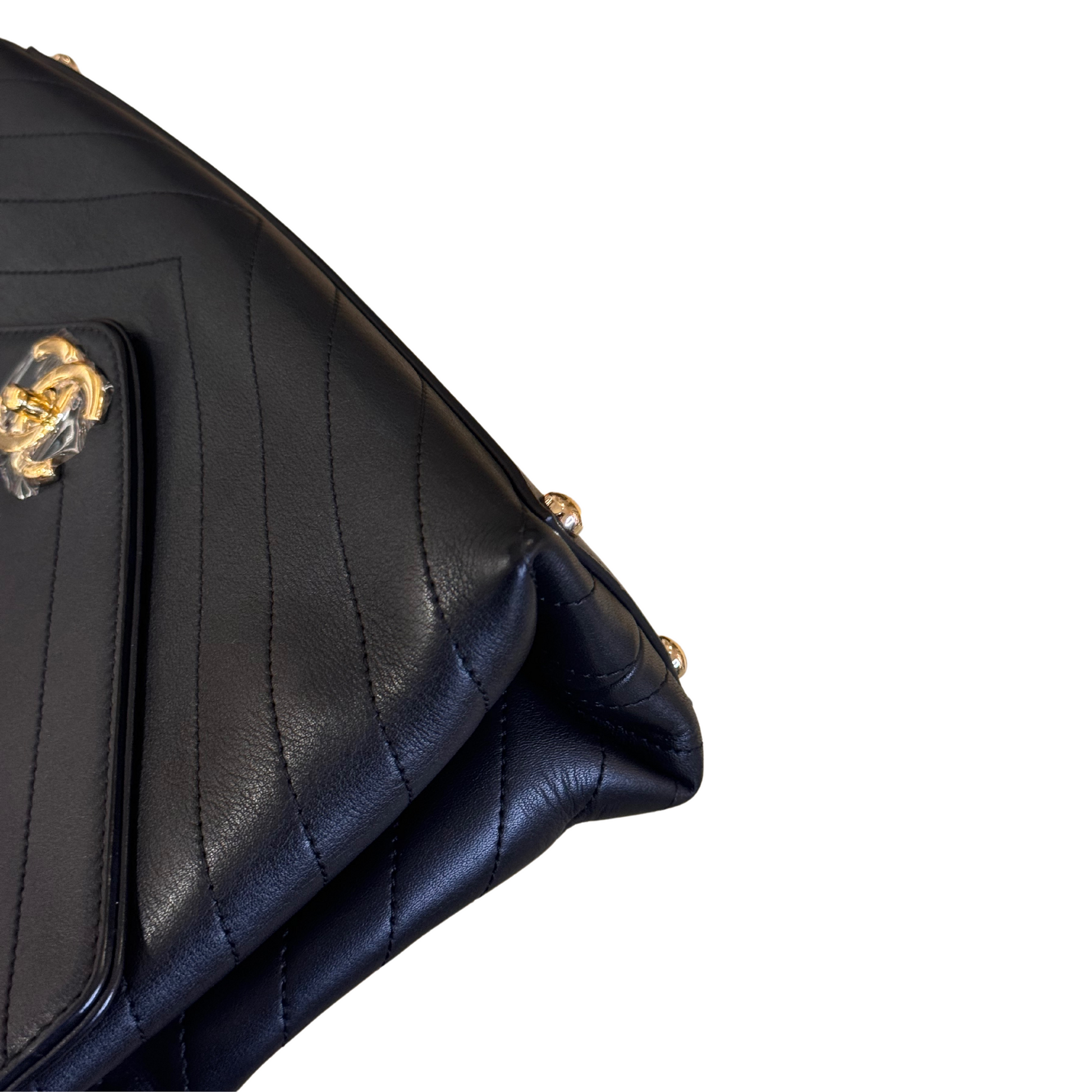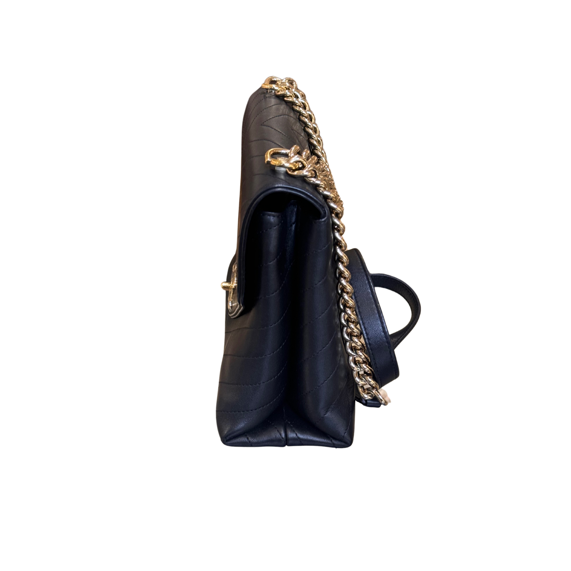 Borsa Chanel Realizzata in morbida pelle di agnello nera, cuciture oblique che vanno a formare una V. Logo frontale CC in metallo argentato. Manico superiore a catena che consente di indossarla a mano e tracolla a catena con poggia spalla in pelle per indossarla a tracolla. Interno in tessuto bordeaux, diviso in due scomparti da una tasca con cerniera. (codice: 26434329. Anno 2017)